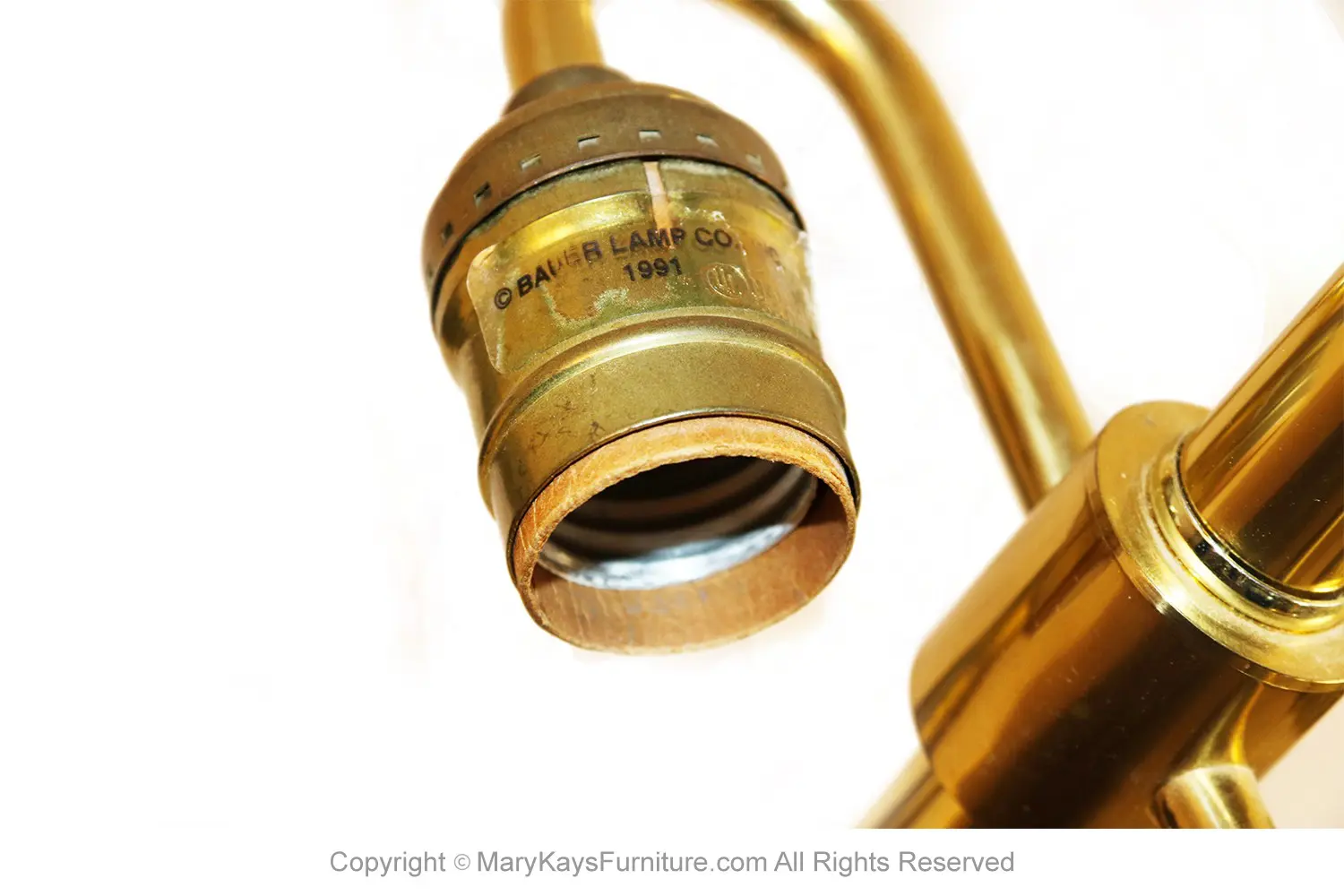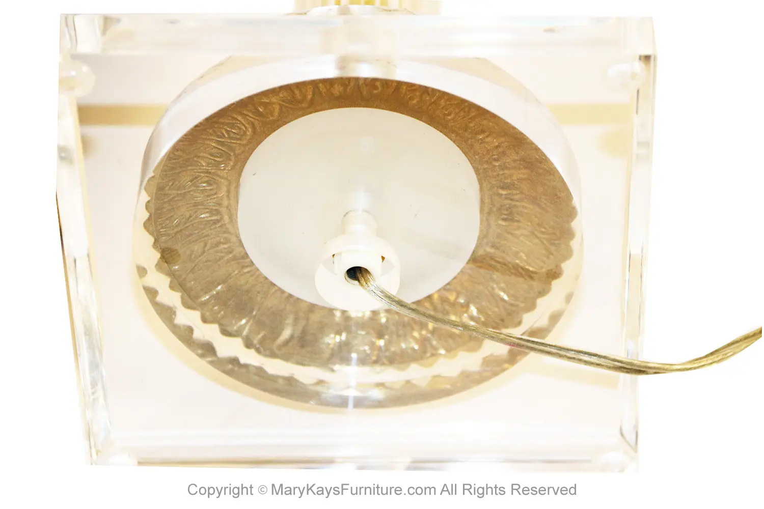 Empire revival lamp by Bauer Lamp Company. A classic empire style Lucite and brass lamp featuring a fluted Lucite column with a brass interior stem, square Lucite base topped with an embossed brass cap. The fluted glass column is capped with an inverted glass cover and a decorative vintage Lucite finial extends above the original black shade (shade is 16″ diameter). The double socket brass stem is tagged with the Bauer Lamp Stamped 1991.