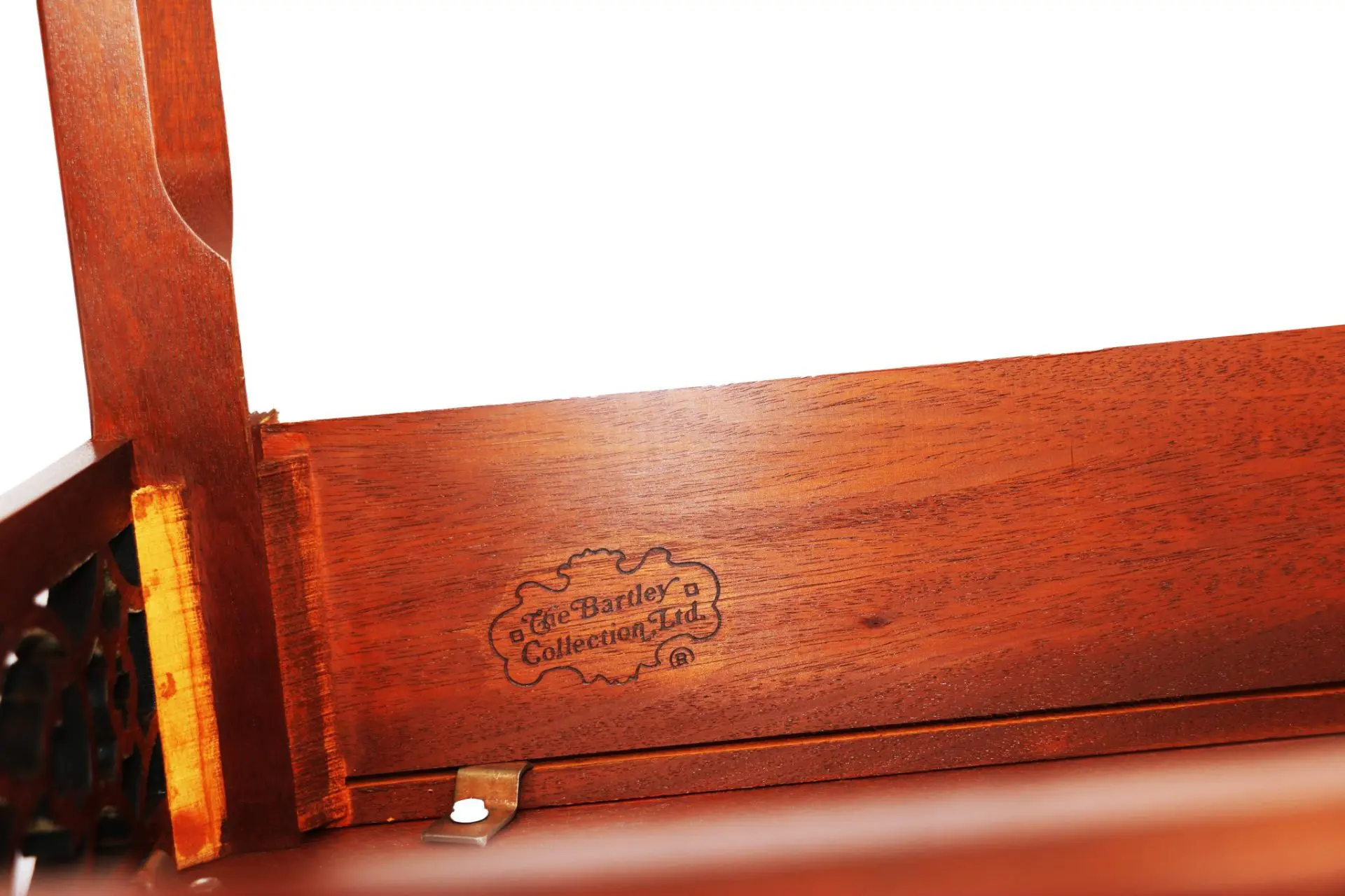 This very attractive Walnut console table finely crafted and carved with beautiful open fretwork details on the front and both sides. No fretwork details at the back side. Featuring banded rectangle top with canted corners, moulded square legs, and stamped Bartley Collection Ltd under the table. This sofa or console table was probably crafted during the first quarter of the 20th century, possibly earlier. Has original finish and is in excellent condition for its age, a very versatile piece. This console table is classic enough to blend with traditional décor, as well as partner with modern or Asian inspired furnishings.nn nnCreator: Bartley Collection (Manufacturer)nnPlace of Origin: United StatesnnDate of Manufacture: 20th CenturynnMaterials and Techniques: WalnutnnCondition: Very good.nnWear: Wear consistent with age and use.nnMeasurements: 35” Wide x 17 _” Deep x 28” Tall