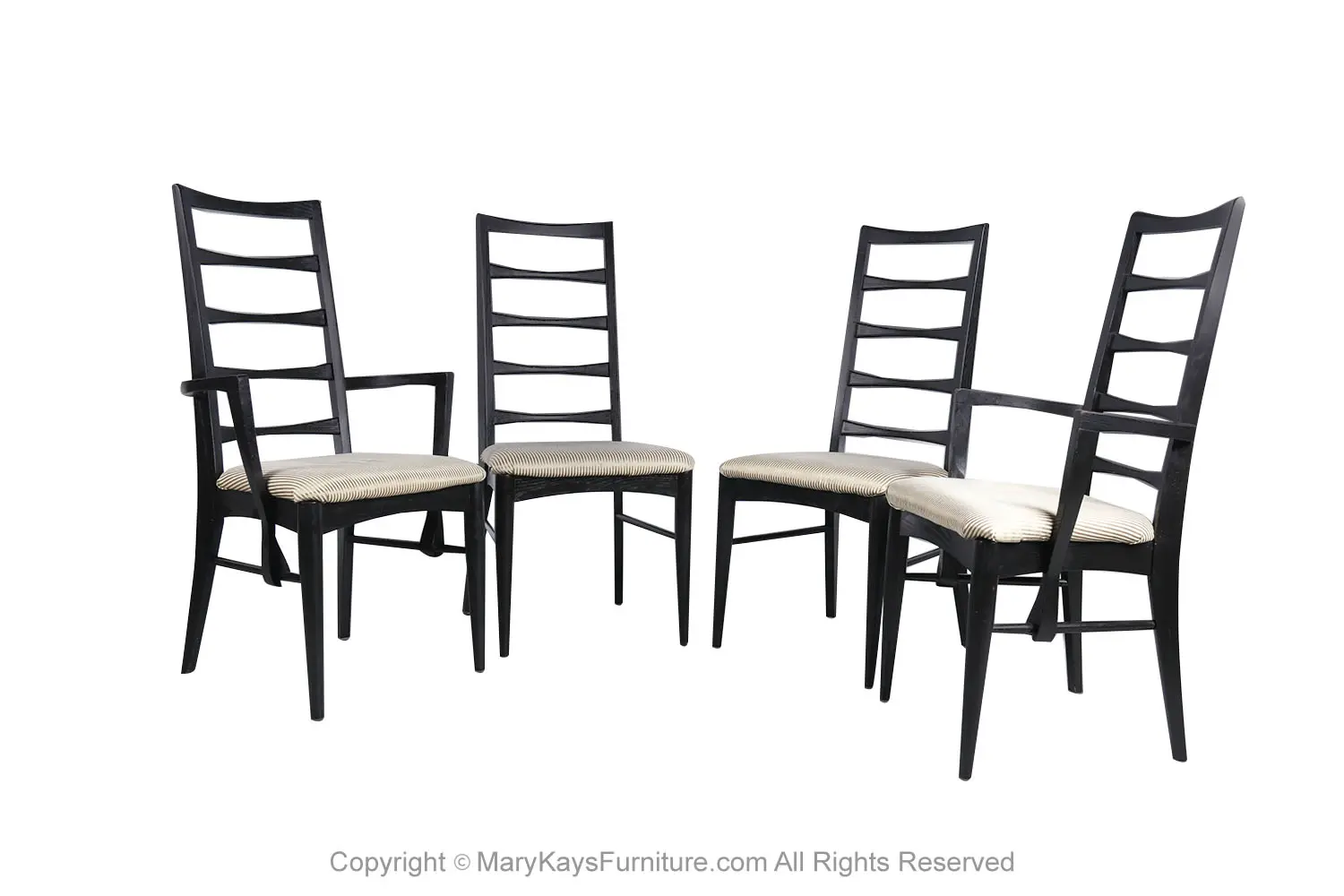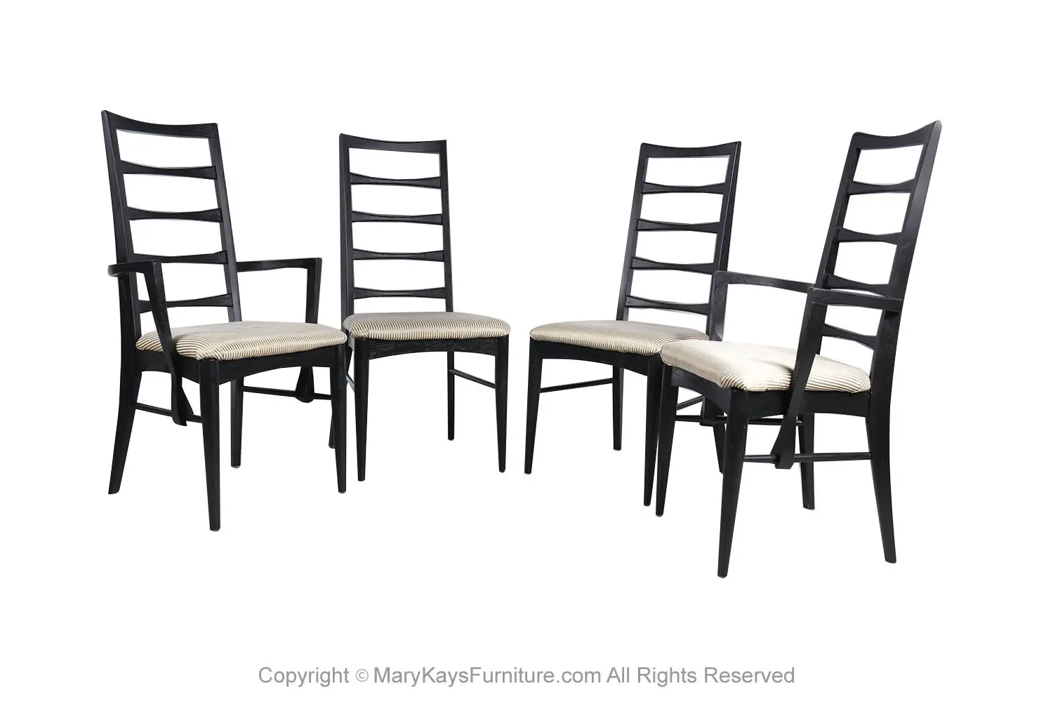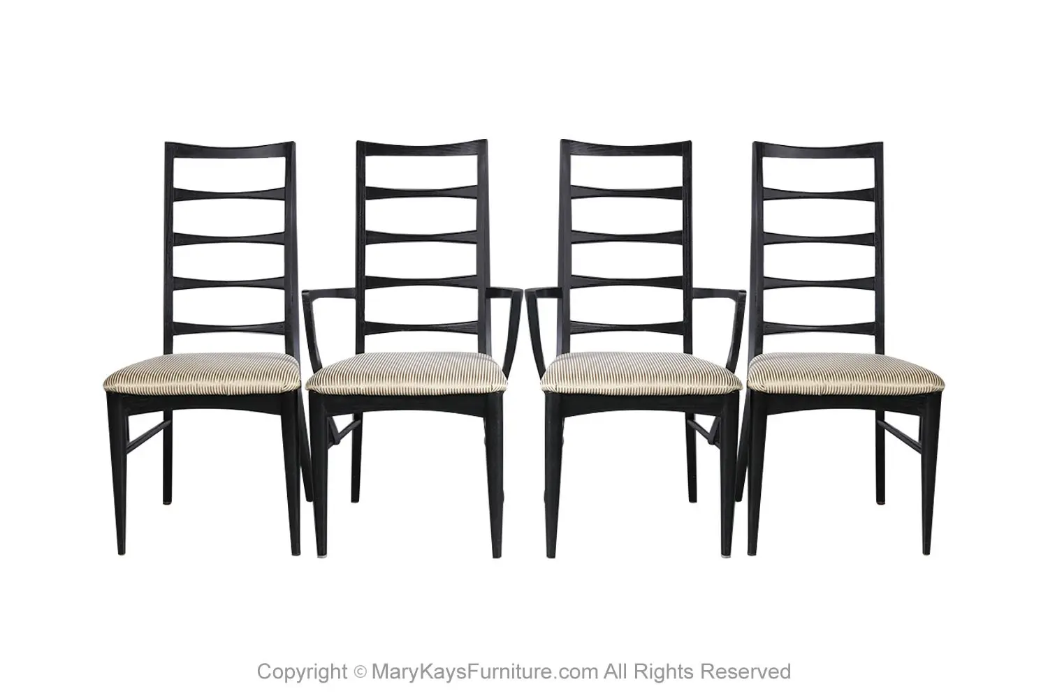 An outstanding set of four dining chairs in black frames, designed by Niels Koefoed for Koefoeds Hornslet, model “Lis” made in Denmark, circa 1960s. This stunning set of four ladder back chairs feature two arm chairs and two side chairs in original upholstered seats. The arm chairs are beautifully proportioned and feature softly curved and carved arms that float gracefully down the side of the seat and seamlessly surround and terminate at the side rail. The chair backs feature a gently carved ladder back with a subtle bow-tie shape. A tall and beautifully angled frame maintains comfort while showcasing a simple elegant form. The frame is finished black, exceptional craftsmanship. This rare set of highly sought after chairs will be a wonderful addition to any modern home. Manufacturers stamp on the underside of the rail (“Furniture Maker, DANISH”; “Made in Denmark by Koefoed”). nCondition Report: Construction is sturdy and stable; beautiful, clean, perfect, original upholstery in good condition, no tears, in great condition. Frames are tight and sturdy. n nManufacturer: Koefoeds Hornslet nDesigner: Niels Koefoed nPlace of Origin: Denmark nDate of Manufacture: 1960’s nOf the Period: Mid Century Modern nPeriod: 1960-1969 nMaterials and Techniques: Wood In Black Finish , Upholstery nCondition: Good nWear: Wear consistent with age and use nMeasurements – Side Chair: 37.5” H x 19” W x 21.5” D (seat height 17.5”) nArm Chair: 37.5” H x 21.38_ W x 22.5_ D (seat height 17.5”) n n