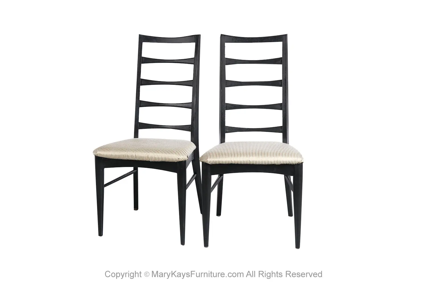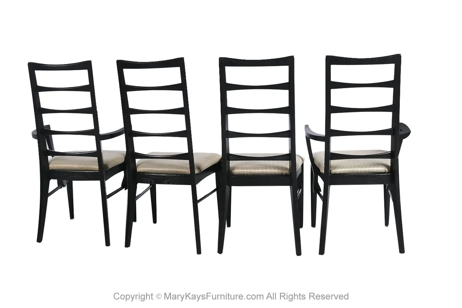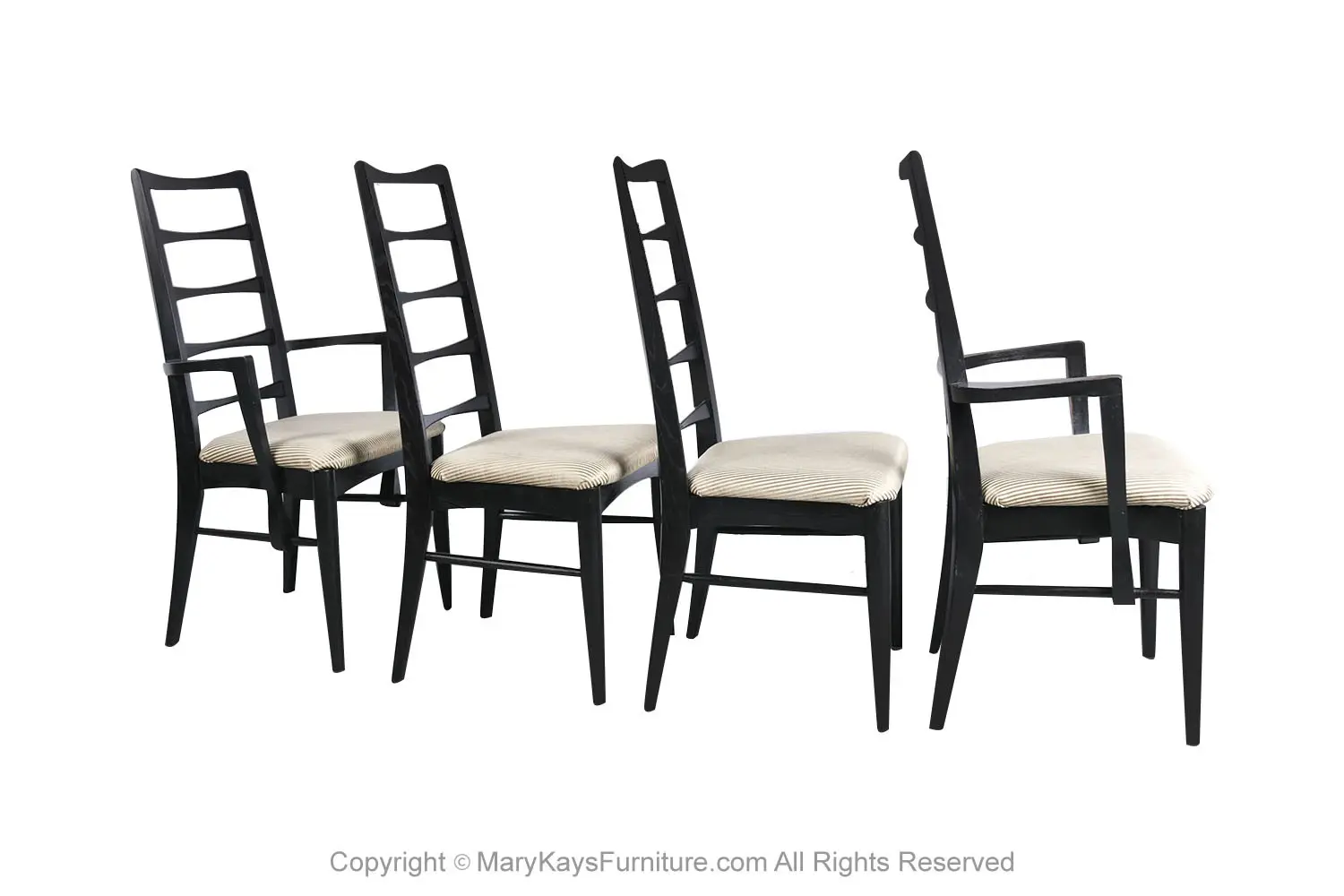 An outstanding set of four dining chairs in black frames, designed by Niels Koefoed for Koefoeds Hornslet, model “Lis” made in Denmark, circa 1960s. This stunning set of four ladder back chairs feature two arm chairs and two side chairs in original upholstered seats. The arm chairs are beautifully proportioned and feature softly curved and carved arms that float gracefully down the side of the seat and seamlessly surround and terminate at the side rail. The chair backs feature a gently carved ladder back with a subtle bow-tie shape. A tall and beautifully angled frame maintains comfort while showcasing a simple elegant form. The frame is finished black, exceptional craftsmanship. This rare set of highly sought after chairs will be a wonderful addition to any modern home. Manufacturers stamp on the underside of the rail (“Furniture Maker, DANISH”; “Made in Denmark by Koefoed”). nCondition Report: Construction is sturdy and stable; beautiful, clean, perfect, original upholstery in good condition, no tears, in great condition. Frames are tight and sturdy. n nManufacturer: Koefoeds Hornslet nDesigner: Niels Koefoed nPlace of Origin: Denmark nDate of Manufacture: 1960’s nOf the Period: Mid Century Modern nPeriod: 1960-1969 nMaterials and Techniques: Wood In Black Finish , Upholstery nCondition: Good nWear: Wear consistent with age and use nMeasurements – Side Chair: 37.5” H x 19” W x 21.5” D (seat height 17.5”) nArm Chair: 37.5” H x 21.38_ W x 22.5_ D (seat height 17.5”) n n