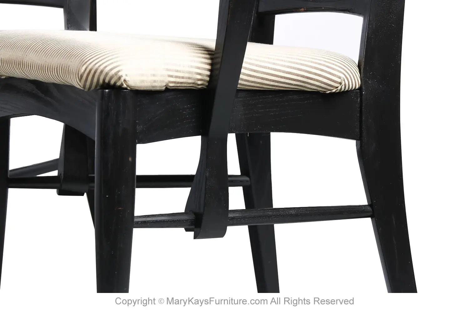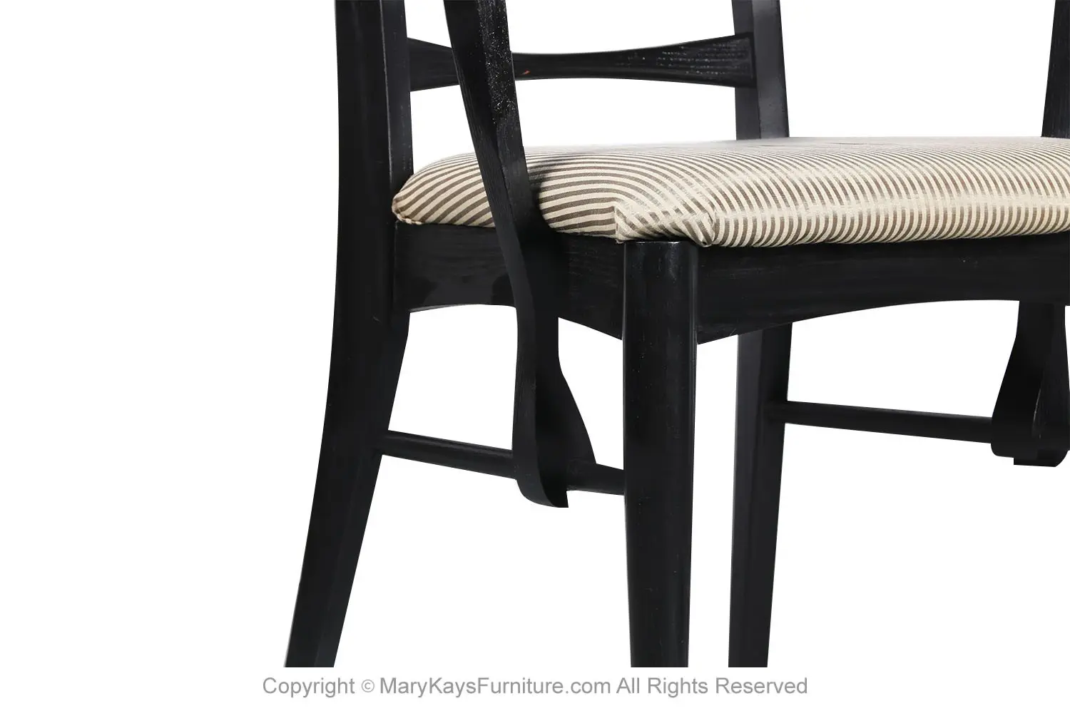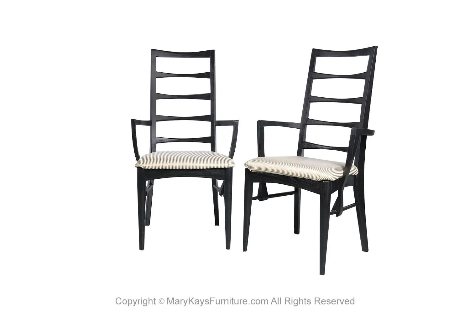 An outstanding set of four dining chairs in black frames, designed by Niels Koefoed for Koefoeds Hornslet, model “Lis” made in Denmark, circa 1960s. This stunning set of four ladder back chairs feature two arm chairs and two side chairs in original upholstered seats. The arm chairs are beautifully proportioned and feature softly curved and