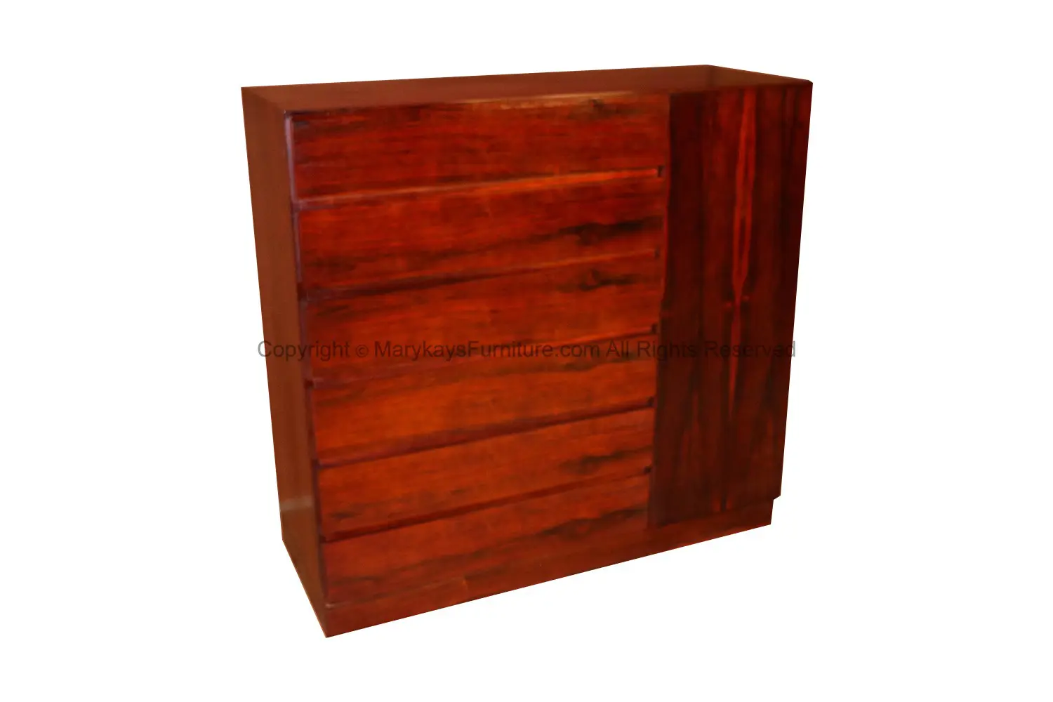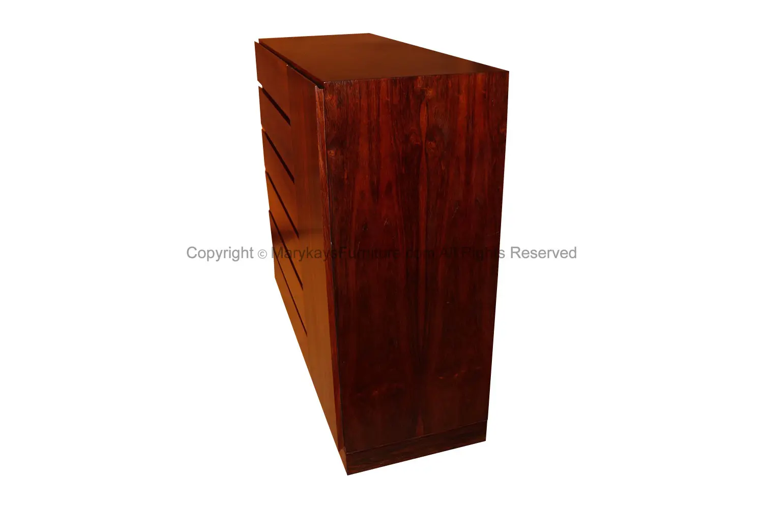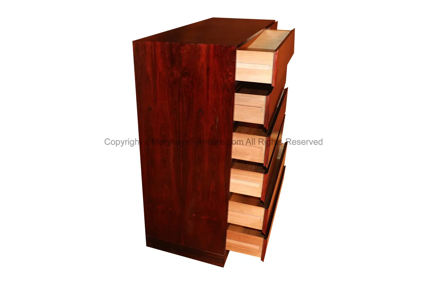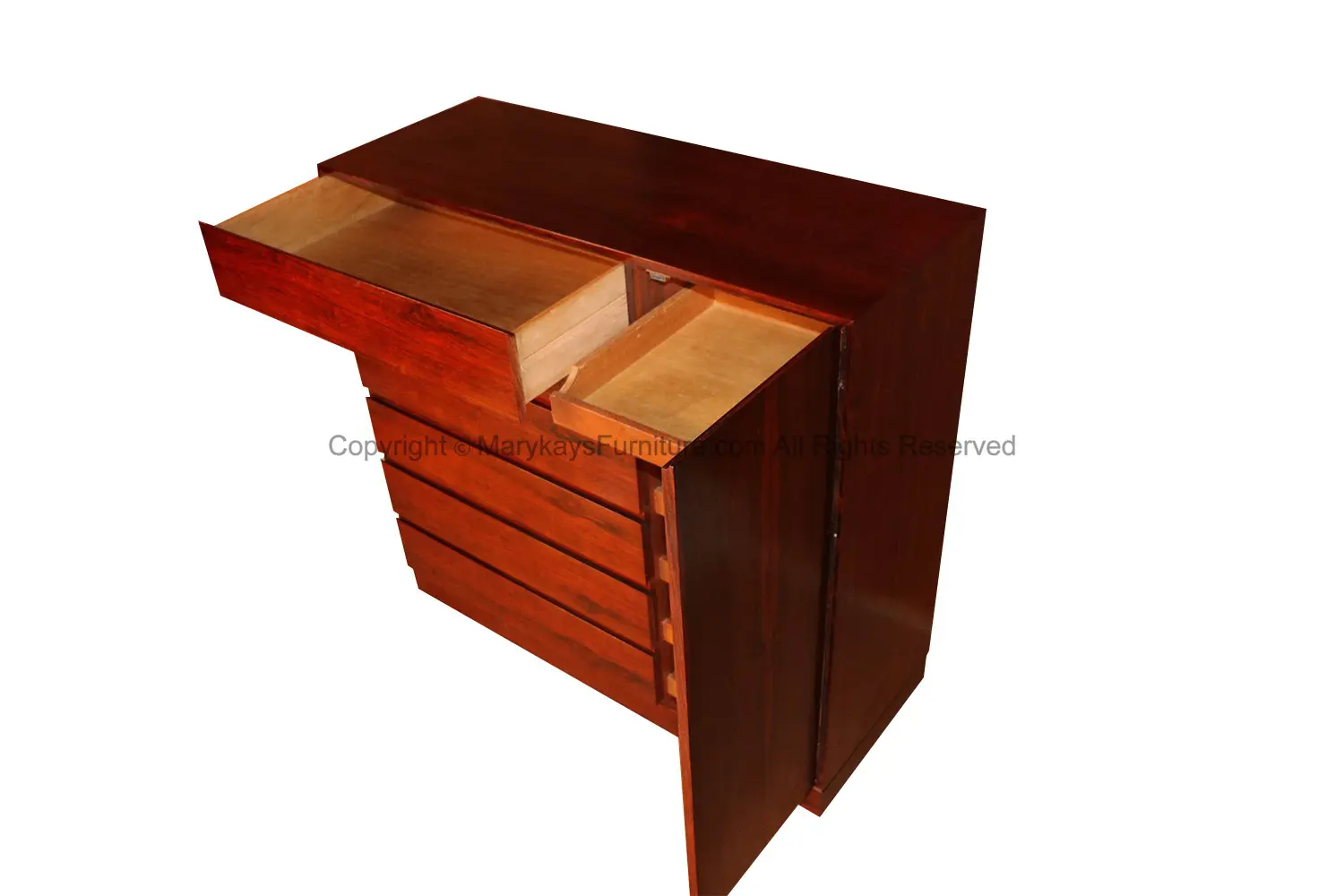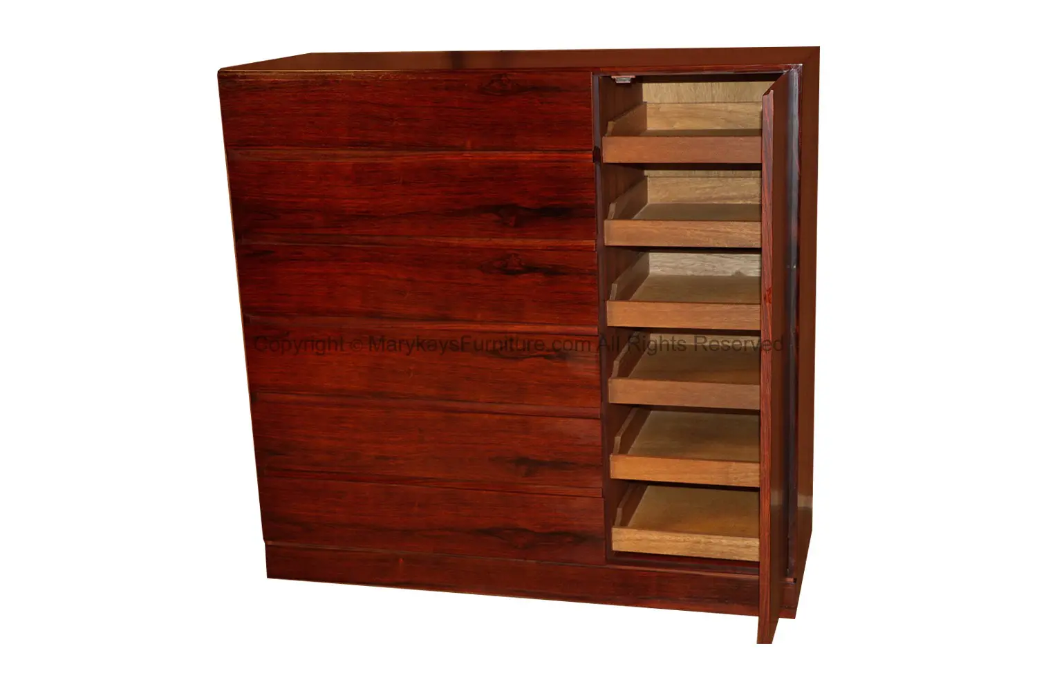 One of the most attractive work in sculpted rosewood by Vinde Møbelfabrik. Made in Denmark and designed by Wahl Iversen, circa 1970s. Scandinavian inspired minimalism at its best. This mid-century modern, minimalist Danish rosewood highboy dresser/ gentleman’s chest features a column of six deep drawers on the left side and a cabinet door on the right, opens to reveal six shallow solid beechwood interior drawers which roll out, offering ample storage. Makers stamp (Made in Denmark MV) on back. Don’t be fooled by the term “Gentleman’s Chest” – this high functioning storage piece is really gender neutral. In fact, it has drawers galore, making it well-suited as a “Ladies Chest” for clothing storage as well as jewelry and accessories. Stunning, timeless rosewood elegance! nCondition Report: Solid, stable construction; drawers slide smoothly. n n nDesigner: Arne Wahl Inversen nManufacturer: Vinde Mobelfabrik nOf the Period: Danish Mid-Century Modern nPlace of Origin: Denmark nDate of Manufacture: ca. 1970 nPeriod: 1970-1979 nMaterials and Techniques: Rosewood nCondition: Good nWear: Wear consistent with age and use nMeasurements: 45.13_ W x 17.88_ D x 43_ H n n n n n