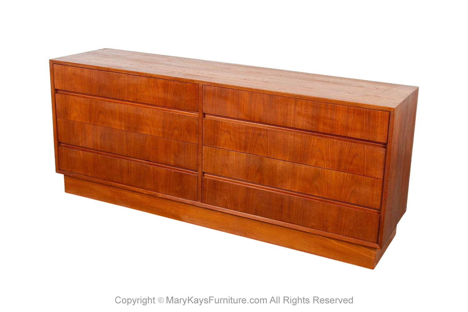 Attractive long low Danish modern sleek smooth face teak 8 long low dresser. This is a very simple yet modern 8 drawer design. Each drawer has beautiful medium tone stunning teak grains with attractive inset slit drawers carved out minimal pulls. At the pull of the 8 drawers, you will expose plenty of storage. A clean simple framed cabinet with minimalist drawer, thin rounded trim edge design, topped with beautiful teak grains on top which has beautiful light and dark grains, creating a beautiful face, and top to this mid-century Danish modern low dresser. Raised on a wrapped teak plinth base, this modern dresser would be just as stylish in the bedroom as it would be in the office behind a desk, or under a flat screen in a living room. Clean mid-century design that looks just as modern back then as it is today.