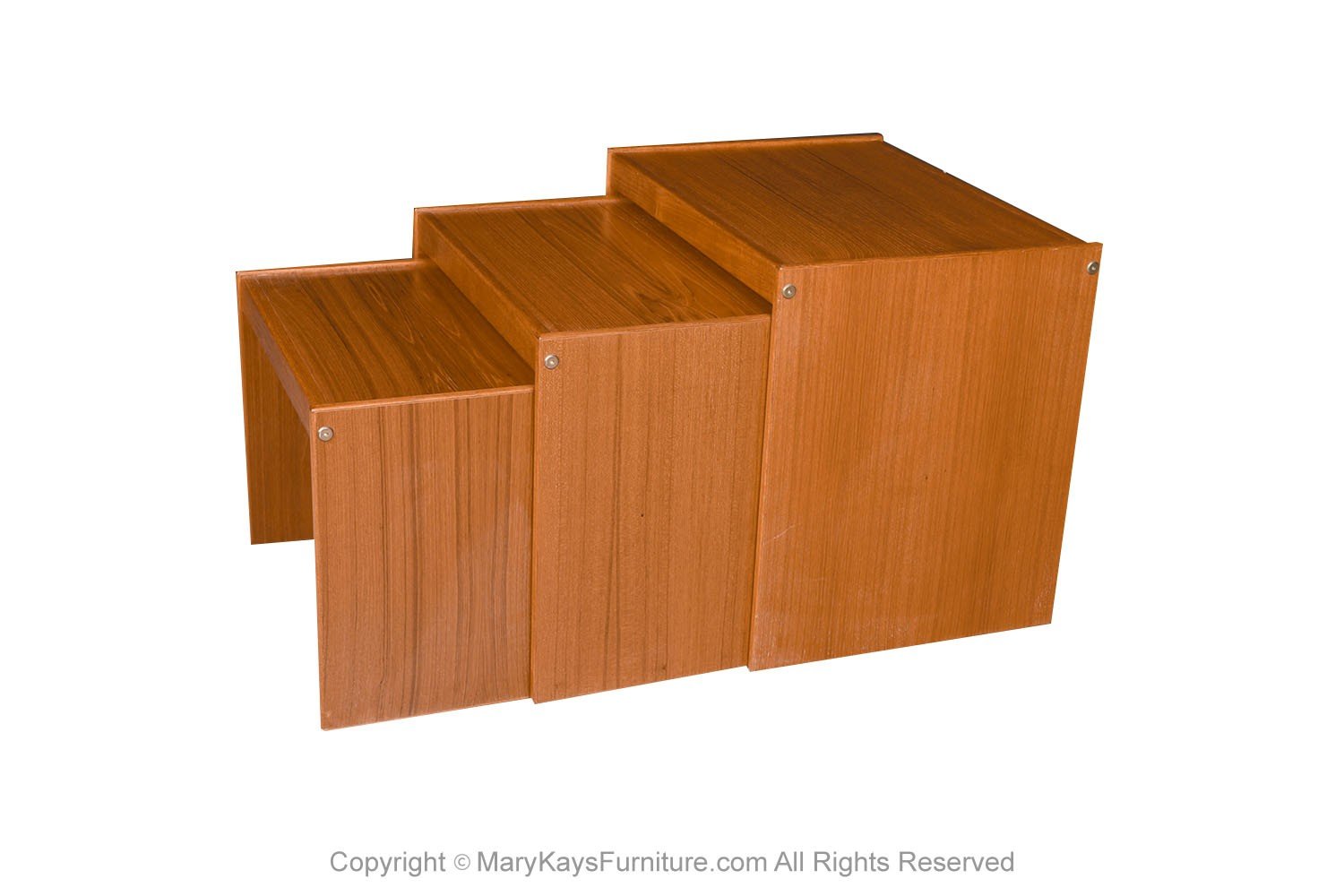 Set of three Mid Century Modern nesting tables by Nordisk Andels Eksport made in Denmark. Exceptionally well crafted. Undersides of the tables are channeled so that the tables hook to one another when nested, forming an attractive cube like profile. The wood grain is naturally highlighted in a teak pattern throughout, with a rich teak tone, top surface of each one, is in good condition. Stacked set of three tables for easy storage. Individual tables are in varying sizes – large, medium and small. Measurements correspond to the Largest of the Nesting Tables. Great vintage condition, retains original label on the underside: (Nordisk Andels Eksport). Modern Danish Style, Mid Century Modern retro nesting tables. Perfect for occasional tables or serving. nCondition Report: Original finish, exhibit little signs of wear, overall gorgeous surface condition. Construction is strong and sturdy. n n nCreator: Nordisk Andels Eksport (Maker) nPlace of Origin: Denmark nDate of Manufacture: circa 1960s nPeriod: Mid 20th Century nMaterials and Techniques: Teak nCondition: Great vintage condition nWear: Wear consistent with age and use nMeasurements: Largest table 21 1/4_ Wide x 15 3/4_ Deep x 19_ High middle is 16 3/4_ tall small table is 14_ tall n n