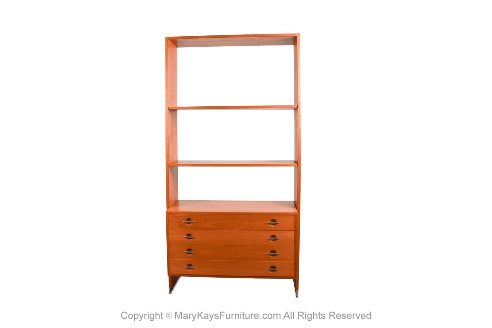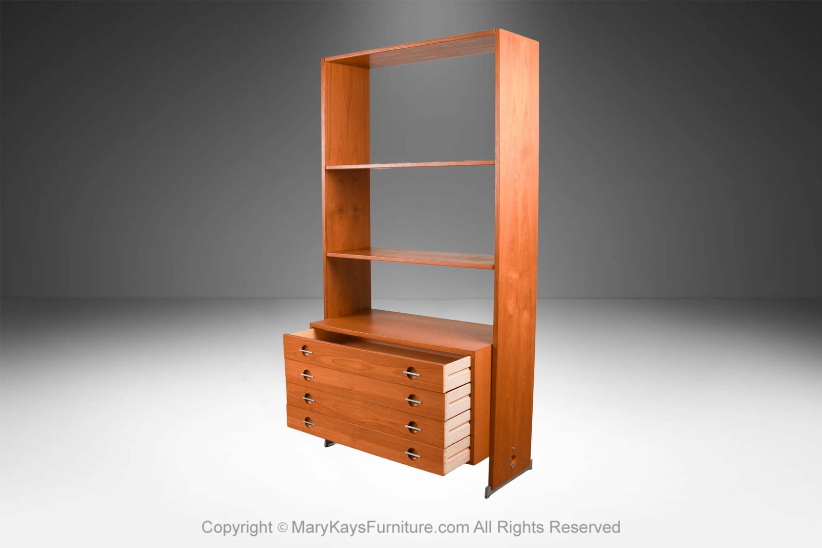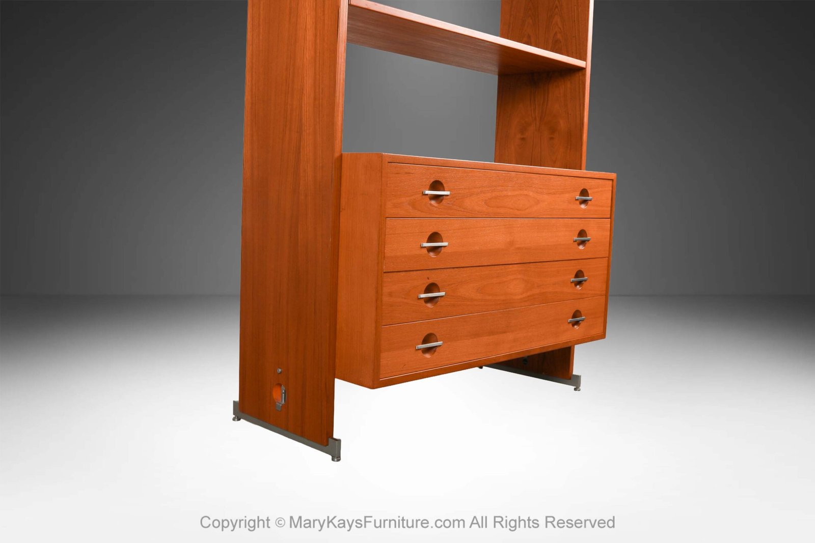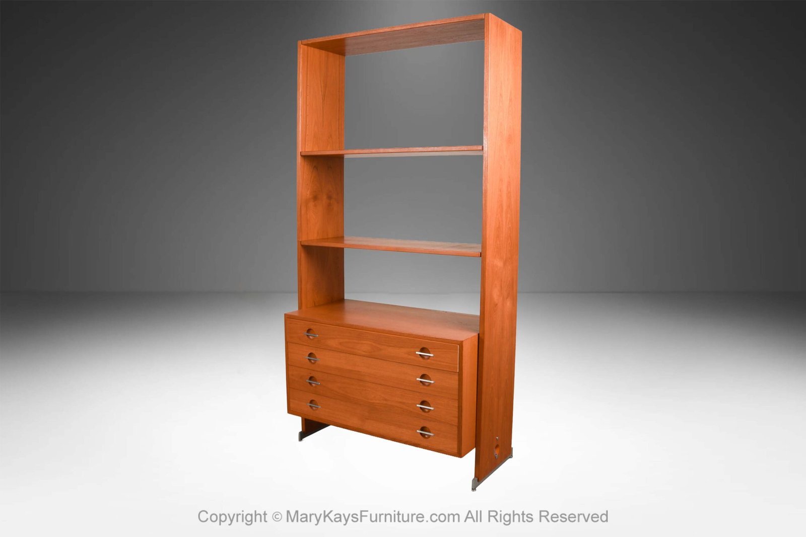A remarkable teak, freestanding, modular, room divider, bookcase, storage cabinet, made in Denmark attributed to Hans Wegner for RY Mobler. This amazing vintage wall unit/ chest of drawers features gorgeous teak tones and grain finished on all sides, offers two open-adjustable removable top display shelves with a lower chest of drawers accented with chrome handles. The lower chest of drawers is raised above the floor with a supporting rod and adds an airy, stylish look to this clean-lined room divider. This unit is completely free-standing and can be used alone or added to your wall system. The finished back side makes it ideal for placement in an open floor plan, making it a great focal point, very functional & sought-after and very collectible, perfectly scaled for any space. Classically designed of exceptional craftsmanship can be used throughout your home in the dining room, or a storage piece for the living room, office or bedroom. Danish control logo on underside. Also available is a matching Single Column cabinet unit sold separately.