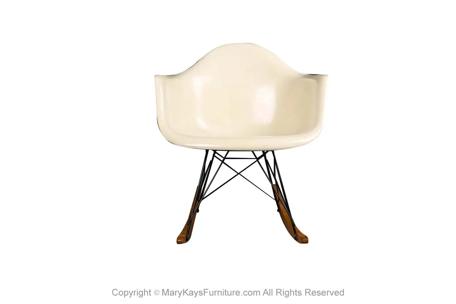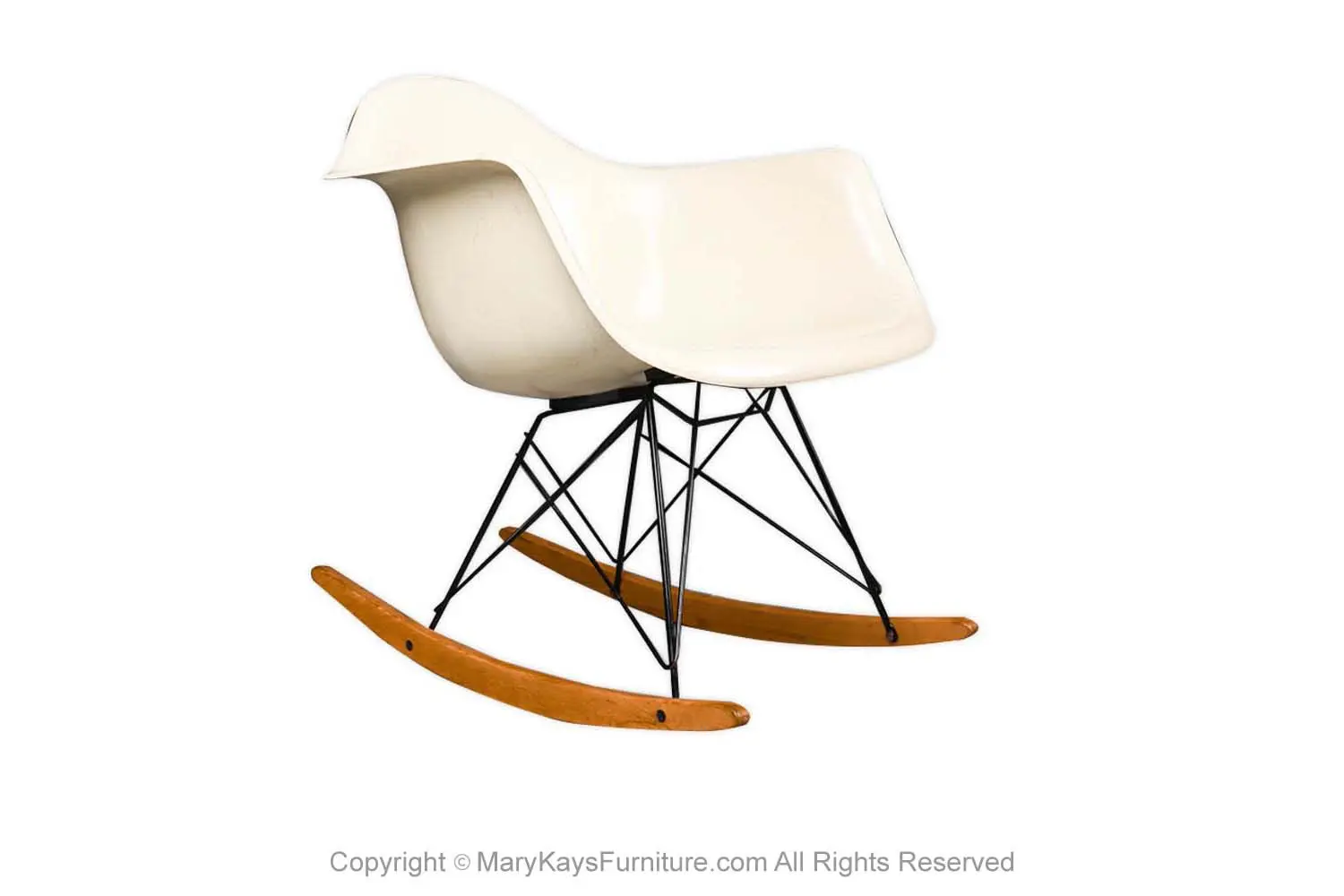 Authentic rare Mid Century Modern early RAR rocking chair designed by Charles and Ray Eames for Herman Miller. This gorgeous mid-century rocking chair was produced between 1956 -1959. This is an early RAR rocking chair. Original Condition. Features original early1950’s fiberglass molded bucket formed tub chair with arms, raised on zinc-plated steel base with shock mounts intact, supported on wooden rocker runners. Also retains the Herman Miller label. Solid frame is sturdy and comfortable, ready to sit in your family room, living area, reading room, or even the nursery. This is a rare and hard to find piece.