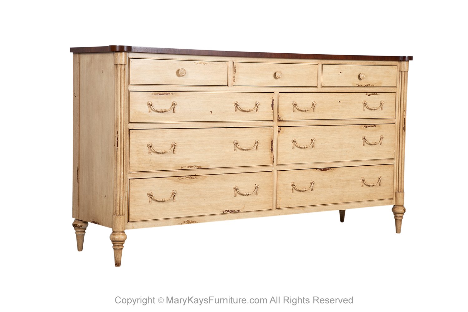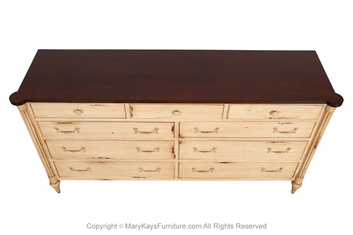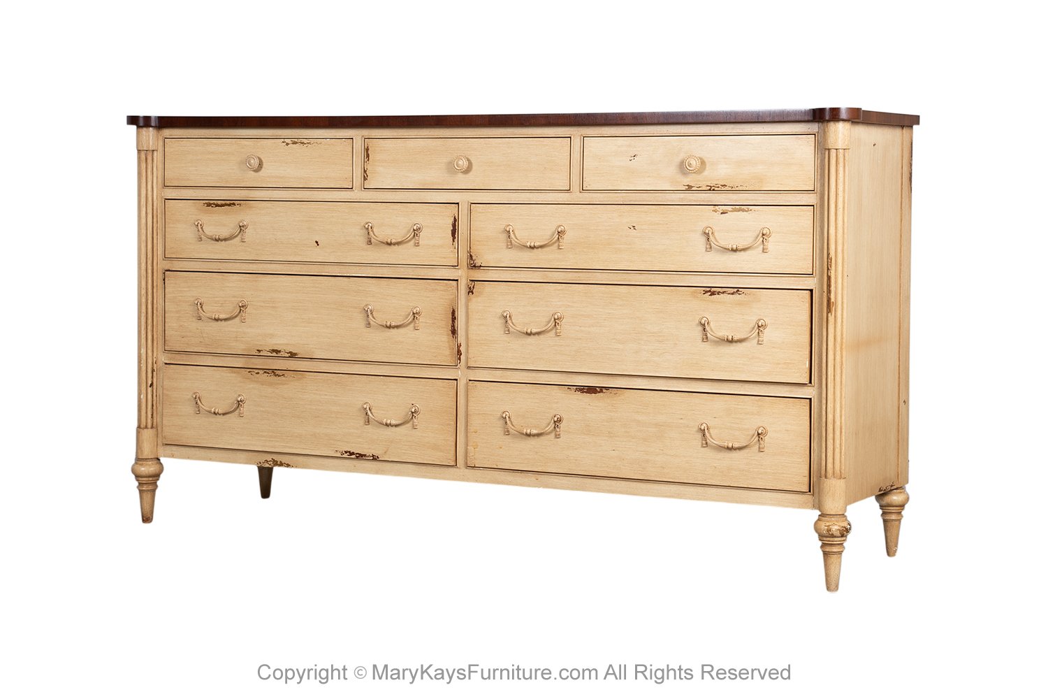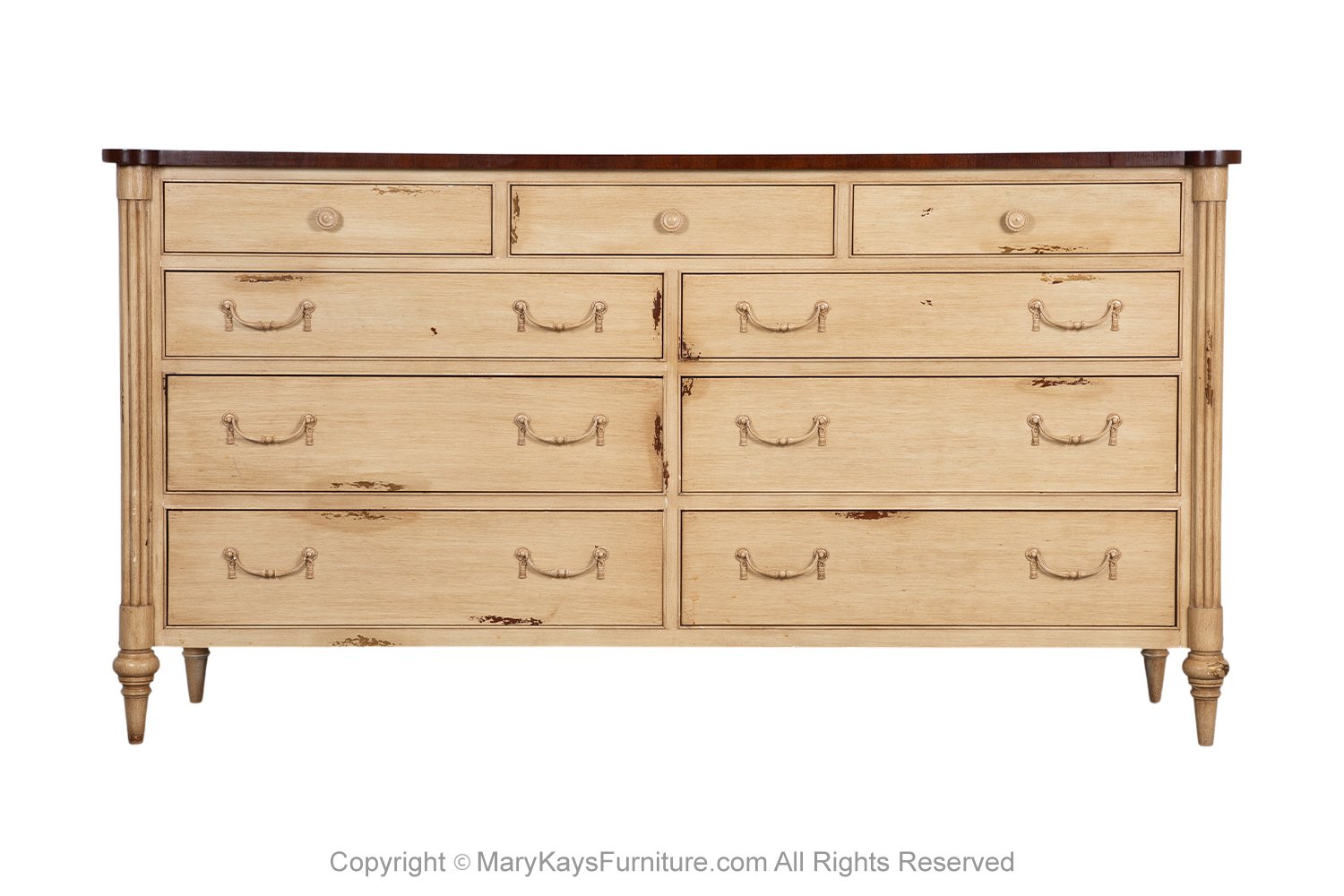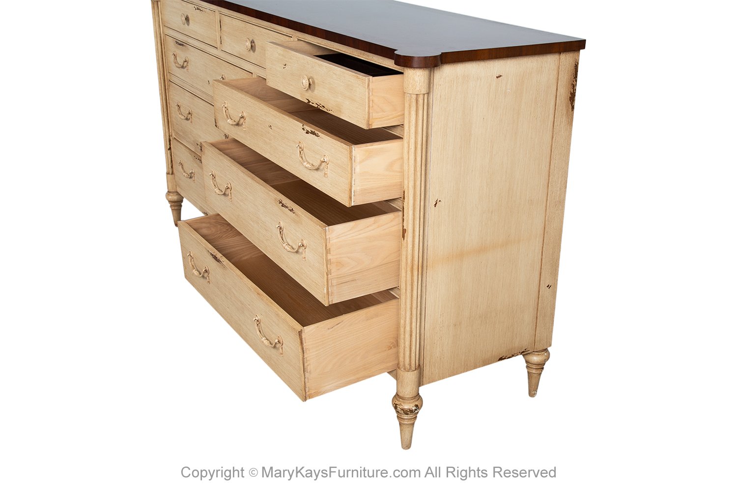 Attractive dresser from the Left Bank Atelier Case goods collection by the Hickory Chair Company made in the United States. This beautiful dresser is an extremely well made and solid piece in great condition with beautiful, elegant lines. Features Directoire-inspired design that has been weathered to beautiful, distressed perfection. Outfitted with fine hardware, European in