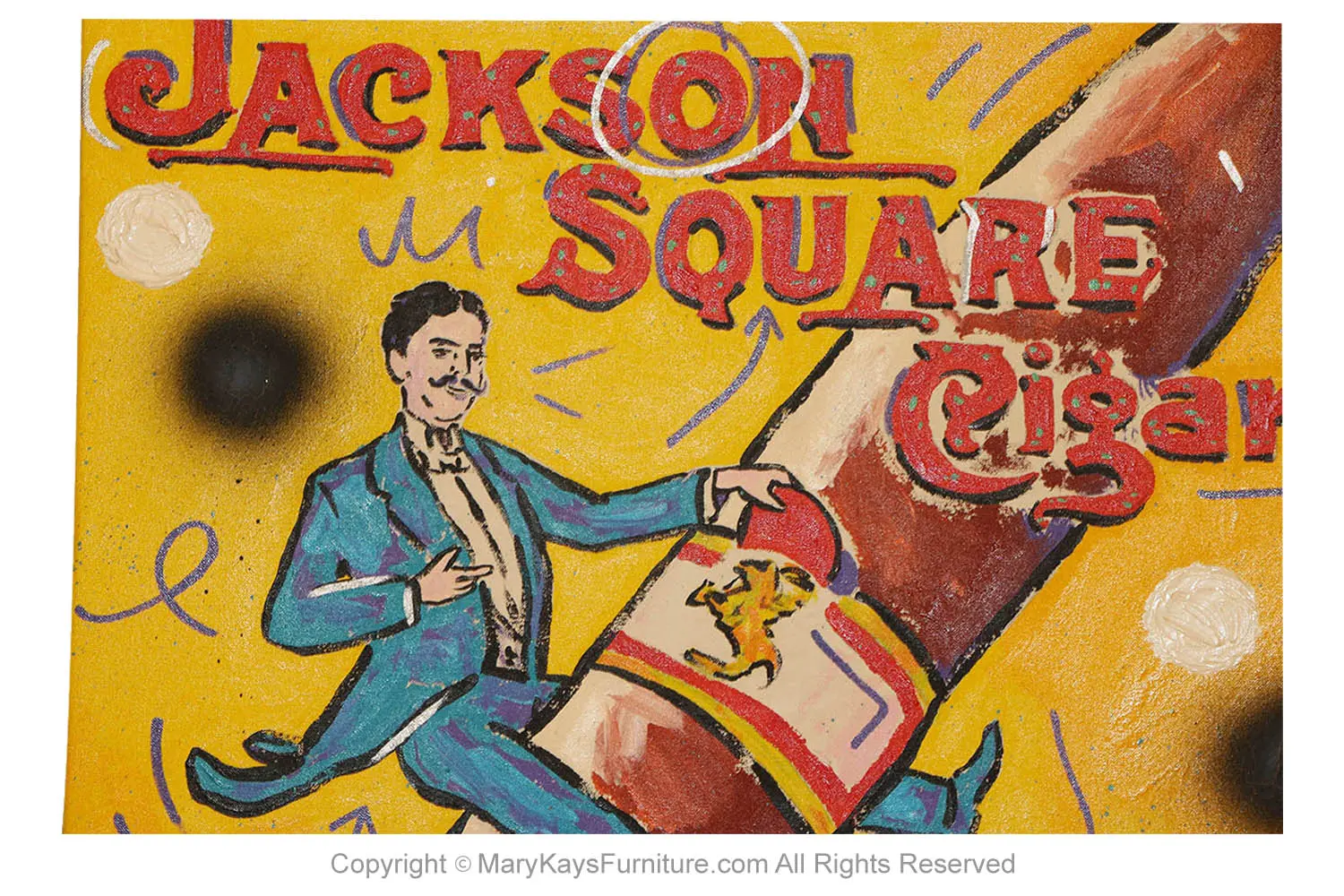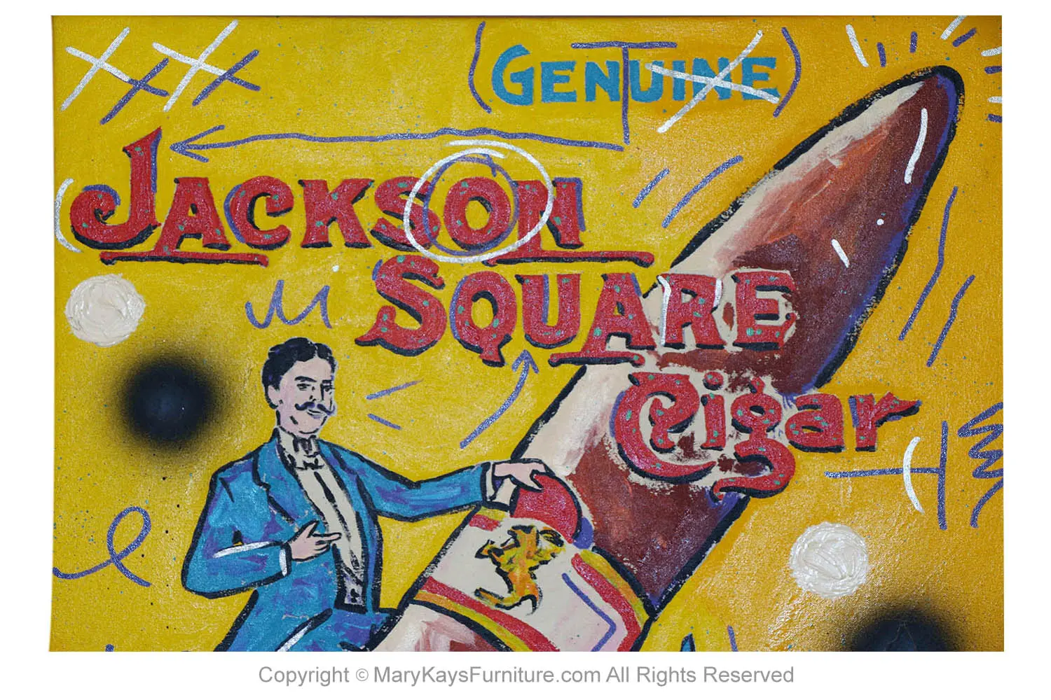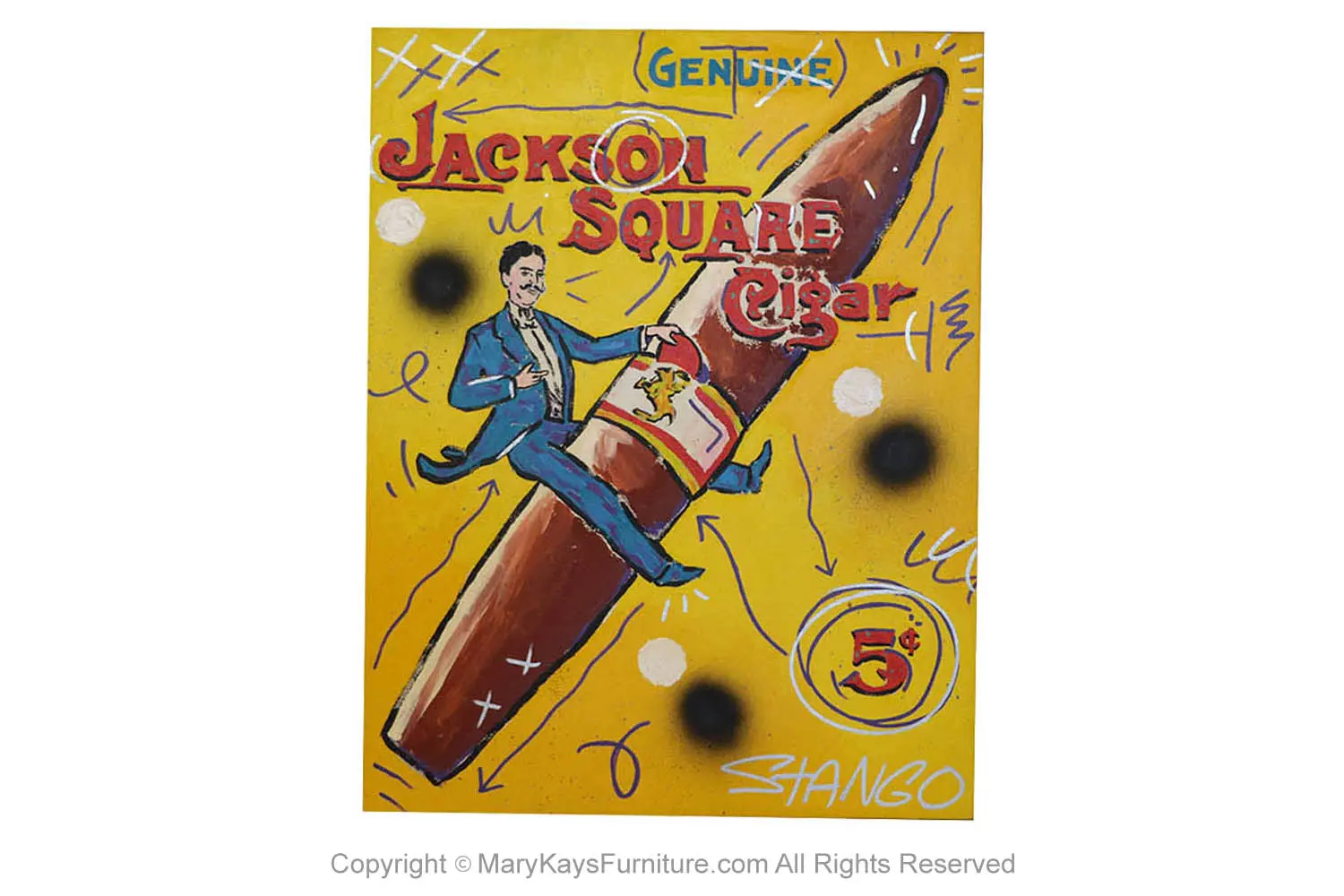 John Stango (born 1958) An original vintage work of art on canvas 31″ x 24″ unframed and signed “Stango” (lower right). This fine example of Modern American Pop Art from the 1950’s, is inspired by Jackson Square brand cigar advertising poster. The artwork comes from a private collection. “Genuine Jackson Square Cigar” is a painting