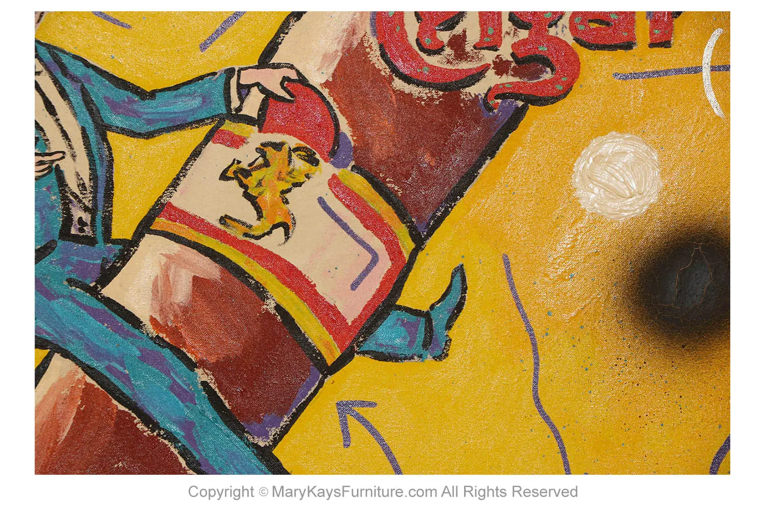 John Stango (born 1958) An original vintage work of art on canvas 31″ x 24″ unframed and signed “Stango” (lower right). This fine example of Modern American Pop Art from the 1950’s, is inspired by Jackson Square brand cigar advertising poster. The artwork comes from a private collection. “Genuine Jackson Square Cigar” is a painting in the style of vintage advertisements depicting a well-dressed man in a blue suit, playfully riding an enormous cigar, as if it were a rocket or mechanical bull with an impressive yellow background. Influenced from advertising imagery from the 50’s and 60’s, along with contemporary Pop artists. This is a nice example of John Stango’s work. The painting is executed in bold colors and will add style to any mid-century design house or art collection. n n nArtist: John Stango (b. 1958) American nCreation year: 20th century nMedium: Canvas nMovement & Style: Pop Art nCondition: Good nCondition Details: this painting is in good original condition nMeasurements: H 31″ x W 24″ n n nAs an Emerging American Pop Artist, Stango’s work is represented in galleries from New York to California, Sweden to Japan, attracting patrons from a widely diverse demographic, his art appears in public and private collections throughout the country. John Stango (b. 1958) was raised and educated in Philadelphia. Hired by Macy’s and Bloomingdales for his artistic eye and expertise after graduating from Temple University, Stango quickly earned himself a place amongst the mid century modernist movement within the art community. A true mid century pop artist, working in the styles of Andy Warhol and Peter Max, Stango seeks and finds inspiration in the colors and subjects of the urban and glamorous 1950’s and 60’s he remembers from his childhood reality and dreams. He is internationally known for his bold colors, masculine and aggressive textures, and advertisement-esque depictions of mid century themes and celebrities. Currently he works out of a historic warehouse outside of Philadelphia painting full – time. n n