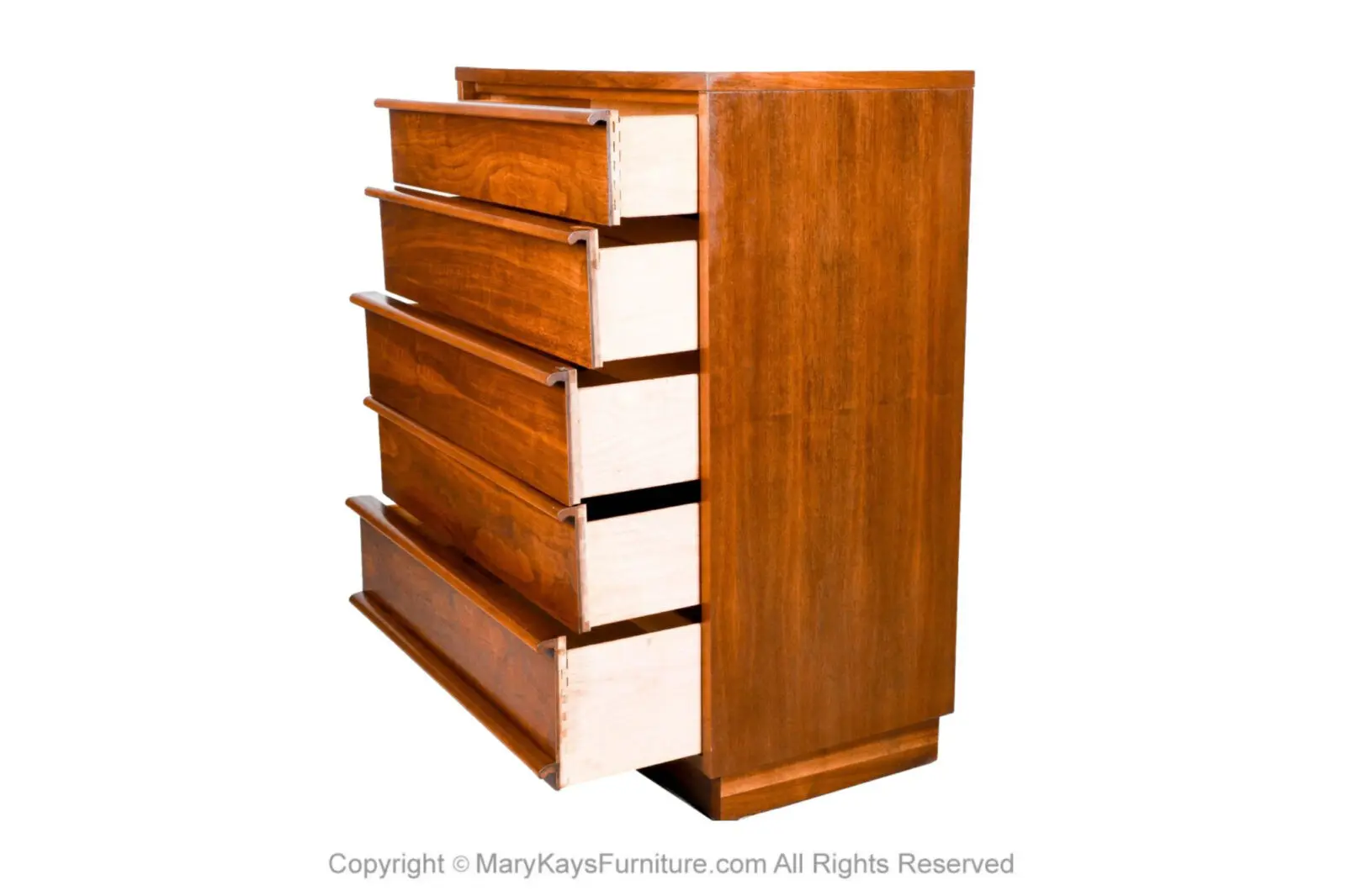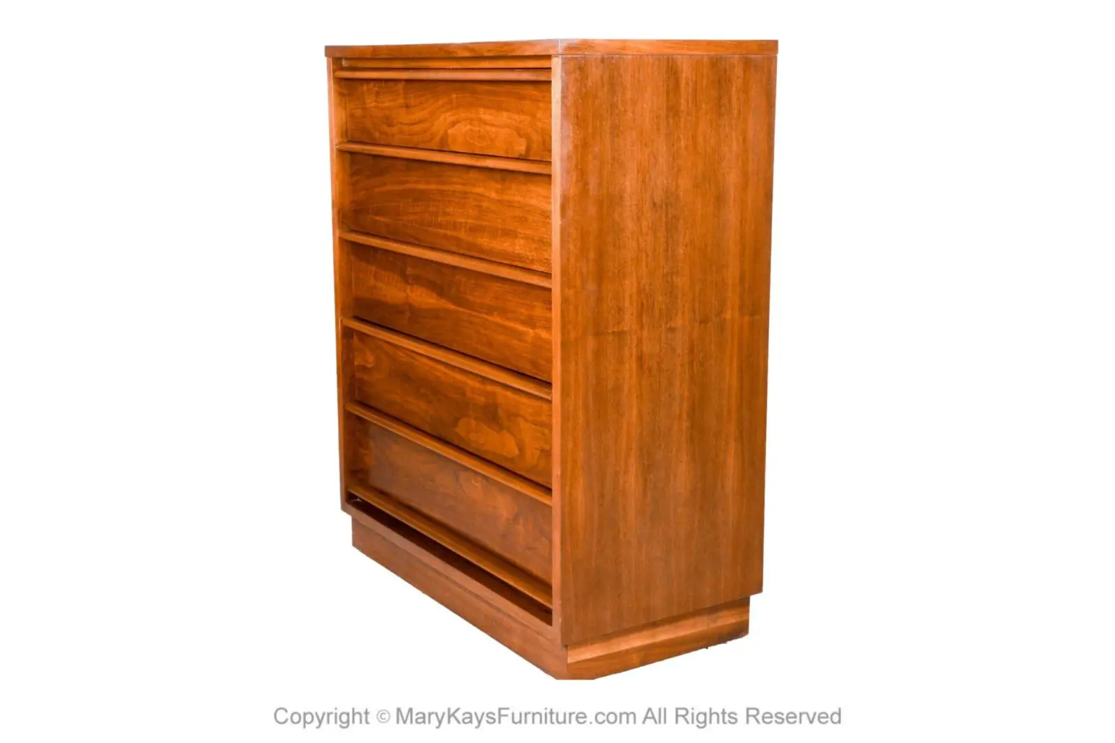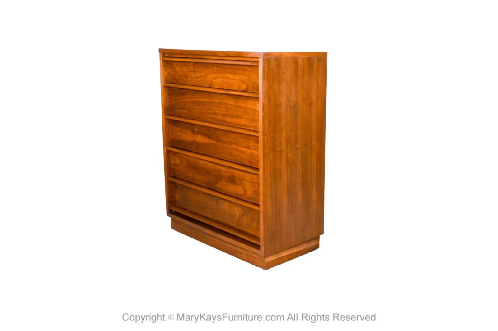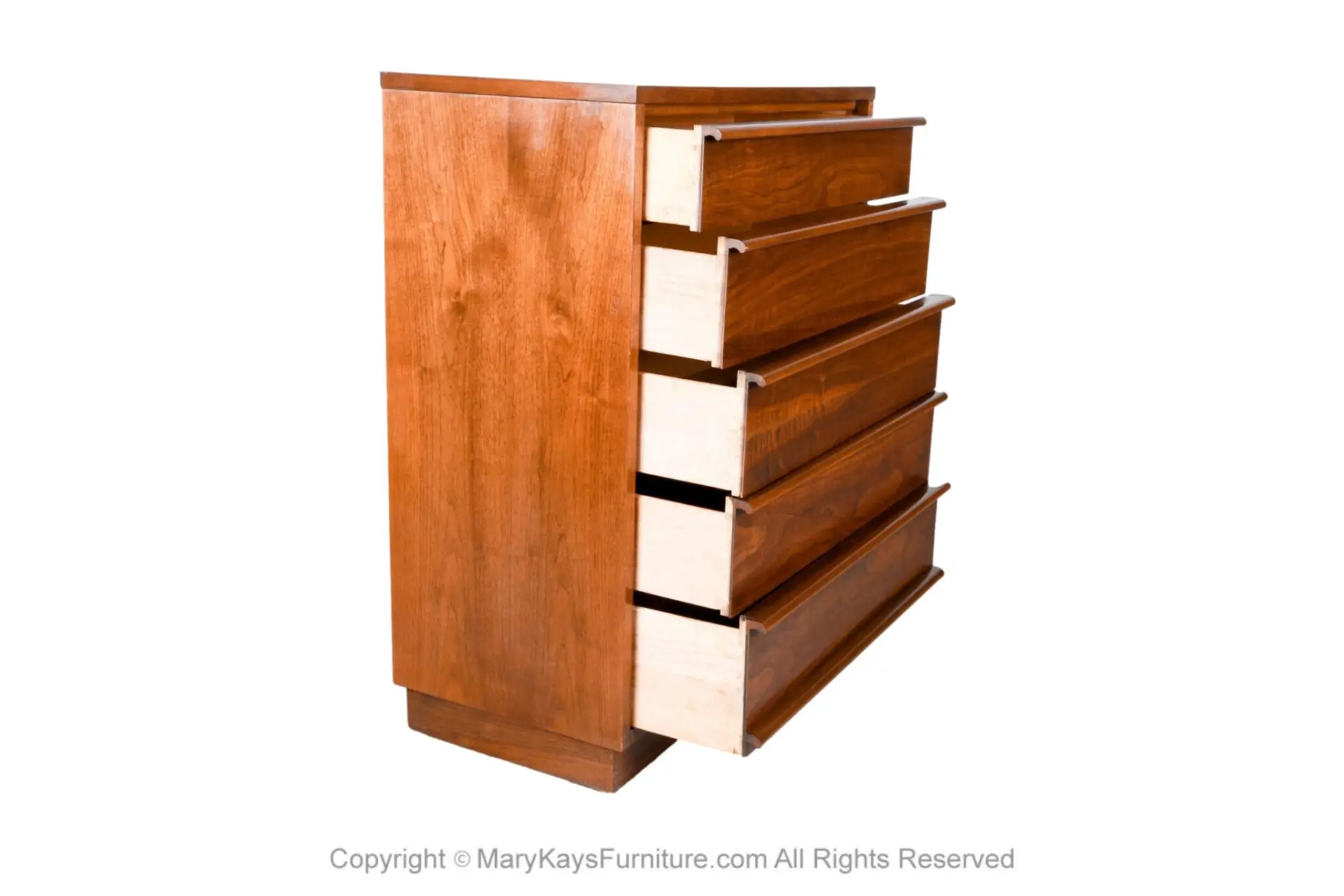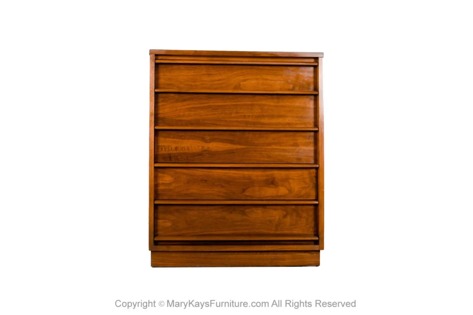 This is a beautiful example of Mid-Century craftsmanship by Lane furniture. This dresser is part of the Rhythm collection by Lane, built in the 1960’s, to have a style that was timeless then, and still is today. This retro piece was constructed with top of the line hardware, and excellently crafted woodwork. Dresser is solid hardwood, with beautiful walnut veneer. Five Solid Wood Drawers with sculptured Drawer Pulls and dovetail construction. The dresser rests over a sturdy plinth base. Lane furniture pieces are highly collectible, made in the United States. Lane was famous for its on-point design of the time and progressive use of luxury materials. Perfect addition to any room. Matching Long Dresser also available for sale (sold separately). nCondition Report: In overall good original vintage condition, only very minor wear from age. Construction is strong and sturdy. n nManufactured: Lane Furniture nPlace of Origin: United States nDate of Manufacture: 1960’s nPeriod: 1960-1969 nMaterials and Techniques: Walnut veneer nCondition: Good Solid Wood Construction nWear: Wear consistent with age and use nMeasurements: 35 1/2_ Wide x 44_ Tall x 18_ Deep n