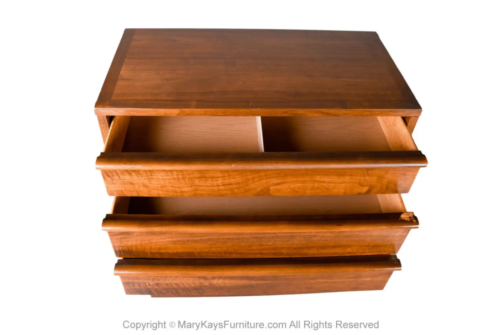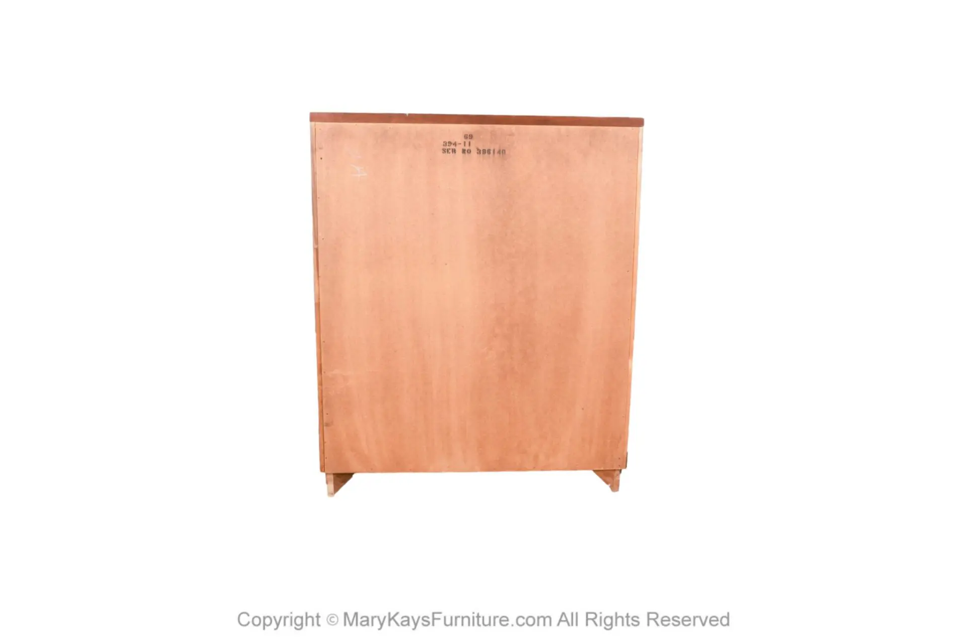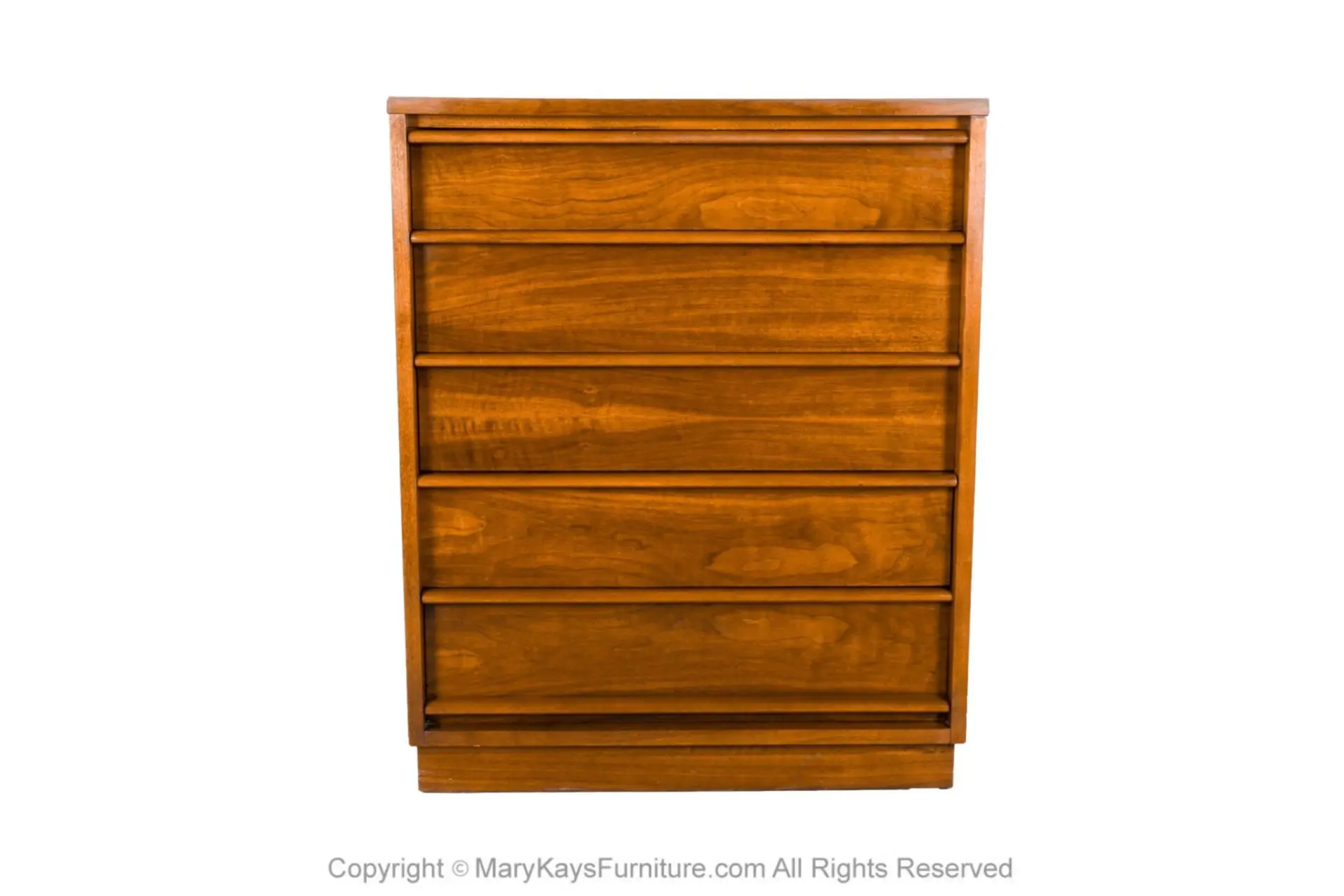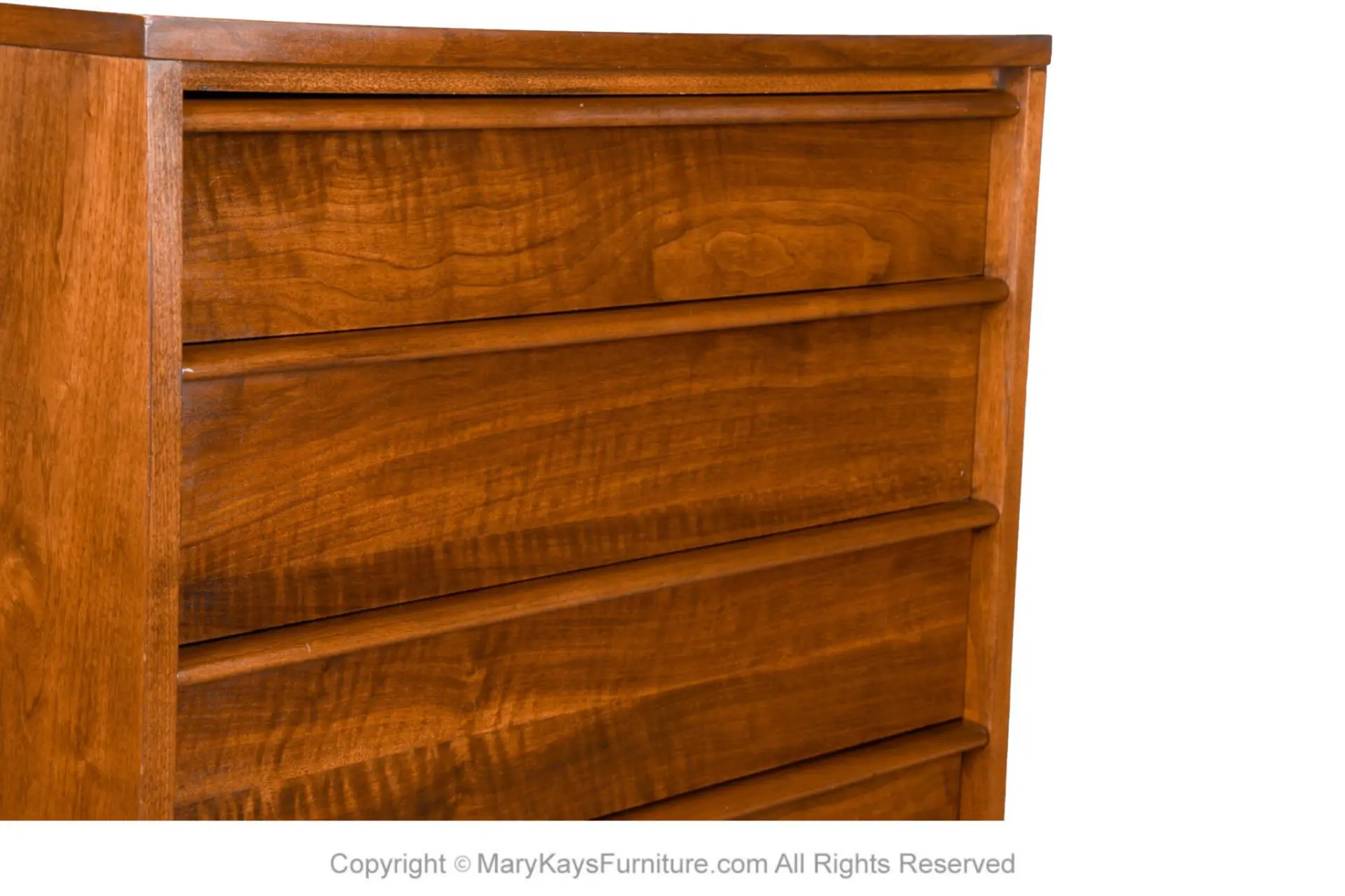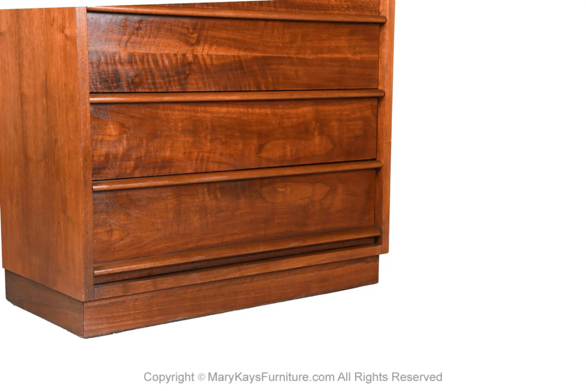 This is a beautiful example of Mid-Century craftsmanship by Lane furniture. This dresser is part of the Rhythm collection by Lane, built in the 1960’s, to have a style that was timeless then, and still is today. This retro piece was constructed with top of the line hardware, and excellently crafted woodwork. Dresser is solid hardwood, with beautiful walnut veneer. Five Solid Wood Drawers with sculptured Drawer Pulls and dovetail construction. The dresser rests over a sturdy plinth base. Lane furniture pieces are highly collectible, made in the United States. Lane was famous for its on-point design of the time and progressive use of luxury materials. Perfect addition to any room. Matching Long Dresser also available for sale (sold separately). nCondition Report: In overall good original vintage condition, only very minor wear from age. Construction is strong and sturdy. n nManufactured: Lane Furniture nPlace of Origin: United States nDate of Manufacture: 1960’s nPeriod: 1960-1969 nMaterials and Techniques: Walnut veneer nCondition: Good Solid Wood Construction nWear: Wear consistent with age and use nMeasurements: 35 1/2_ Wide x 44_ Tall x 18_ Deep n