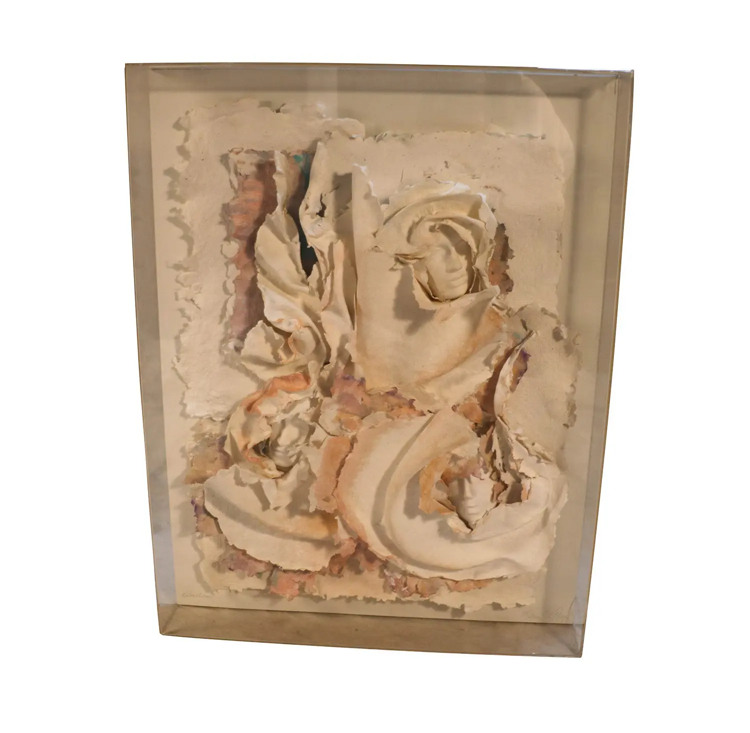 Artist: Ross Mazur, American and Marcia Mazur-Gold, American nMedium: handmade paper, Pressed Cotton Fiber Collage Sculpture in Plexi-case, signed in pencil “Marcia Gilbert Mazur” nMeasurements: 44 5/8″ H x 5 3/8″ D x 34 3/8″ W n nCondition Report: Minor age appropriate handling wear. Original Plexi-case frame with some cracks (frame overall of very fine quality and condition). Overall remaining in outstanding presentation– excellent condition. n n n nRoss Mazur was born and raised in Chicago. After receiving a scholarship at the Chicago Art Institute, he enjoyed a 20-year career as an illustrative photographer, bringing to the industry many original and innovative techniques still in use today. n nRoss Mazur has been a full-time working artist all his life. Since the 1980’s he has focused his creative endeavors painting, shaping and embellishing handmade pulp paper. This kind of art can be hard, but satisfying, work. The end result of this effort is an interesting combination of production processes from raw materials to finished art pieces. In 2002, Marcia and Ross completed a video segment for the PBS series “The Artist’s Workshop”. n nRoss was introduced to paper art by his wife Marcia Mazur-Gold, who died 2004, but before her death they collaborated on the creation of mixed media compositions. They had been working as a team on and off since 1971 and began working in paper in 1981 when Marcia took a papermaking workshop at the famous Ox Bow Art School in Michigan. Drawn to his wife’s creative work, Ross quickly left his clay work and other art behind. n nBy 1980s Ross owned a gallery on the North Shore in Chicago which he ran for four years but then moved on to do mainly art expos and festivals around the country including New York City. In 1986, the Mazurs showed their work at the Los Angeles Art Expo and stopped off in Sedona. Two weeks later they bought a house here and built their studio. n nThey also maintained a studio in Miami and, for a while, in Michigan, which gave them an opportunity to work closer to the main art festivals where they sold their work. Where they went really all depended on where the collectors of their art went. Moving around the country, with the Mid-West in the summer, and Florida in the winter, with the Arizona art festivals in between, became a way of life. Here in Arizona, Ross participated in art festivals in Sedona, Tempe, Scottsdale, Tucson and Fountain Hills. n nIn 1991 Mazur’s work took a turn toward Native American motif although his paper sculptures, both free-standing and for the wall, remained abstract. He also removed the Lucite framing that encased the paper art. This change dramatically altered the way the paper art was perceived, especially here in Arizona. It sells extremely well. Just as Ross loves the tactile nature of this medium, perhaps his collectors also feel the need to be close to the art without impediments such as Lucite cases. n nAt the present time Ross is working on a series of sculptural compositions for the wall as well as free standing sculptures. These pieces are composed of a pressed cotton fiber matrix, utilizing the process of handmade paper. n nMazur has participated in the Sedona Art Tour that brought participants from the Page Spring Winery by limo to his studio. At the studio they were treated to a gallery with his work, then on to a room where the paper is pulverized in a Hollander beater and then put through a 60-ton press to make large sheets of handmade paper. The largest space is between these two rooms, where Ross puts together various papers, painting and embellishing them. It is an extraordinary process and fun to watch.