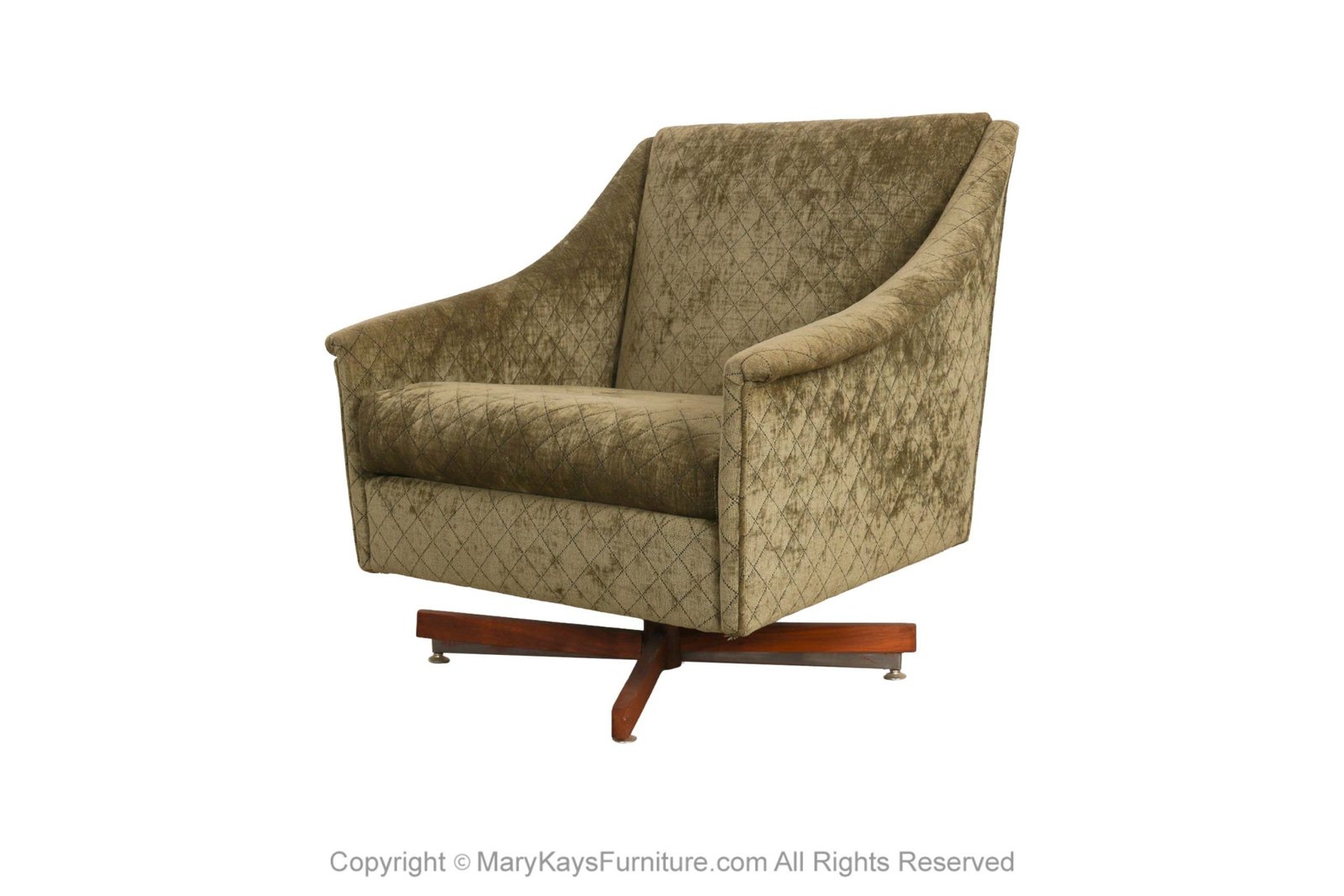 Mid-century Adrian Pearsall style swivel armchair. Features wooden four-leg base that allows it to swivel 360°effortlessly, offering smooth movement and a stylish look. The sloped arms and roomy, comfortable seat cradle the body providing comfort and support, original striking green velvet diamond patterned upholstery provides a soft vintage look. This time capsule is an absolute treasure of a find for anyone passionate about excellent quality in their collection. A very comfortable piece, having distinctive characteristics of its time, crafted to last many generations, remains young in years. It is an investment quality selection, bringing visual interest and pleasure to any modern home for years to come.