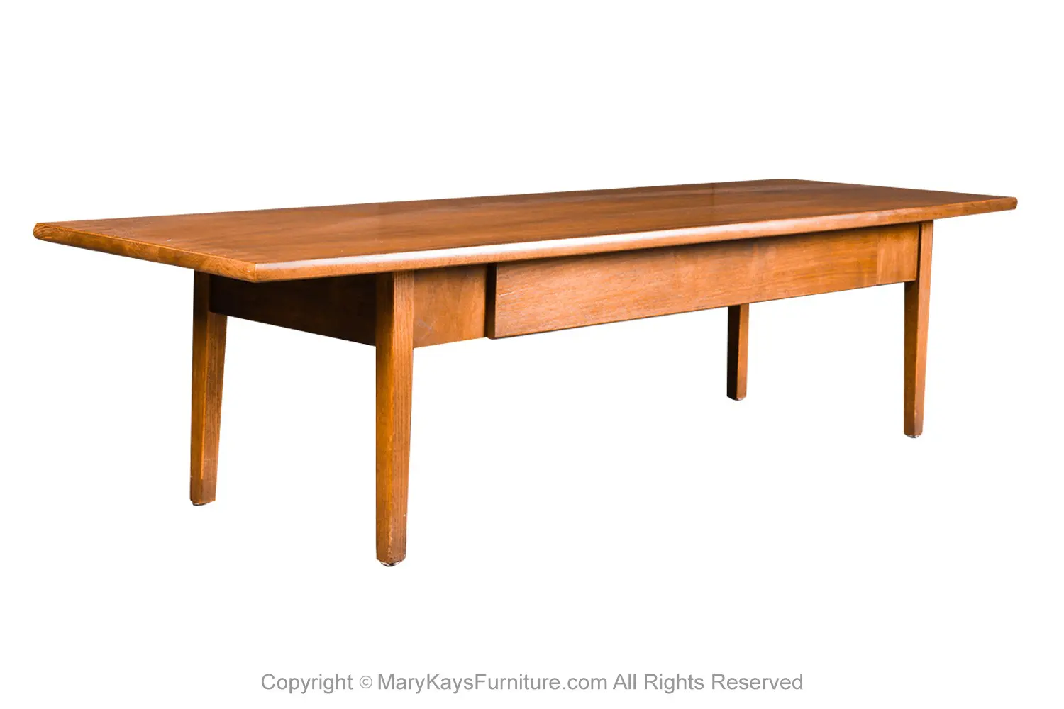 A beautiful, mid-century, modern, 1960’s, Danish style, coffee table/ bench, by Stanley Furniture. The perfect length to pair with an extra long sofa, in great original condition. Featuring rectangular top, with Scandinavian influence, made of rich walnut, simple lines, with elongated style top, lower center drawer, maker’s name (Stanley Furniture) stamped on interior of drawer. The table rests on stylish sturdy legs. The beautiful coffee table maintains its well preserved, original walnut finish. This is an outstanding selection for serious collectors of mid century modern Danish. A gorgeous sight to behold in person! nCondition Report: Original finish, exhibit little signs of wear, with typical scuffs, overall gorgeous surface condition. Construction is strong and sturdy. n nStyle: Danish Modern/ Vintage Danish Modern/Mid-Century Modern nOrigin: USA nManufacturer: Stanley nMaterials and Techniques: Woodwork Walnut, Veneer nCondition: Good nWear: Wear consistent with age and use nMeasurements: 15_ Tall x 60_ Long x 20_ Deep n n