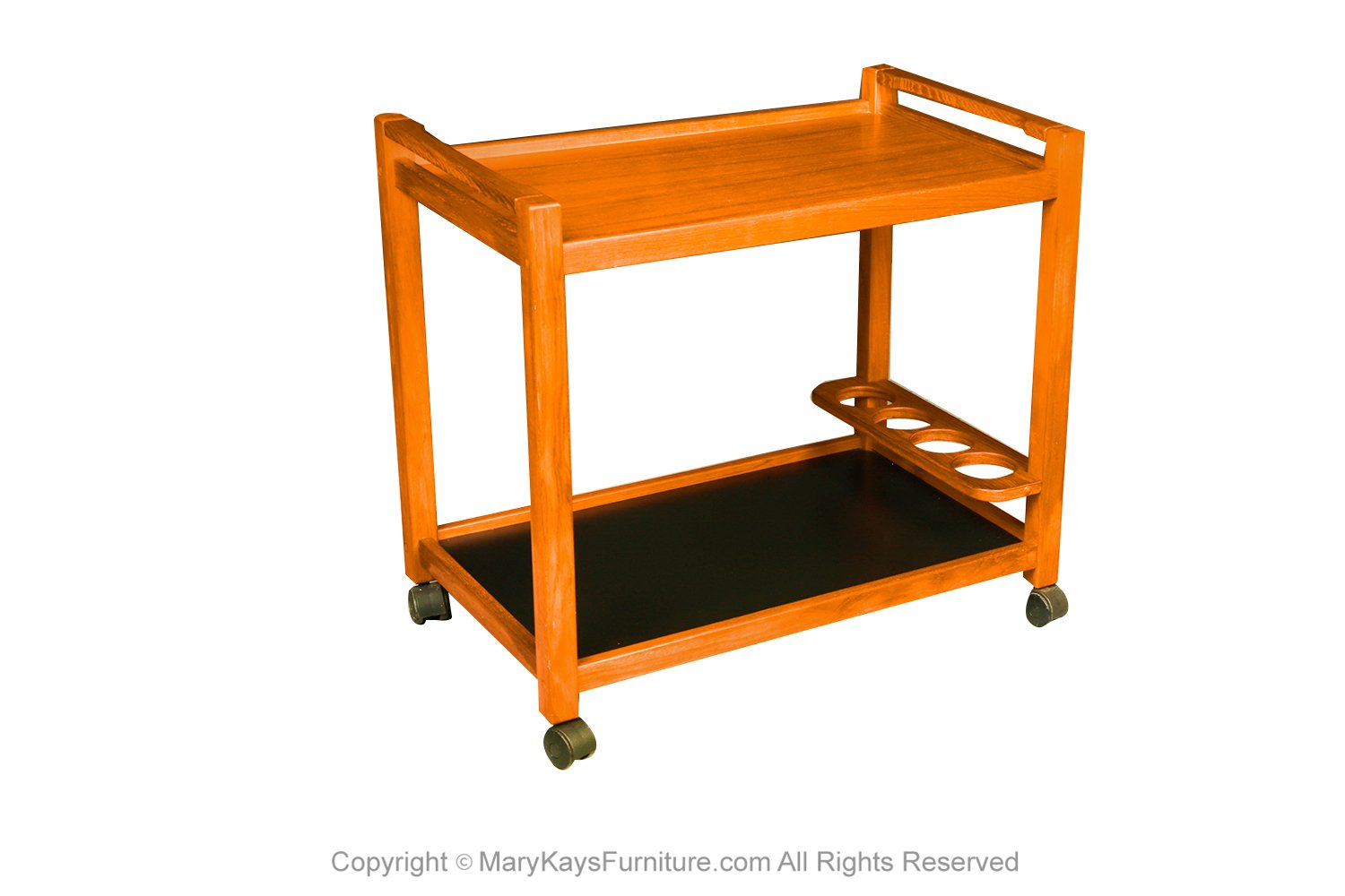 A classic mid-century teak serving bar cart made in Denmark, circa 1960s. Beautifully crafted from teak, this cleverly designed piece features a beautiful teak upper work surface, shelf. The lower shelf offers 4 bottle holders with a beautiful black laminate surface. The bar carts’ handle attaches to a simple straight edge that leads to graceful legs and terminates into casters. This stunning cart rolls over both hard and carpeted floors with four hooded oversized castors. An exemplary mid century bar cart with its simple form is enhanced by a rich warm patina that only develops with age. A wonderful example of mid century modern furniture this drink trolley will add to your family’s entertainment experience with its function and design. nCondition Report: Good with wonderful patina and wood grain patterns. Sturdy, slides easily, convenient for serving, wheels hardware intact and operates smoothly. n nPlace of Origin: Denmark nOf the Period: Mid Century Modern nDate of Manufacture: 1960’s nPeriod: 1960-1969 nMaterials and Techniques: Solid Teak and Teak Veneer nCondition: Good nWear: Wear consistent with age and use nMeasurements: 28 1/4” H x 19” deep x 31” wide n n