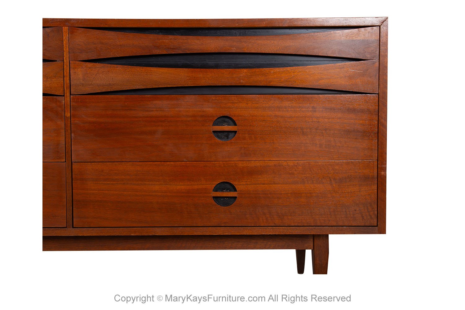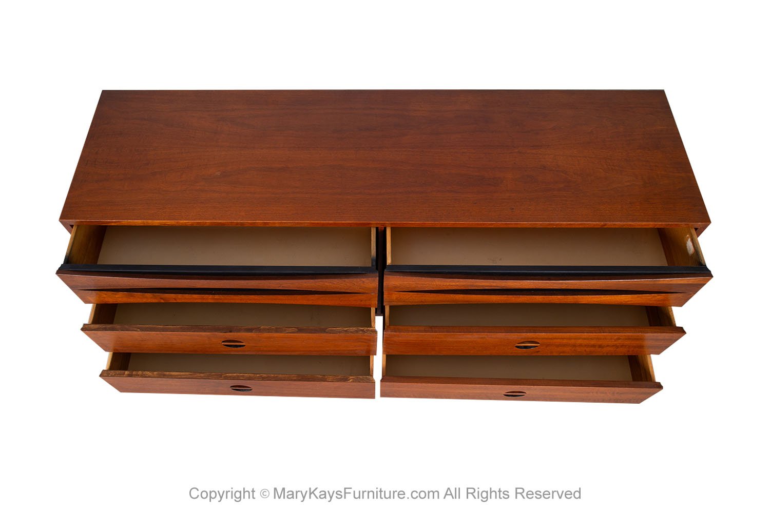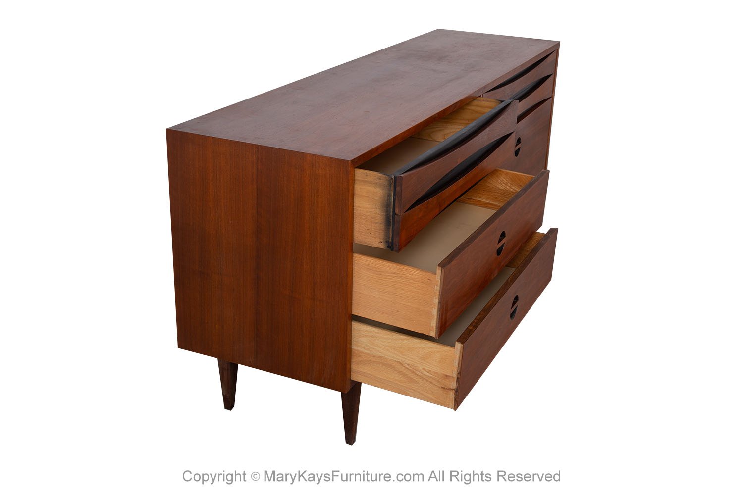 Attractive long mid-century modern 6 drawer dresser in the style of Arne Vodder by Michigan Furniture Company in the United States, circa 1960s. This beautiful dresser is a difficult to find style. An extremely well made and solid piece in great condition with simple elegant lines. Each drawer has a beautiful medium tone grain pattern with minimal inset pulls. At the pull of the 6 drawers, you will expose plenty of storage. The top drawers are in the style of Arne Vodder, adorned with sculpted bow tie recessed pulls. accented in black lacquer adding to the beauty of the dresser. The lower four spacious drawers with stylish, recessed circular drawer pulls, with black accent, complimenting the overall design. Expertly crafted, the dresser sits on solid Danish style legs. Traditionally used in the bedroom, this versatile piece with ample storage would be a stylish addition to any room in your home or office. nCondition Report: Overall good original vintage condition, only minor wear. Very sturdy, the interior is clean; drawers open and pull out smoothly; Overall, a very fine presentation. n nManufacturer: Michigan Furniture Company nOf the Period: Mid-Century Modern nDate of Manufacture: Ca. 1960s nMaterials and Techniques: Walnut, Lacquered Wood nCondition: Good nWear: Wear consistent with age and use. nMeasurements: 60_ Long x 17 1/2_ deep x 29 5/8_ tall n n