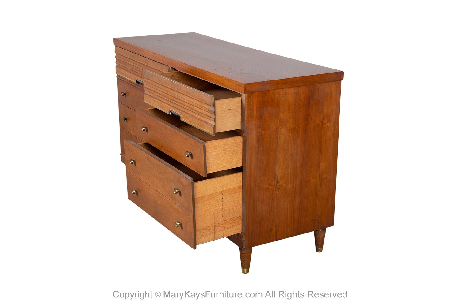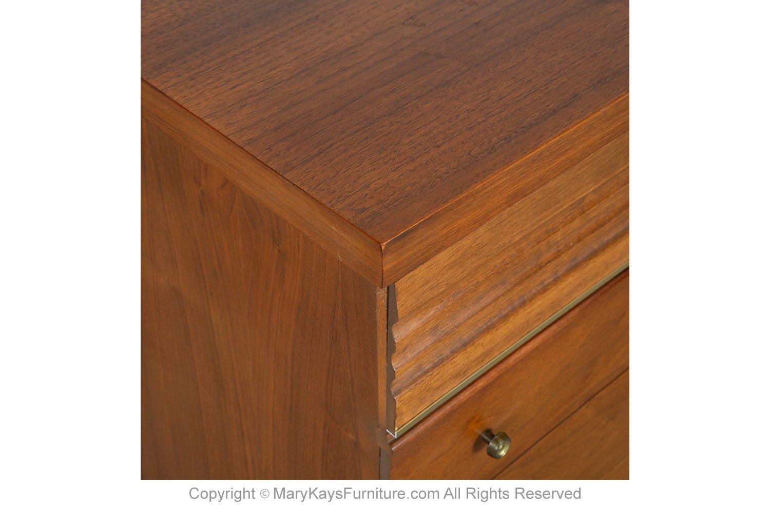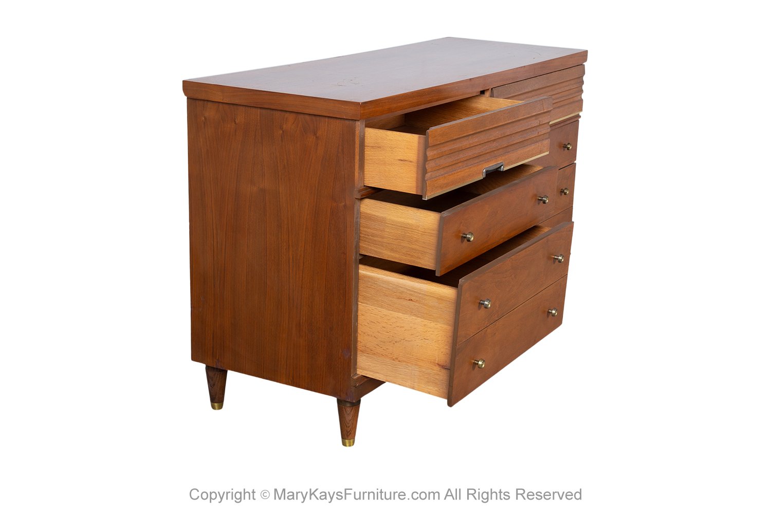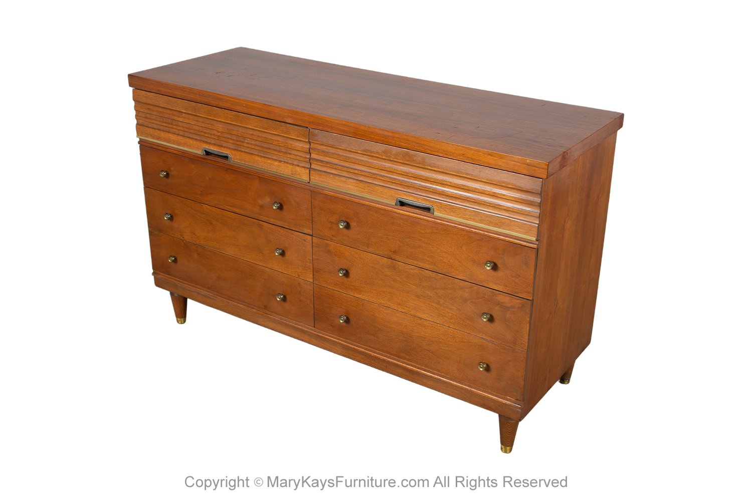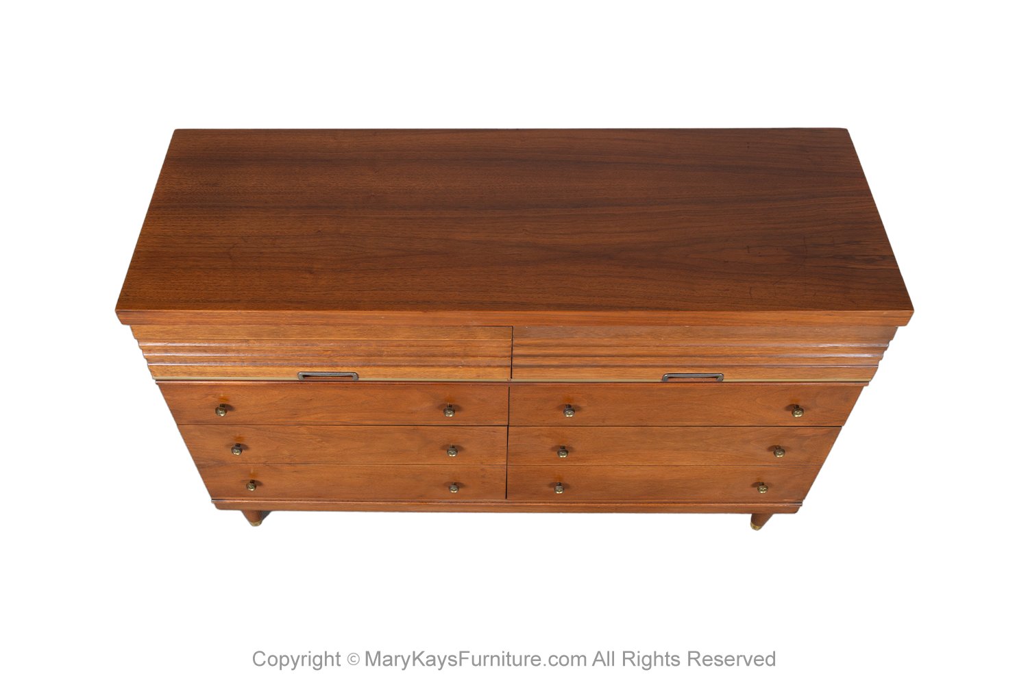 An exceedingly well-crafted, detailed, proportioned walnut 6 drawer dresser. This beautiful dresser is a difficult to find style. An extremely well made and solid piece in great condition with simple elegant lines. Each drawer has a beautiful medium tone grain pattern with minimal pulls. At the pull of the 6 drawers, you will expose plenty of storage. The top drawers are adorned with sculpted recessed pulls. accented in a metal frame adding to the beauty of the dresser. The lower four spacious drawers with stylish, circular drawer pulls, complimenting the overall design. Expertly crafted, the dresser sits on solid Danish style legs. Traditionally used in the bedroom, this versatile piece with ample storage would be a stylish addition to any room in your home or office. nCondition Report: Overall good original vintage condition, only minor wear. Very sturdy, the interior is clean; drawers open and pull out smoothly; Overall, a very fine presentation. n nManufacturer: Harmony House nPlace of Origin: United States nPeriod: 1970-1979 nMaterials and Techniques: Walnut nCondition: Good original nWear: Wear consistent with age and use, Minor wear nMeasurements: 31 1/8_ tall x 49 7/8_ wide x 18 _ deep n n