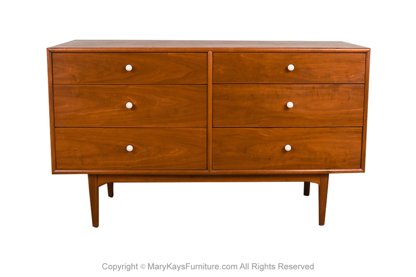 Beautiful Mid-Century Modern double dresser designed by Kipp Stewart and Stewart MacDougall for Drexel’s Declaration Collection, circa 1960’s. Featuring a solid, beautifully grained walnut wood case and frame, housing six drawers each is adorned with original white porcelain ball knobs on a brass fitting, creating a striking contrast to the walnut wood. The deep, long drawers offer ample room; Maker Stamp (by Drexel) on the inside of the top drawer. Each drawer has beautiful, stunning walnut grains, and easy gliding dovetail drawers, with exceptional craftsmanship. A recessed base of round tapered legs and apron provide stable support while conveying an airy “floating” effect. Additional Maker Stamp (Declaration by Drexel} on the back. Clean lines and timeless style, this showstopper will be an enhancing addition to any interior and blend beautifully with many décor styles. Ideal piece for a bedroom, living room, or entry.
