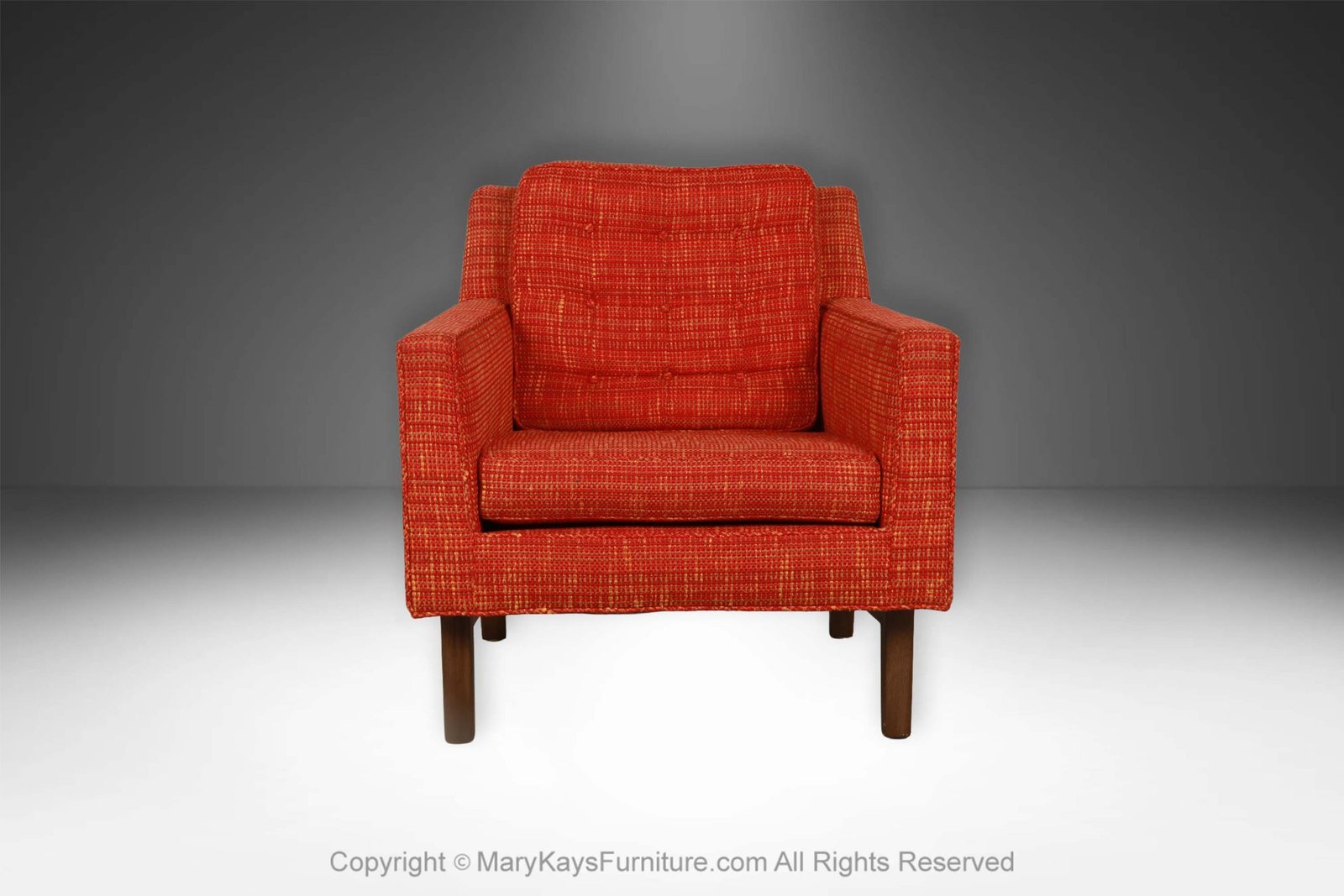 Mid-century modern stunning, beautiful, high quality lounge chair by Edward Wormley for Dunbar Furniture. In stunning original upholstery fabric and high-density foam. An exceptional chair both for its form and quality, it is a distinctive and heavily crafted work. This chair embodies the whimsical fervor of the period, set over stylish legs. The lounge chair has an amazing form, with stylishly angled arms, one loose single large seat cushion, and one removable back cushion. Making this chair just as comfortable as it is beautiful, with amazing form. This time capsule is an absolute treasure of a find for anyone passionate about excellent quality in their collection. A very comfortable piece, having distinctive characteristics of its time, crafted to last many generations, remains young in years. It is an investment quality selection, bringing visual interest and pleasure to any modern home for years to come.