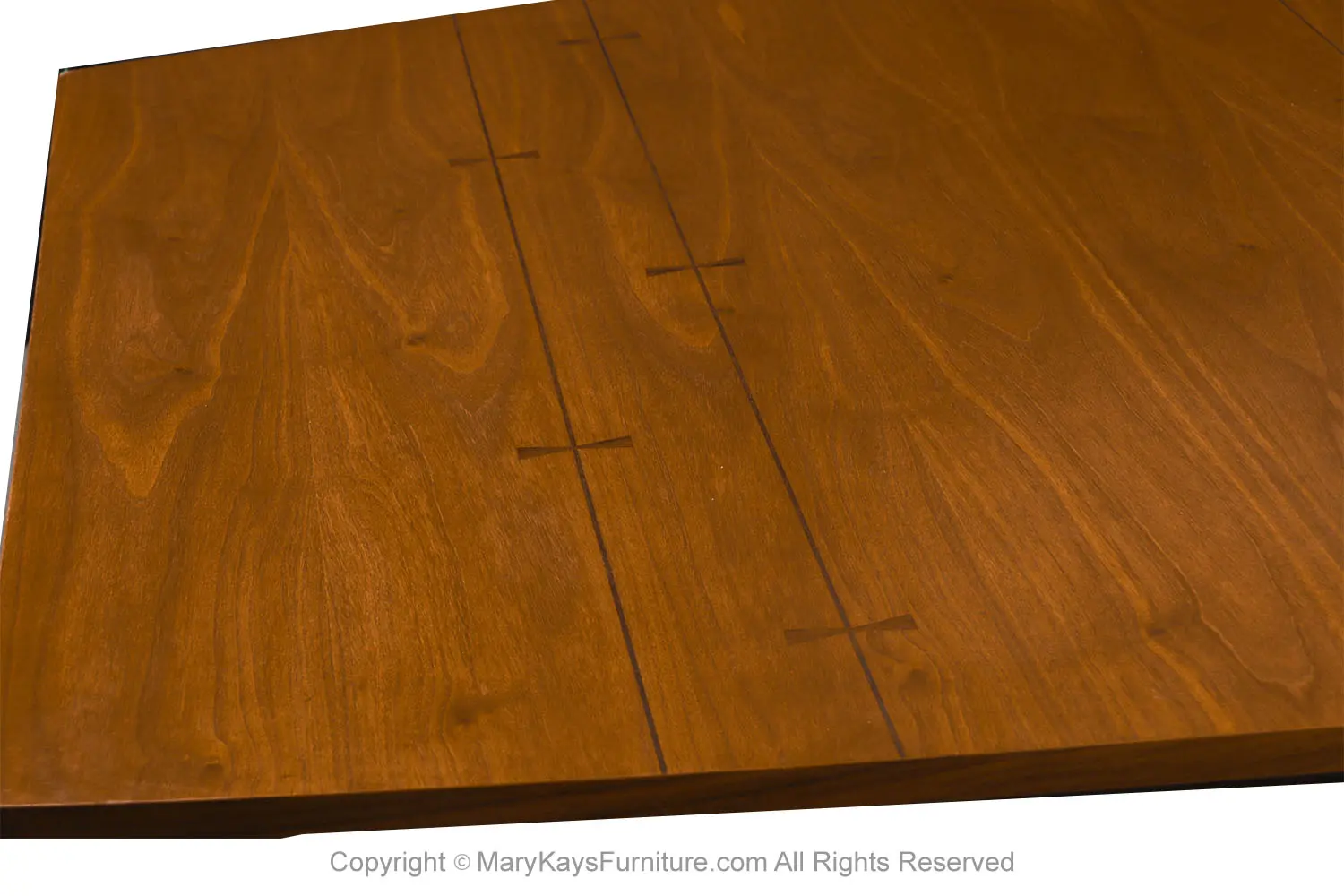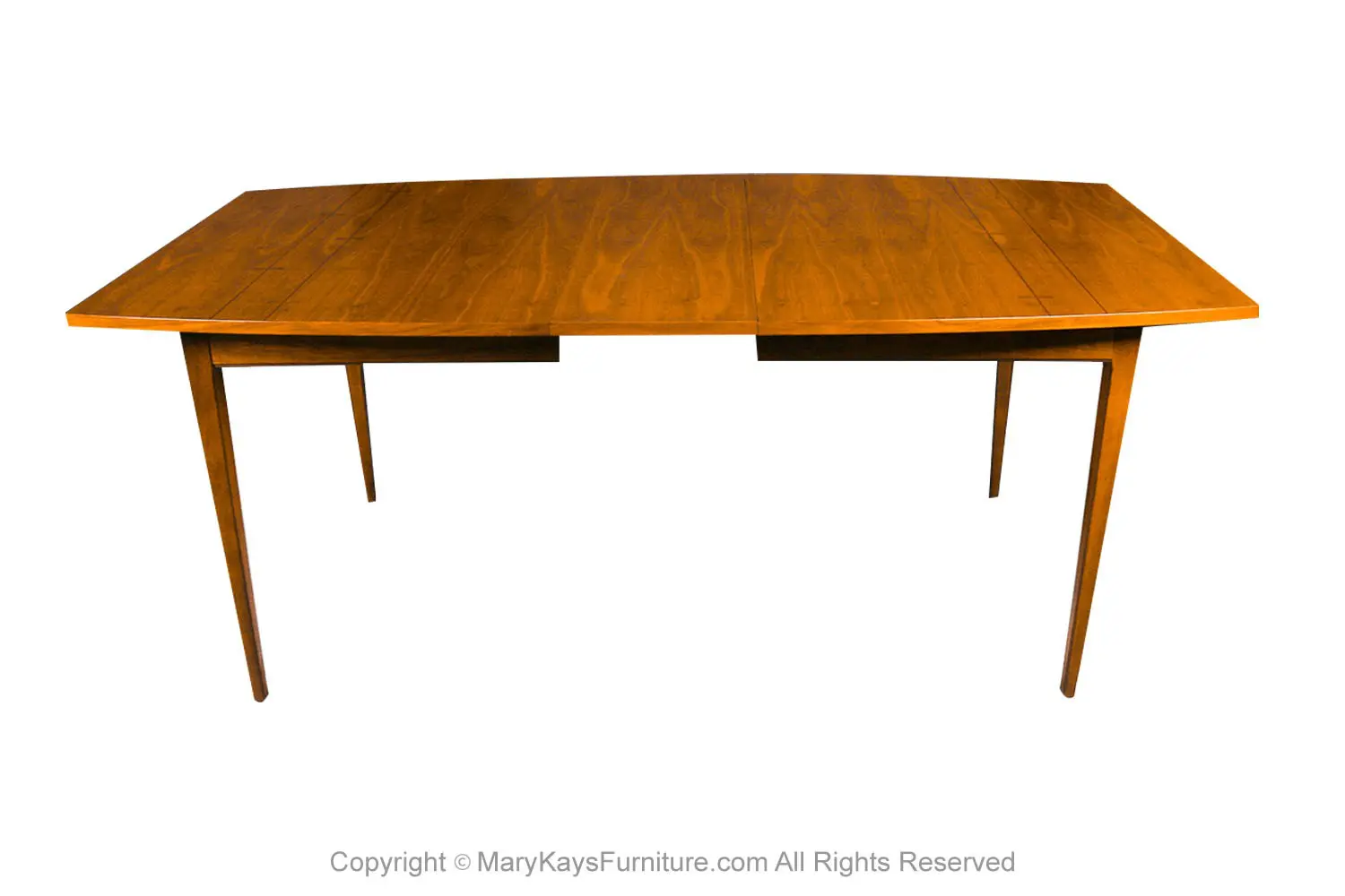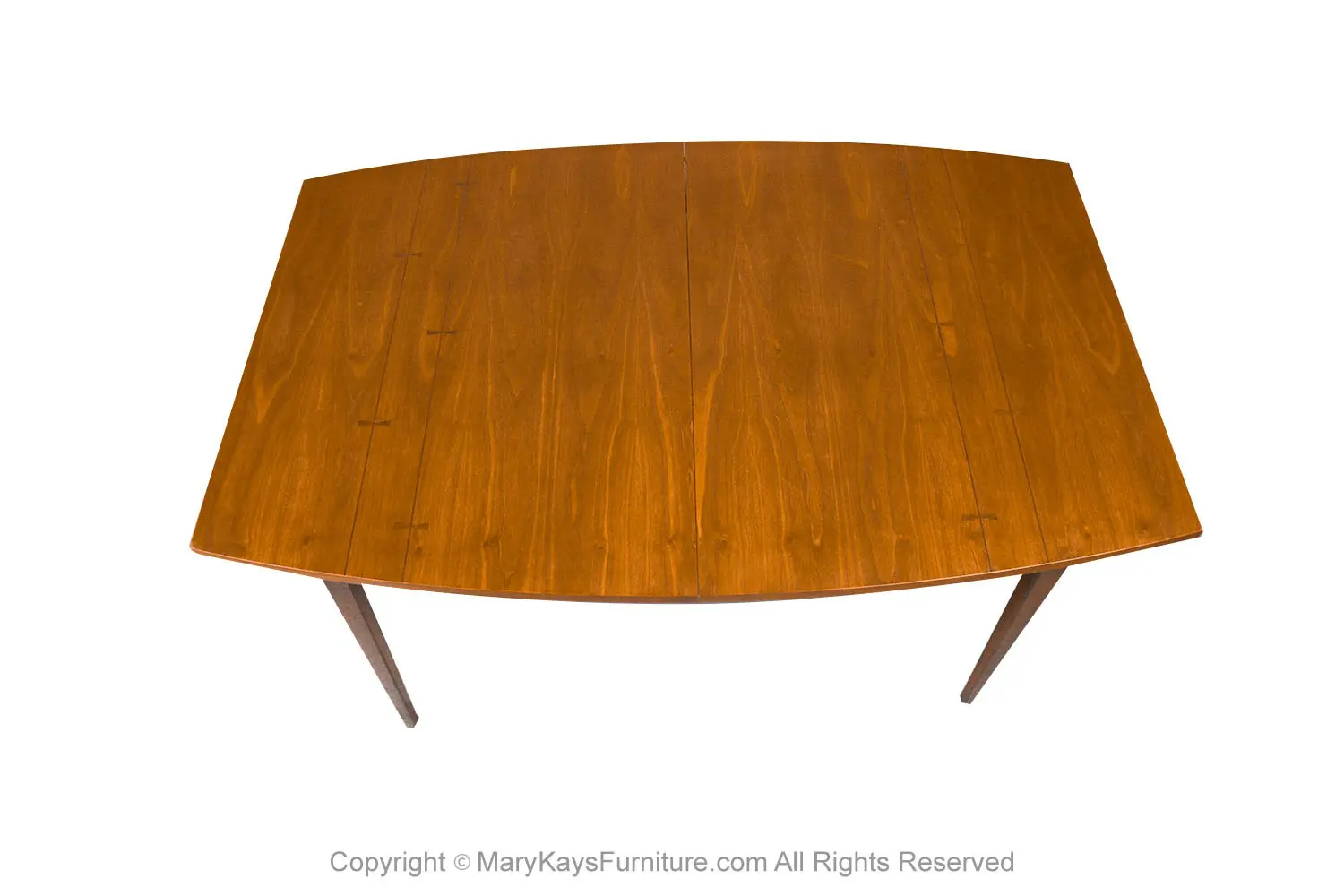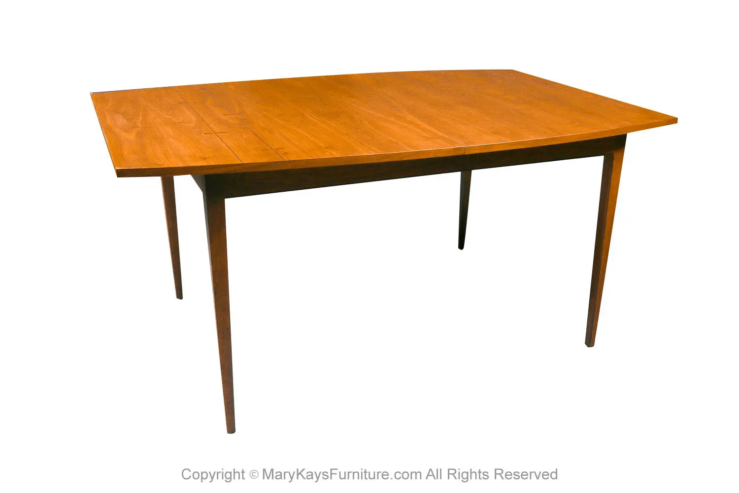 Beautiful Mid-Century Modern expandable, Bow Tie Tuxedo Dining Table, in great original condition, manufactured by Lane. Features richly grained, walnut top clean lines accented with ebony pinstripes and rosewood inlaid bow ties. Raised over four tapered legs, creating a clean and elegant profile. This remarkable dining table comes with one extension leaf to accommodate extra seating, transforming seating capacity from four to six. With one leaf inserted, this table expands to n74_ long! Well-crafted, fully extended, it becomes a large table and without the leaf the table is a perfect size for small areas, measuring 62_ wide characteristically sleek and functional and exudes an aesthetic beauty as well making it perfect for the modern interior. Also, available walnut Dining chairs (sold separately). Perfect table for a kitchen or dining room, and due to size flexibility, will function wonderfully in a small or large space. nCondition Report: Base is stable and sturdy; wood shows minimal wear; extension hardware operates smoothly. n n nCreator: Lane (Manufacturer) nOf the Period: Mid-Century Modern nPlace of Origin: United States nDate of Manufacture: 1960s nPeriod: 1960-1969 nMaterials and Techniques: Walnut nCondition: Good nWear: Wear consistent with age and use nMeasurements: 62” W x 42” D x 29 1/2” T; fully extended 74” W with the leaf n