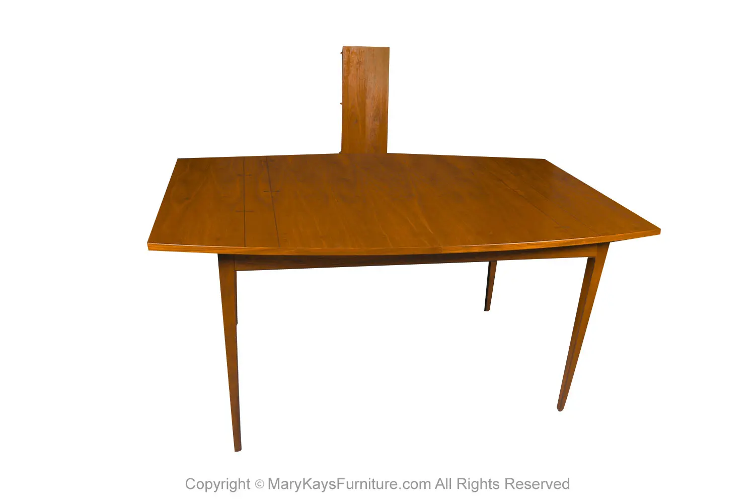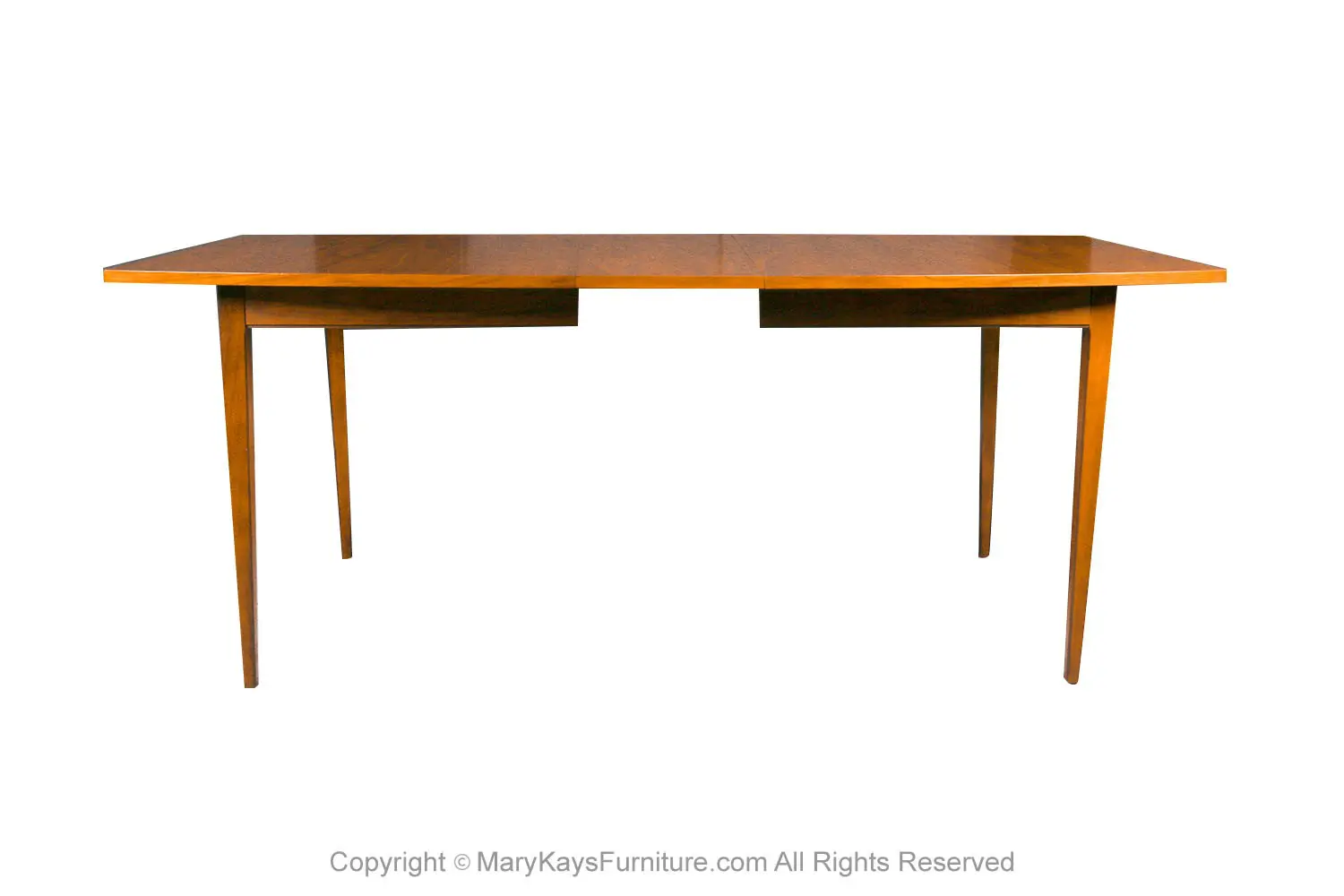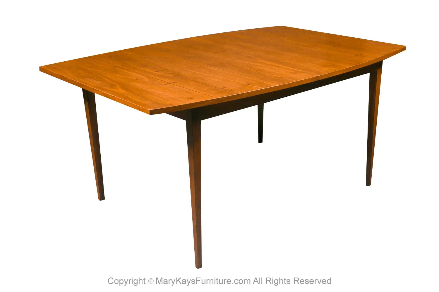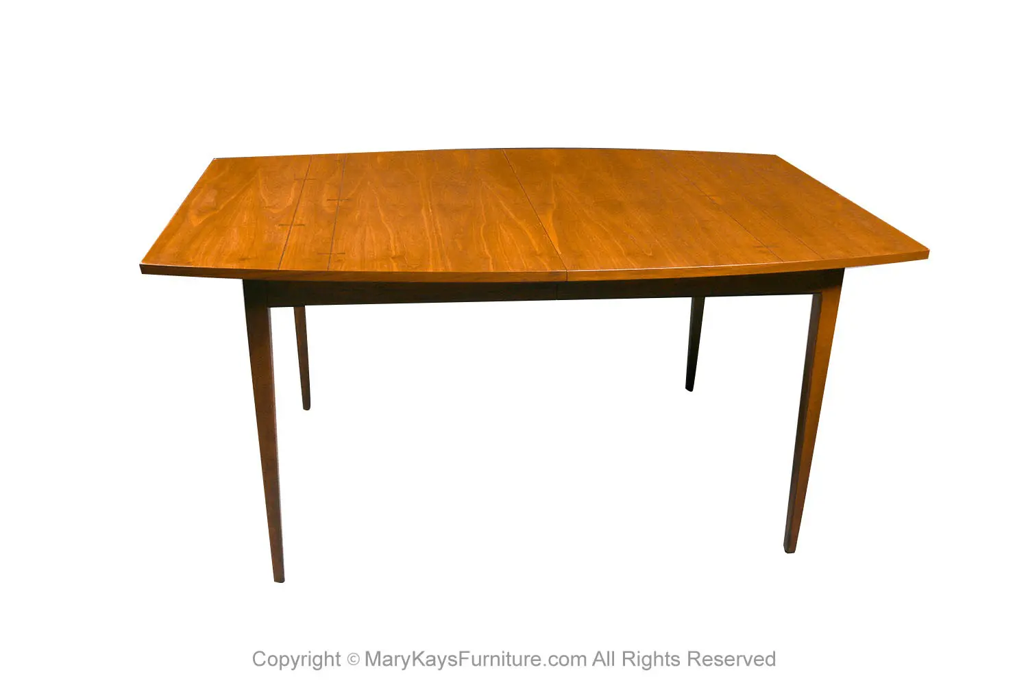 Beautiful Mid-Century Modern expandable, Bow Tie Tuxedo Dining Table, in great original condition, manufactured by Lane. Features richly grained, walnut top clean lines accented with ebony pinstripes and rosewood inlaid bow ties. Raised over four tapered legs, creating a clean and elegant profile. This remarkable dining table comes with one extension leaf to accommodate extra seating, transforming seating capacity from four to six. With one leaf inserted, this table expands to n74_ long! Well-crafted, fully extended, it becomes a large table and without the leaf the table is a perfect size for small areas, measuring 62_ wide characteristically sleek and functional and exudes an aesthetic beauty as well making it perfect for the modern interior. Also, available walnut Dining chairs (sold separately). Perfect table for a kitchen or dining room, and due to size flexibility, will function wonderfully in a small or large space. nCondition Report: Base is stable and sturdy; wood shows minimal wear; extension hardware operates smoothly. n n nCreator: Lane (Manufacturer) nOf the Period: Mid-Century Modern nPlace of Origin: United States nDate of Manufacture: 1960s nPeriod: 1960-1969 nMaterials and Techniques: Walnut nCondition: Good nWear: Wear consistent with age and use nMeasurements: 62” W x 42” D x 29 1/2” T; fully extended 74” W with the leaf n