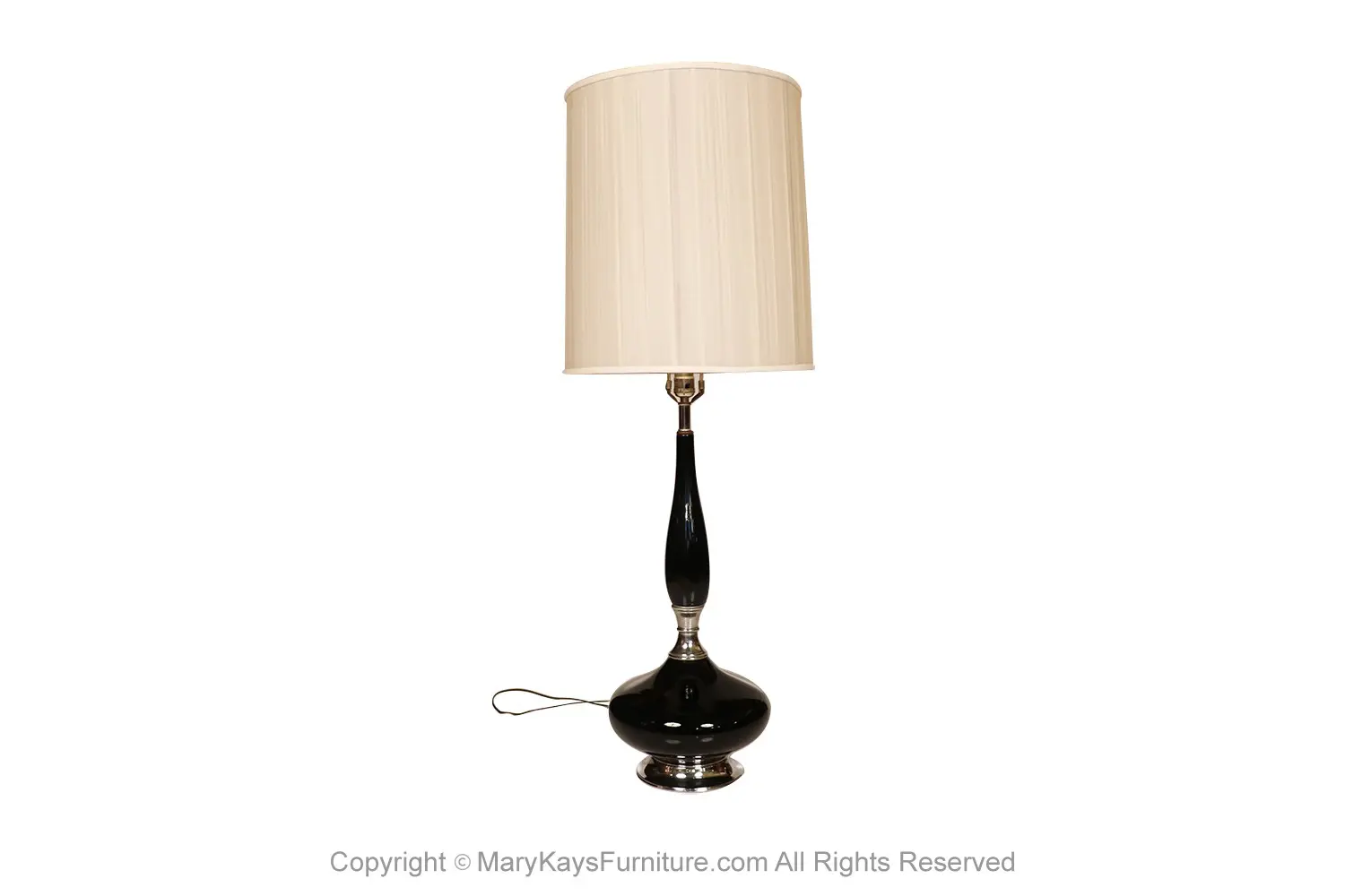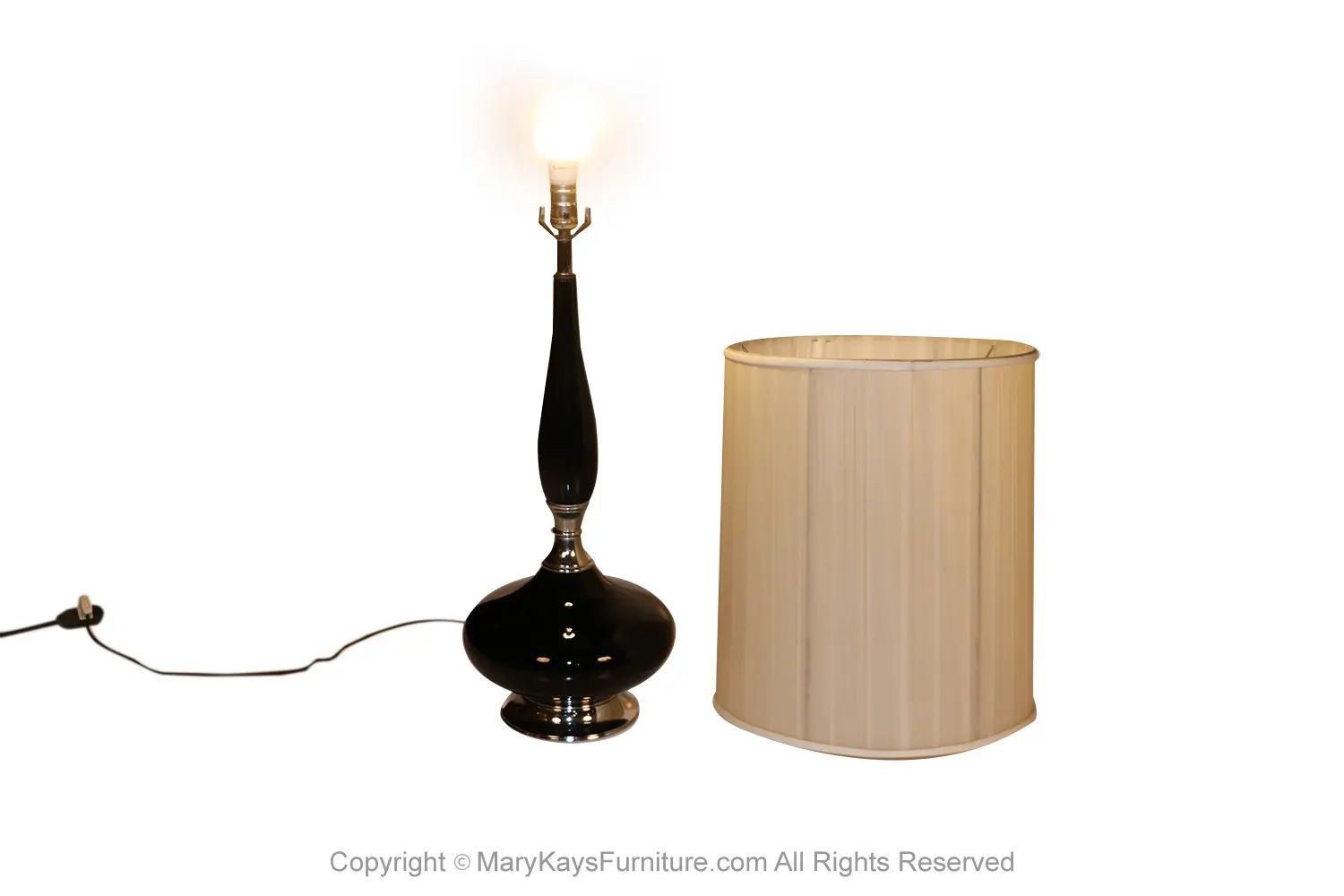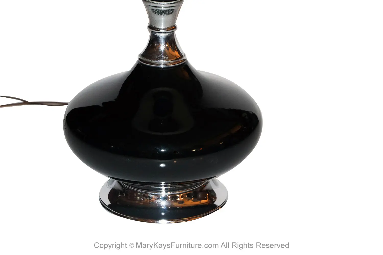 This is a stunning and very sought-after mid century, Hollywood Regency, ceramic table lamp with an elongated neck, over bulbous form, raised on a chrome base, finished off with this beautiful drum lampshade included, featuring a vibrant shiny black ceramic finish, with chrome accents. Add this bold vintage 20th century Hollywood Regency lamp to your interior style. Perfect for enhancing your Mid Century Modern, Hollywood Regency, Palm Beach, Urban Chic, Art Deco or Hospitality Collection home.