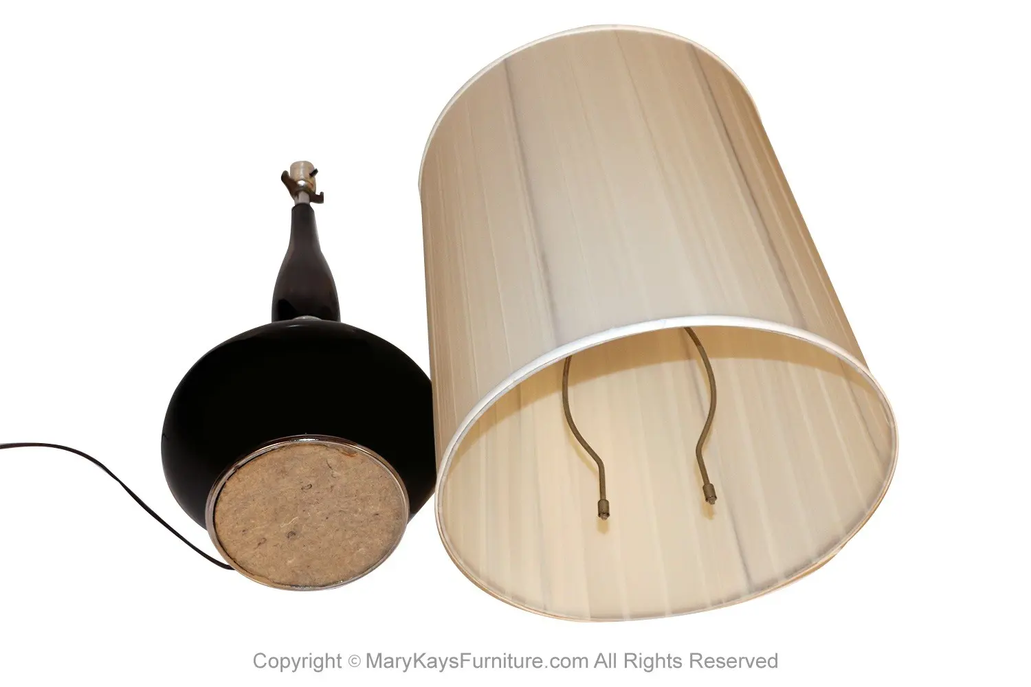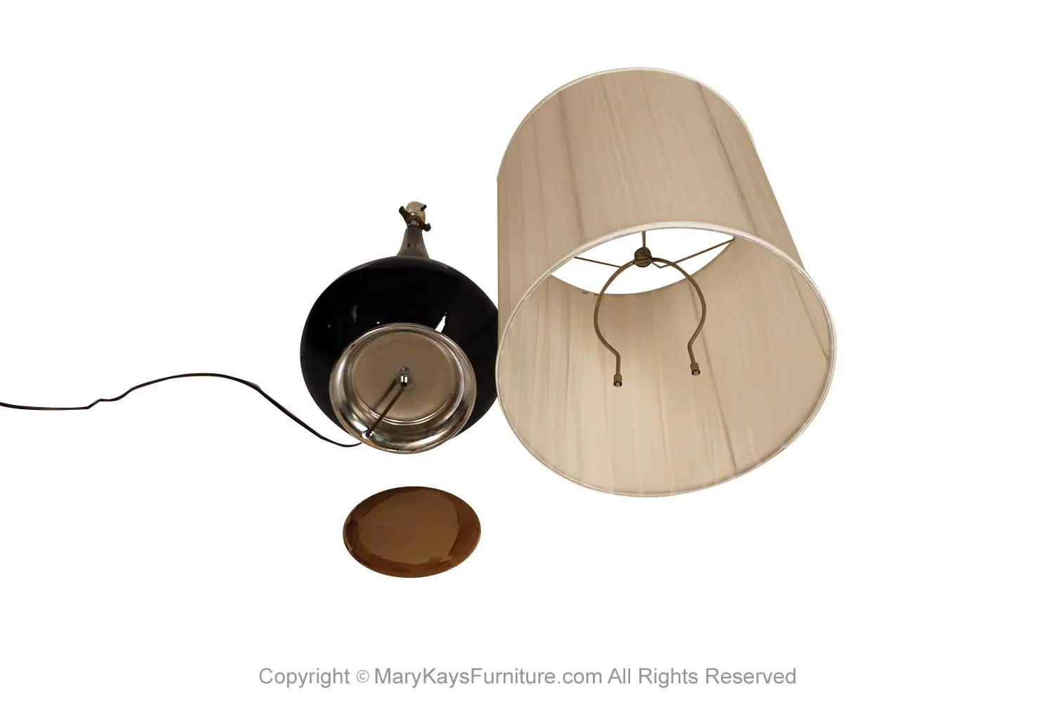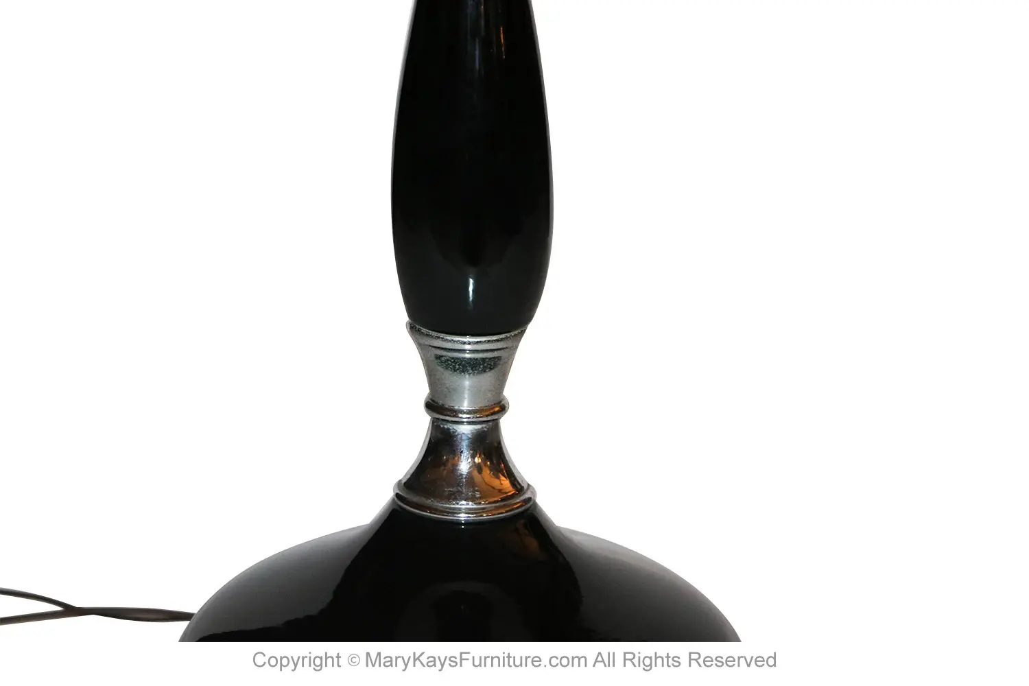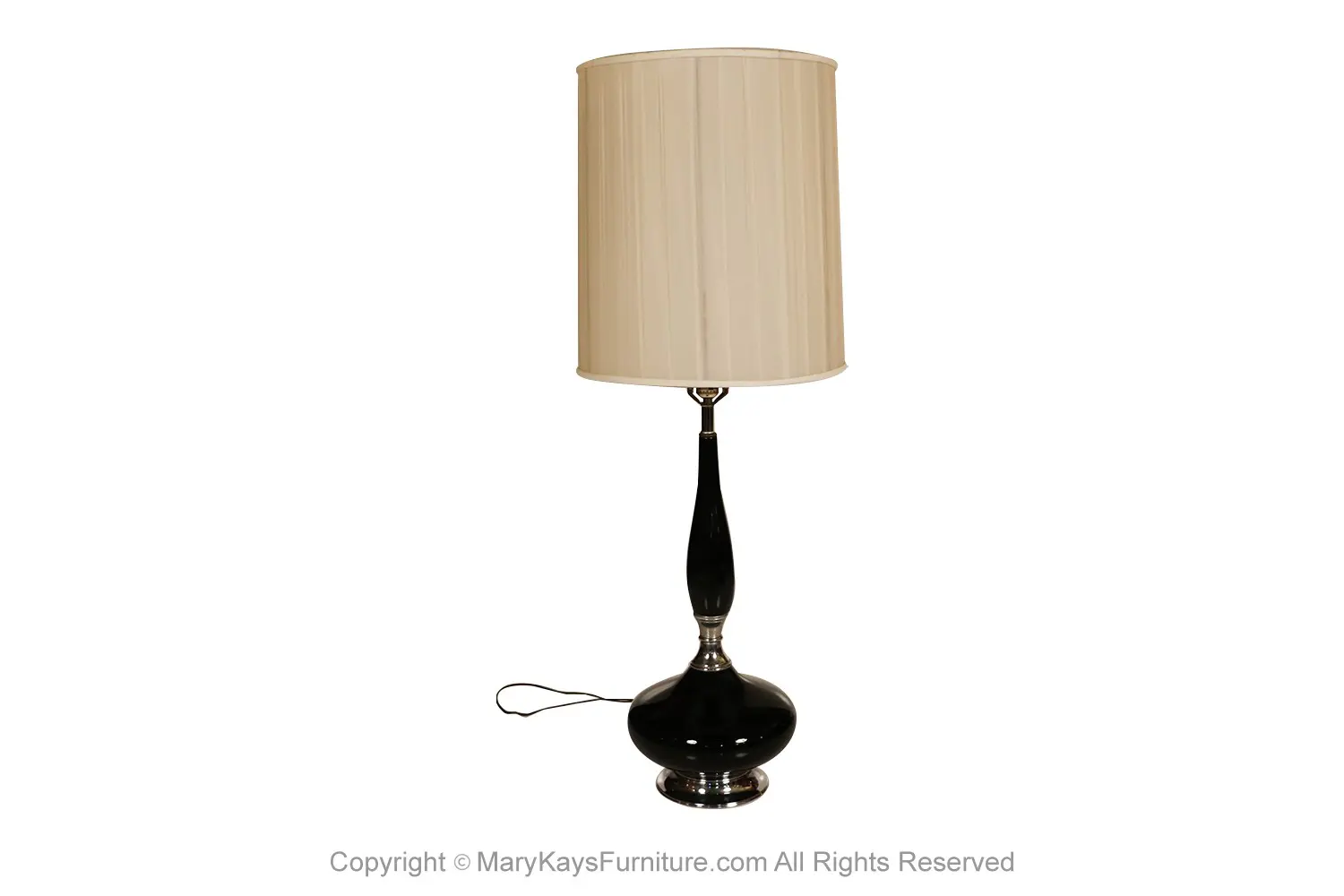 This is a stunning and very sought-after mid century, Hollywood Regency, ceramic table lamp with an elongated neck, over bulbous form, raised on a chrome base, finished off with this beautiful drum lampshade included, featuring a vibrant shiny black ceramic finish, with chrome accents. Add this bold vintage 20th century Hollywood Regency lamp to your interior style. Perfect for enhancing your Mid Century Modern, Hollywood Regency, Palm Beach, Urban Chic, Art Deco or Hospitality Collection home.