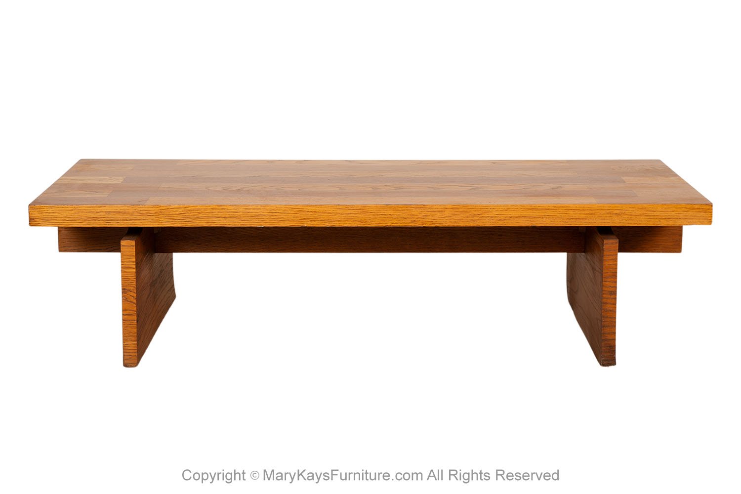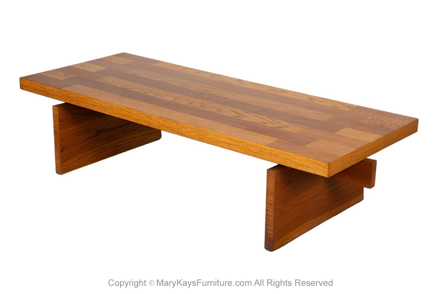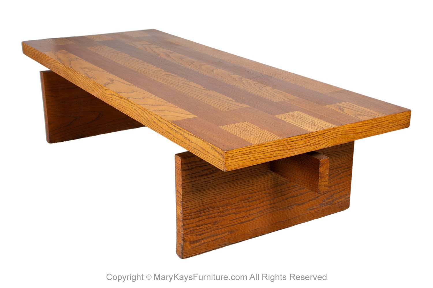 A beautiful coffee table /bench by Lane Furniture Co. in a chunky Brutalist style. Featuring semi parquet oak on top, in a vivid contrast against the surface, with a dramatic, wide square top resting on a trestle style base. Extremely versatile with solid architectural design elements. Strong and sturdy, shows true quality craftsmanship by Lane Furniture Co. Add style and function to your living room or bedroom, the wide square top provides plenty of space for placing items. Hearty American construction. Lavish proportions, premium construction and beautiful materials have created an enduring legacy of American mid-century furniture. nCondition Report: Original finish, exhibit little signs of wear, with typical scuffs, overall gorgeous surface condition. Construction is strong and sturdy. n nCreator: Lane Furniture (Manufacturer) nOf the Period: Post-modern nPlace of Origin: United States nPeriod: Late 19th century nMaterials and Techniques: Wood nCondition: Good nWear: Wear consistent with age and use nMeasurements: 15 1/2” tall x 60_ wide x 24_ deep n n