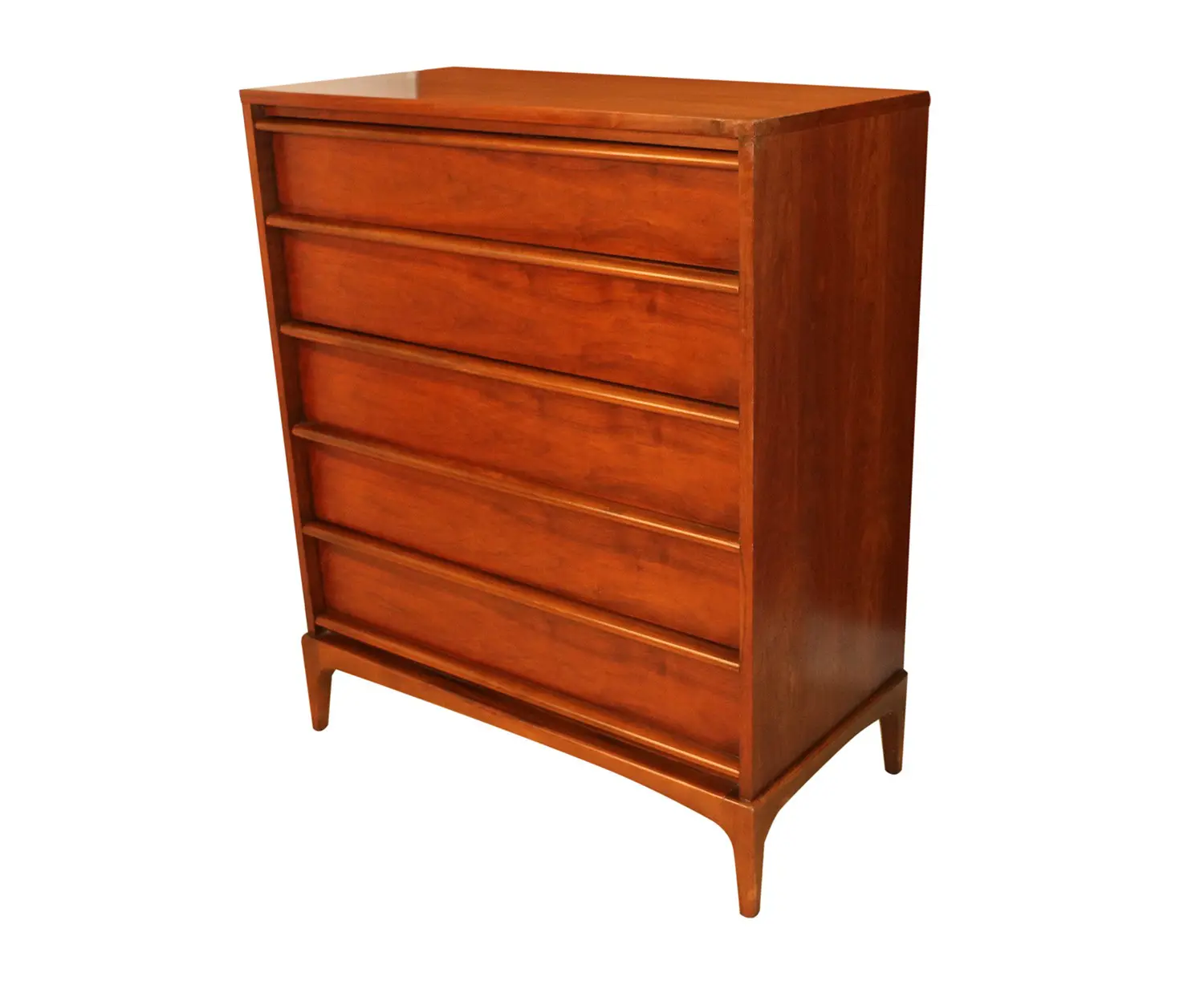 This is a beautiful example of Mid-Century craftsmanship by Lane furniture. This tallboy dresser is part of the Rhythm collection by Lane, built in the 1960’s, to have a style that was timeless then, and still is today. This retro piece was constructed with top of the line hardware, and excellently crafted woodwork. Dresser is solid hardwood, with beautiful walnut veneer. No plywood or press board here. Drawers are dovetail construction marked, with metal drawer glides. Five Solid Wood Oval Drawer Pulls. Vintage Lane furniture pieces are highly coveted, collectible designs in the United States. Lane was famous for its on-point design of the time and progressive use of luxury materials. Perfect addition to any room. nCondition Report: In overall good original vintage condition, only very minor wear from age, small repair to upper right corner show in photo. Construction is strong and sturdy. Matching Long Dresser also available for sale (sold separately). n nManufactured: Lane Furniture nCountry: United States nDate of Manufacture: 1960’s nPeriod: 1960-1969 nMaterials and Techniques: Walnut veneer nCondition: Good Solid Wood Construction nWear: Wear consistent with age and use nMeasurements: 43 1/2_ Tall x 36_ Wide x 18.5_ Deep