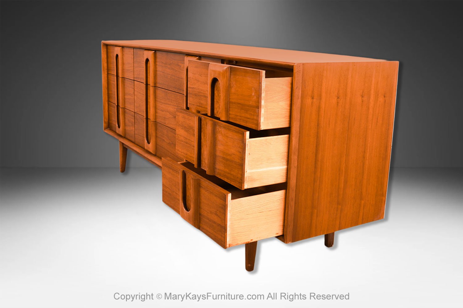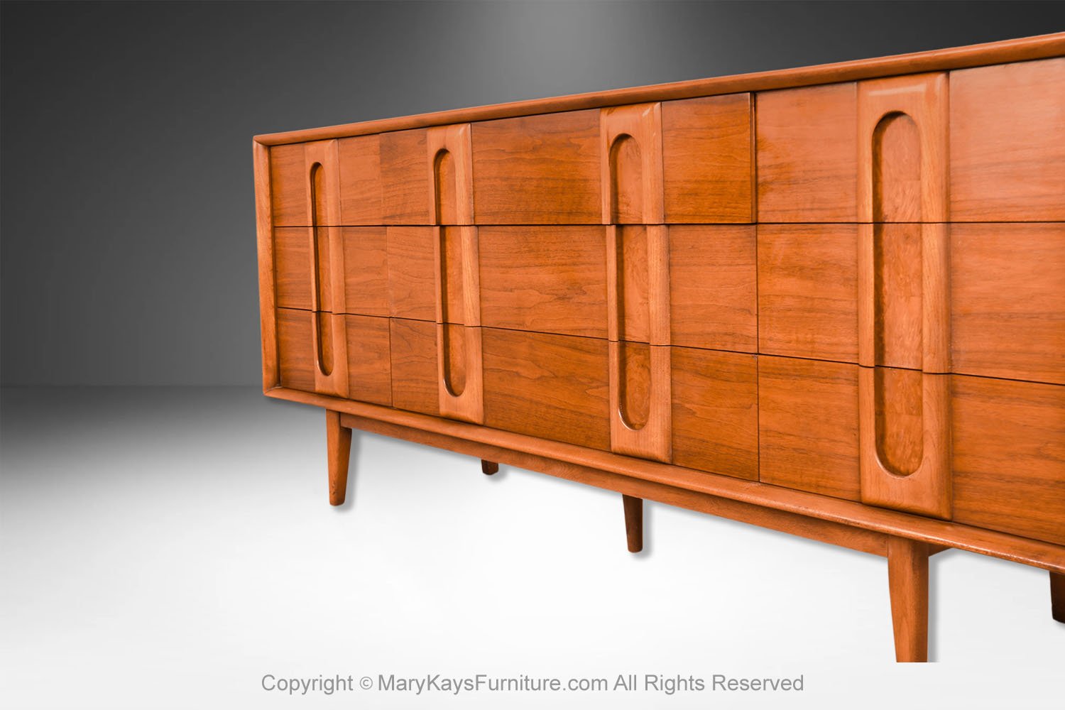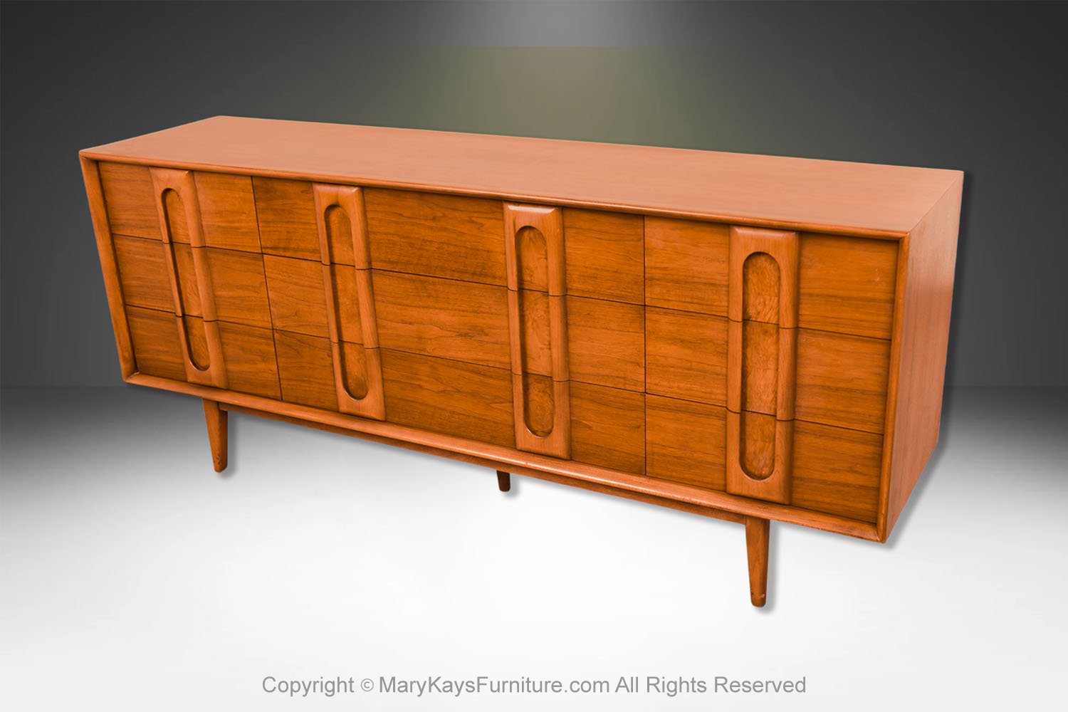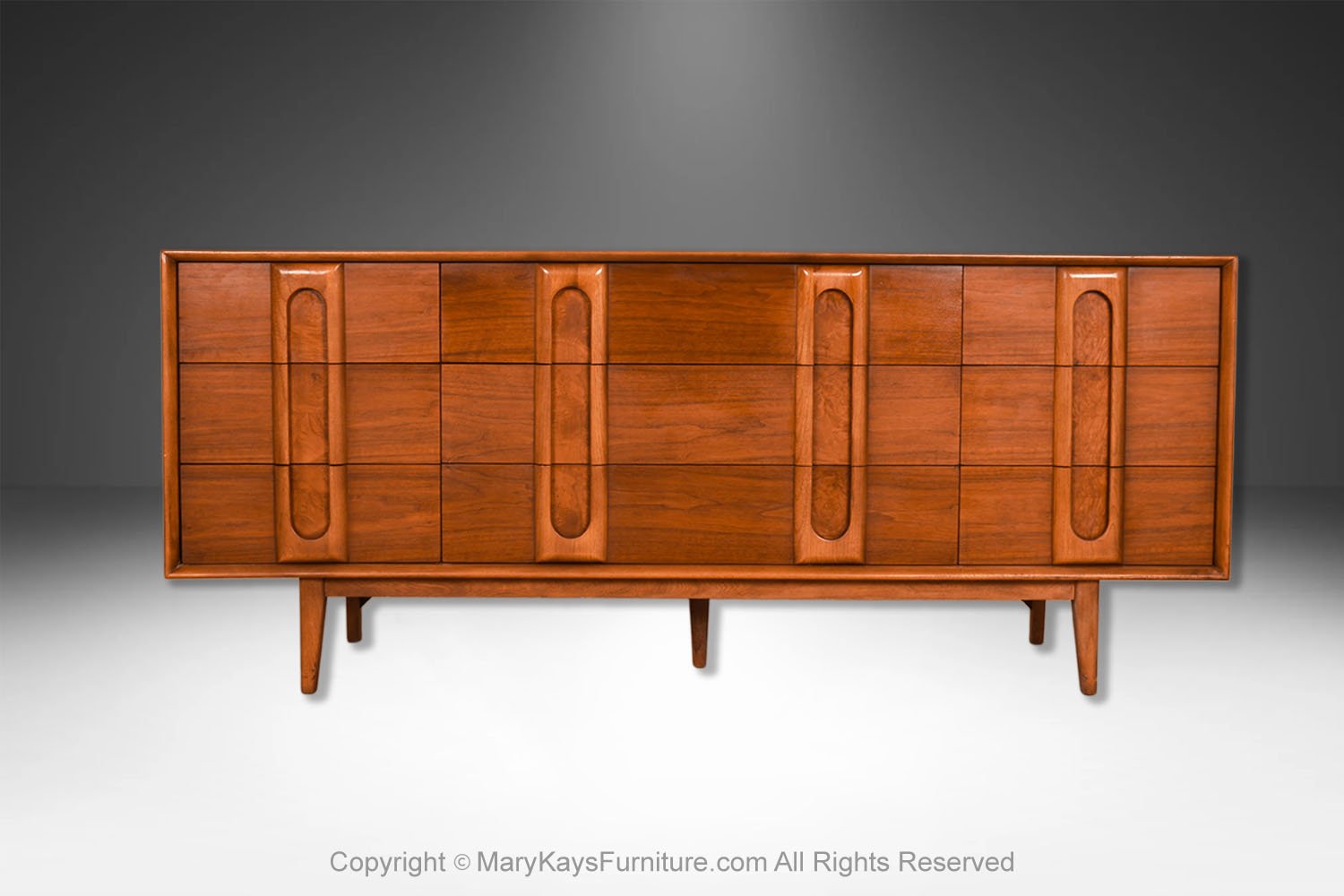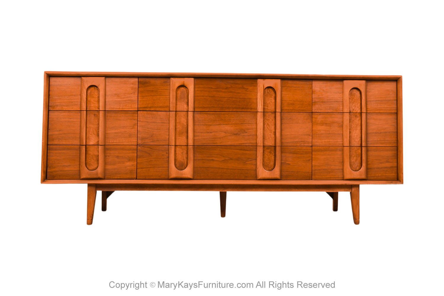 An elegant Mid-Century Modern Lane 9-Drawer Dresser c. 1960s. This is a beautiful example of Mid-Century craftsmanship by Lane Furniture. This beautiful dresser is a difficult to find style. An extremely well-made and solid piece in great condition with simple elegant lines. Features beautifully front drawer design, accented with sculpture pulls the whole rest on recessed tapered feet. Makers Label on the inside of the top drawer (Lane Furniture). Attractive classic modernist quality and design piece for the modern interior. Please see other listings, for the accompanying, matching tall dresser, and nightstands available.