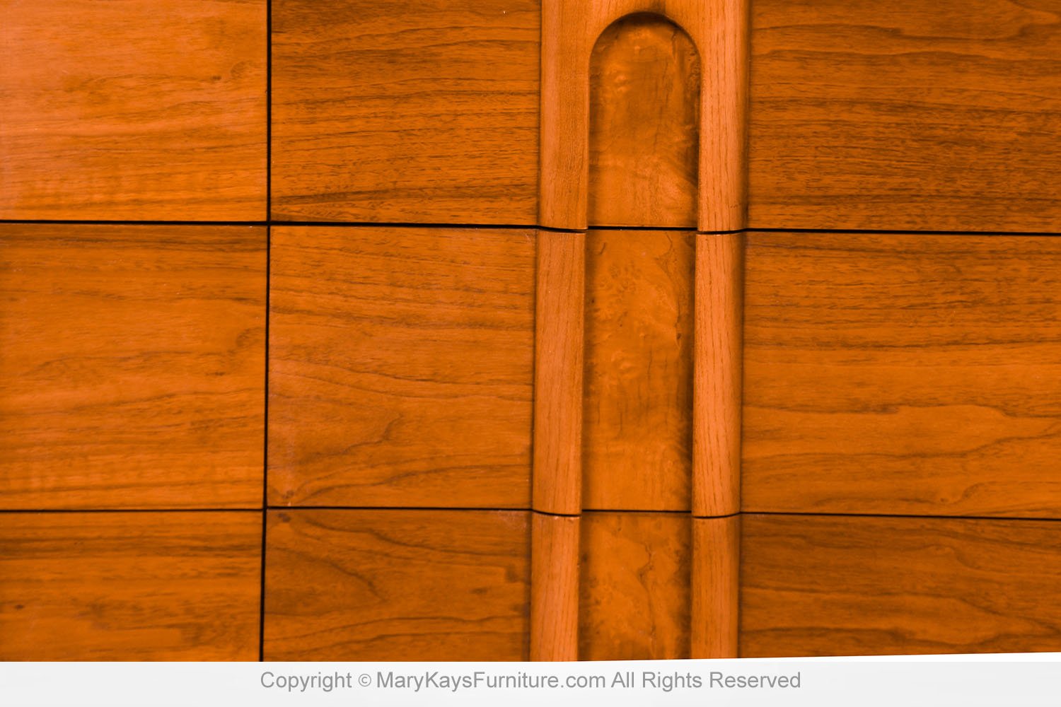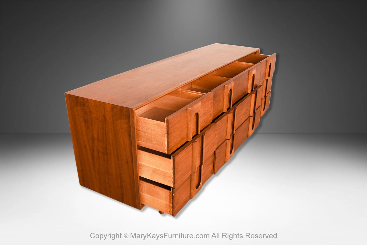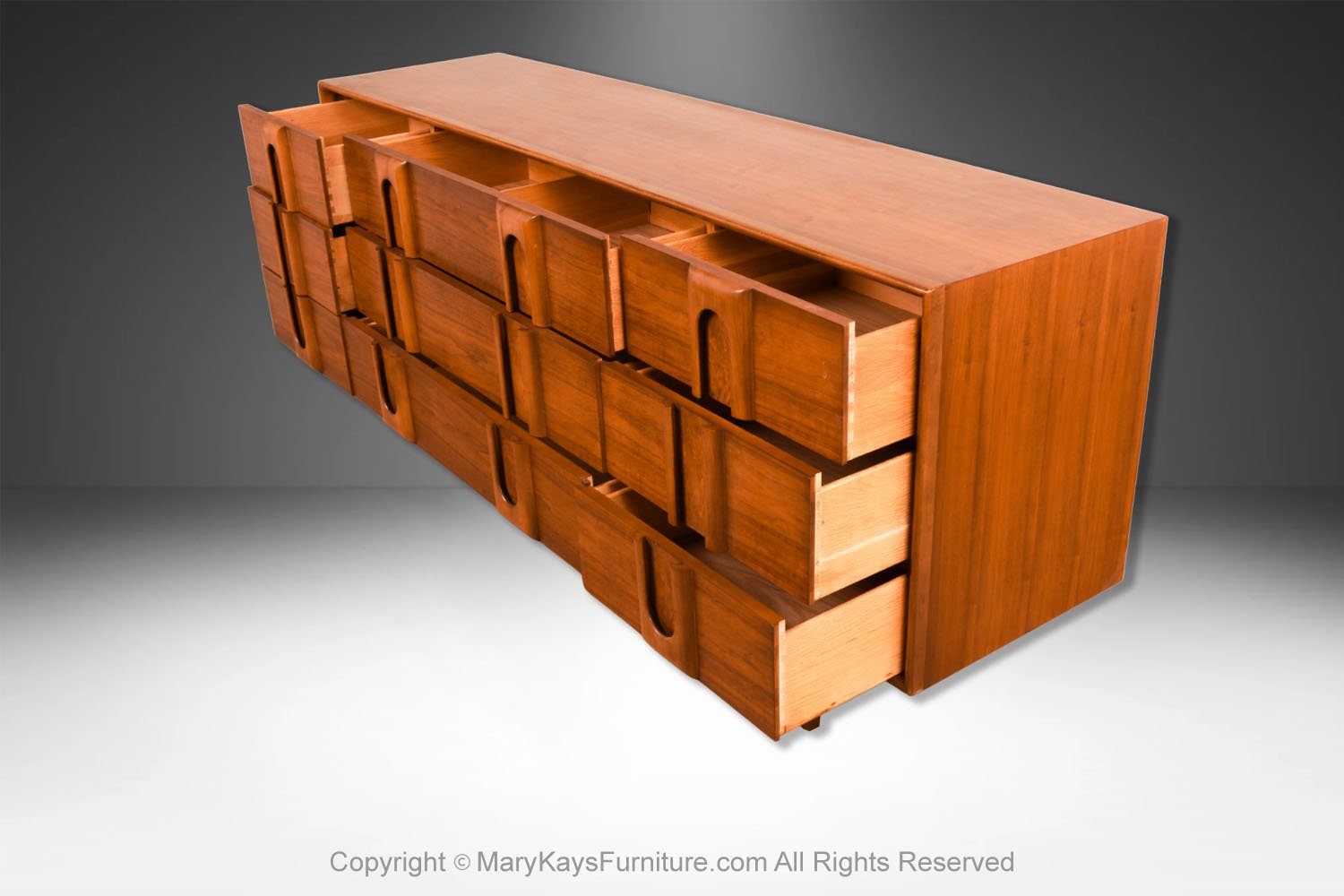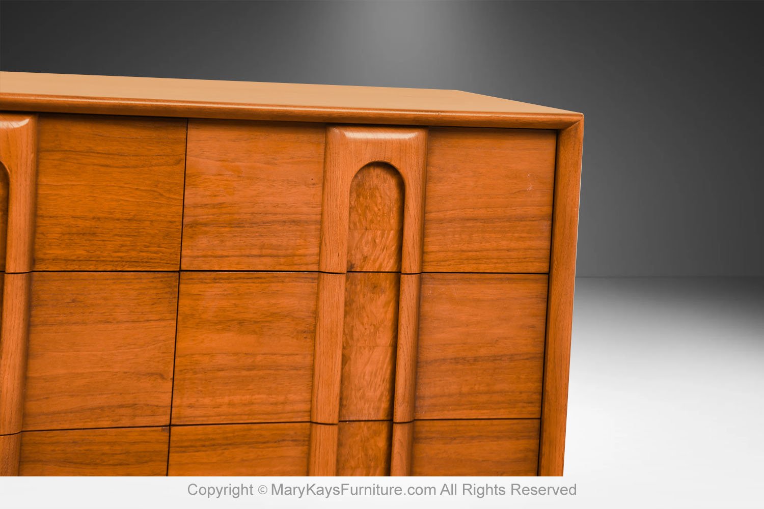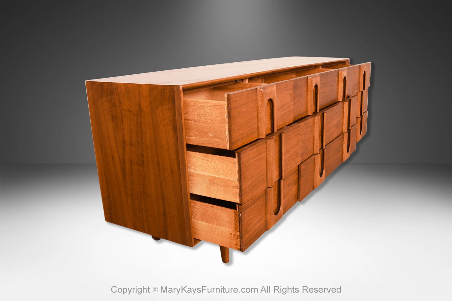 An elegant Mid-Century Modern Lane 9-Drawer Dresser c. 1960s. This is a beautiful example of Mid-Century craftsmanship by Lane Furniture. This beautiful dresser is a difficult to find style. An extremely well-made and solid piece in great condition with simple elegant lines. Features beautifully front drawer design, accented with sculpture pulls the whole rest on recessed tapered feet. Makers Label on the inside of the top drawer (Lane Furniture). Attractive classic modernist quality and design piece for the modern interior. Please see other listings, for the accompanying, matching tall dresser, and nightstands available.