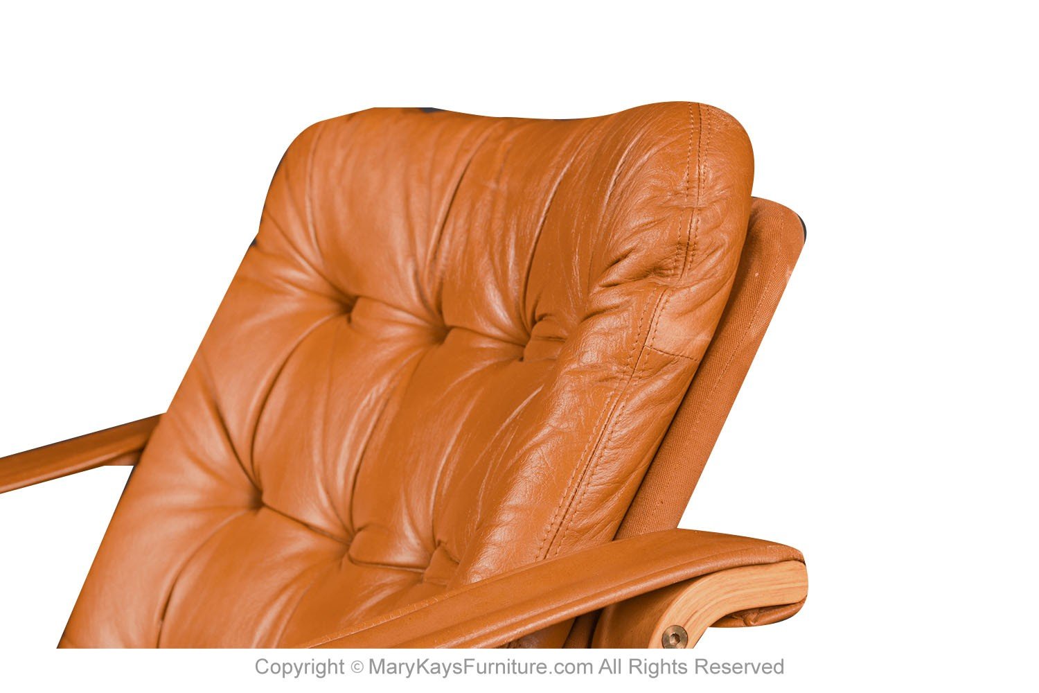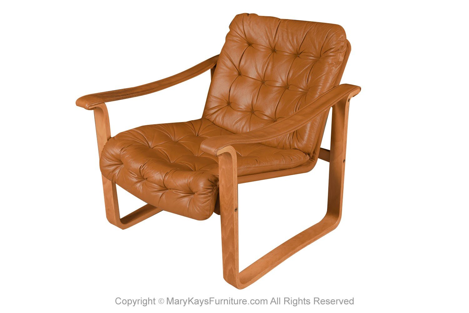 A beautiful Mid-Century Modern, stylish leather lounge, armchair by Oy BJ. Dahlqvist AB for BD Furniture Finland, circa 1960s. Features original rich, soft patinated light cognac leather upholstery, supported by a canvas back, and bentwood frame. The chair is made with padded headrests providing neck and lumbar support. The sling leather armrests, formed with perfection as they flow seamlessly to meet the frame. The beautiful leather is accented with tufted detailing and stitching, creating a handsome and inviting presence. Retaining its original makers label on the underside (OY BJ Dahlqvist AB Finland). The beautiful golden light colored wood frame complements the leather, providing a striking contrast. Simple lines and Scandinavian styling. Beautiful lounge chairs, manufactured by Westnofa in Norway, are among the most exceptional chairs made. A comfortable addition to any interior. nCondition Report: Exhibit little signs of wear, frames are in good strong, structural condition. Original leather upholstery in good condition, has very little fading. Construction is strong and sturdy. n n nCreator: OY BJ Dahlqvist (designer) nManufacture: BD Furniture nOf the Period: Mid-Century Modern nPlace of Origin: Finland nDate of Manufacture: 1960’s nMaterials and Techniques: Wood, leather nCondition: Good nWear: Wear consistent with age and use nMeasurements: 30_ tall x 26.5_ wide x 33_deep x 16_ seat height x arm height 21.5″ tall n n