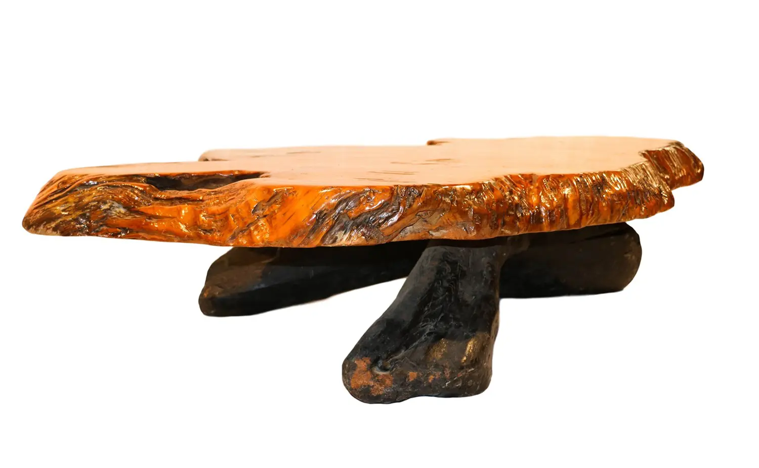 This impressive live edge wood tree slab Coffee Table features natural stump base hardwood construction with thick tree slab top. An exceptionally artful and large vintage, amorphous live edge table with natural tree trunk stump base. The brown top is paired perfectly with the black base this rustic appeal of this coffee table will make a beautiful addition to any interior great design and function, remains in outstanding original condition. Give your business or home a vintage appeal with this artful, solid stable table. n nOf the Period: Mid-Century Modern nDate of Manufacture: circa 1960s nPeriod: 1960-1969 nMaterials and Techniques: Wood nCondition: Good. Light age appropriate wear, some scratches/scuffs, light edge wear, vintage finish. nWear: Wear consistent with age and use. nMeasurements: 15in tall x 39in deep x 65in wide ( 5in thick top )