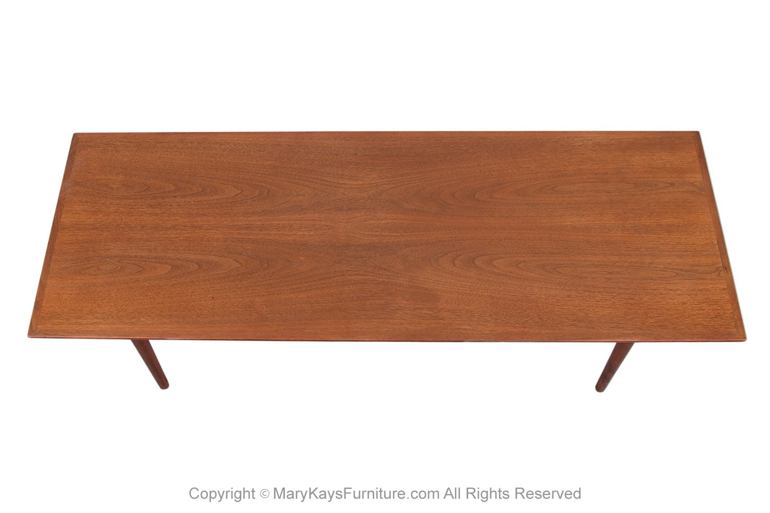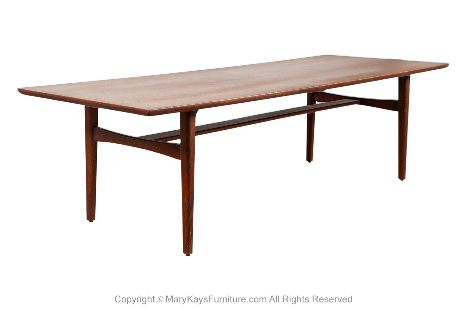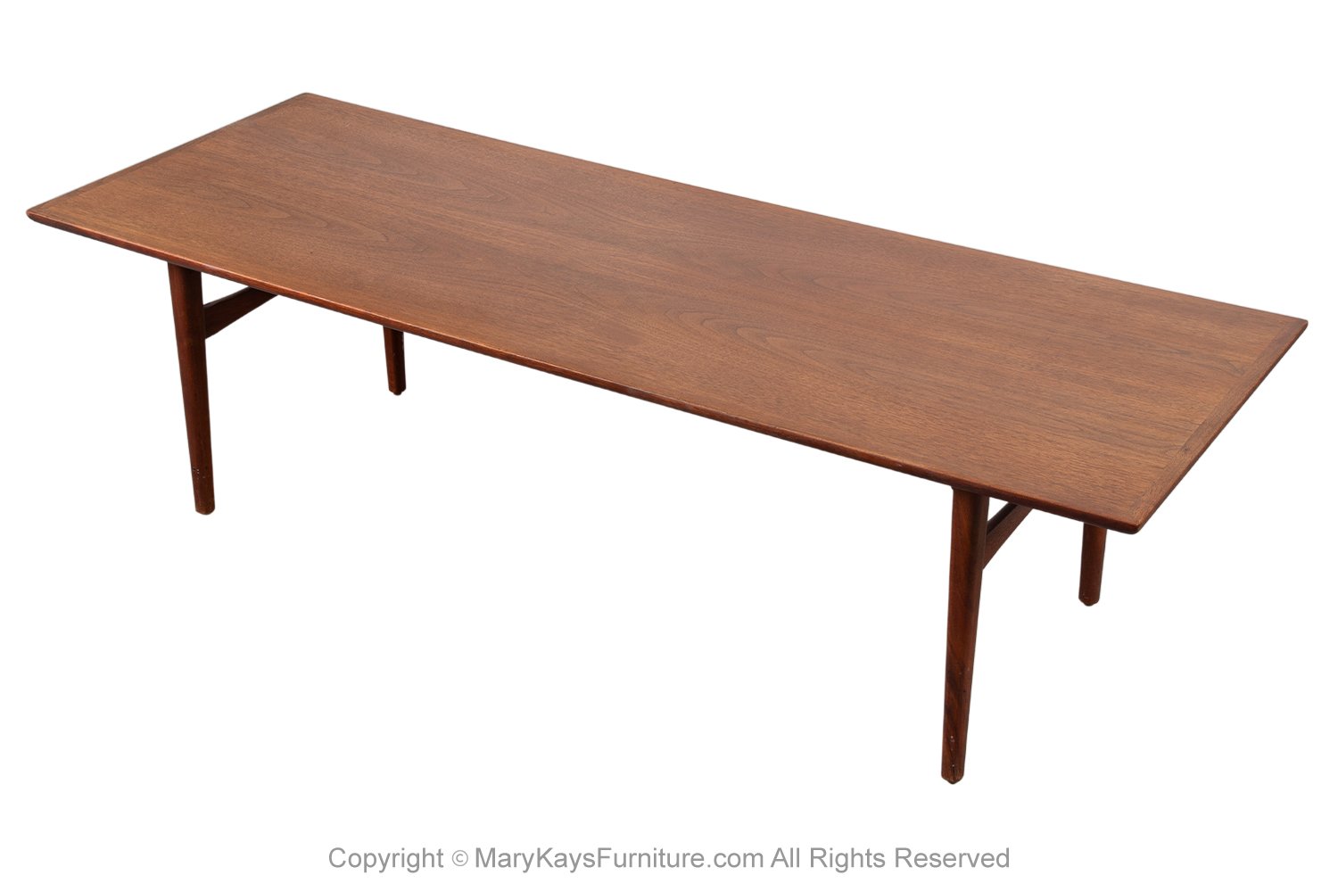 A beautiful, mid-century, modern, Danish style, coffee table. The perfect length to pair with an extra-long sofa, in great condition. Featuring rectangular top, with Scandinavian influence, simple lines, with elongated style top. The table rests on stylish sturdy legs. The beautiful coffee table has a beautiful finish. This is an outstanding selection for serious collectors of mid-century modern Danish. A gorgeous sight to behold in person! nCondition Report: finish is in great condition, exhibit little signs of wear, with typical scuffs, overall gorgeous surface condition. Construction is strong and sturdy. n nStyle: Danish style nManufacturer: Unknown nMaterials and Techniques: Wood, Veneer nCondition: Good nWear: Wear consistent with age and use nMeasurements: 15 3/8_ Tall x 53 7/8_ Long x 19 7/8_ Deep n n