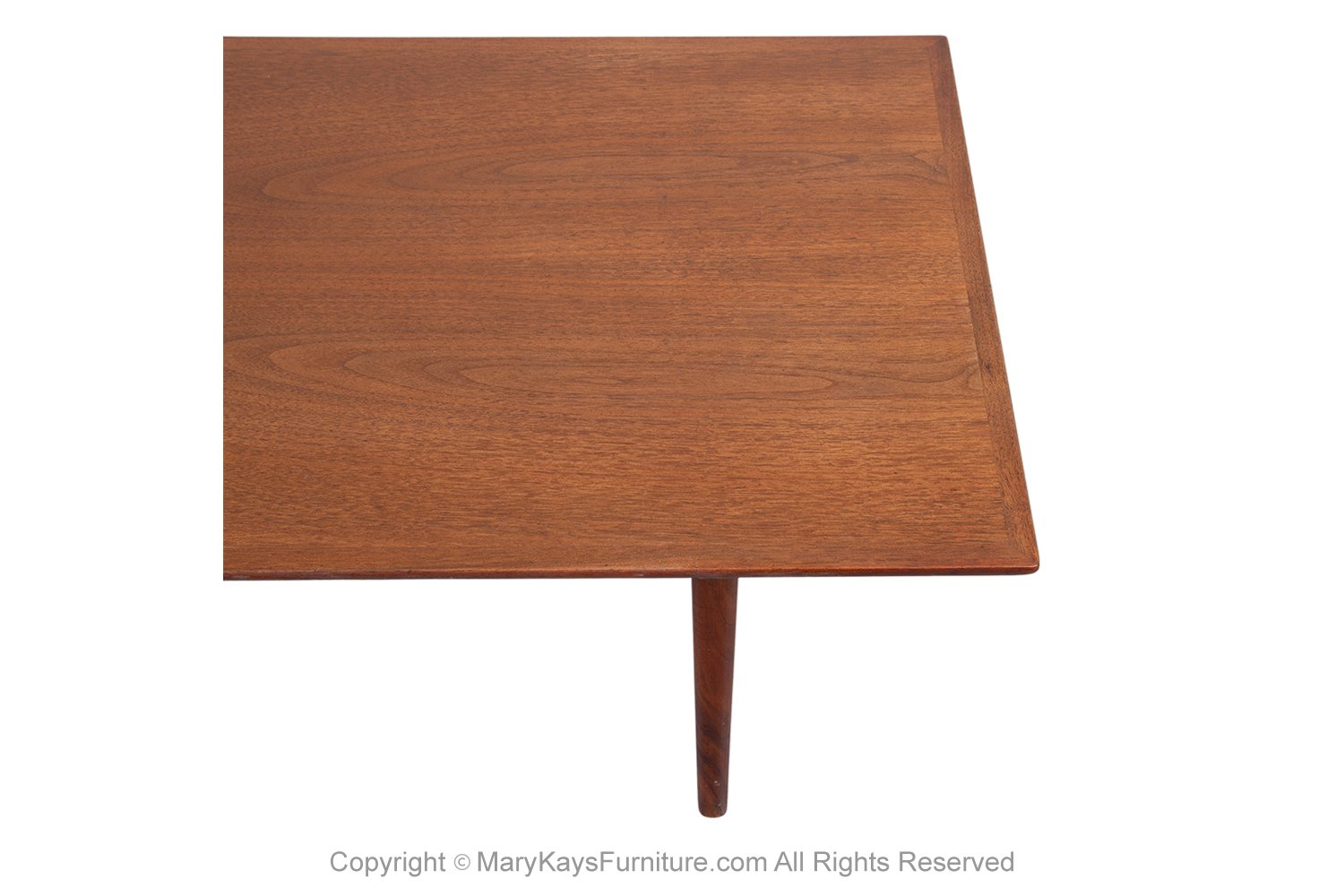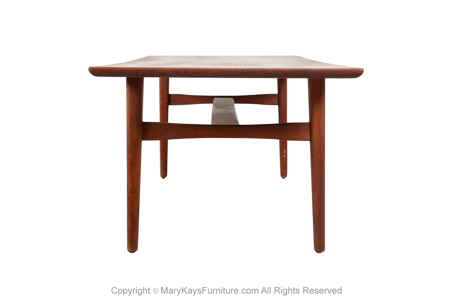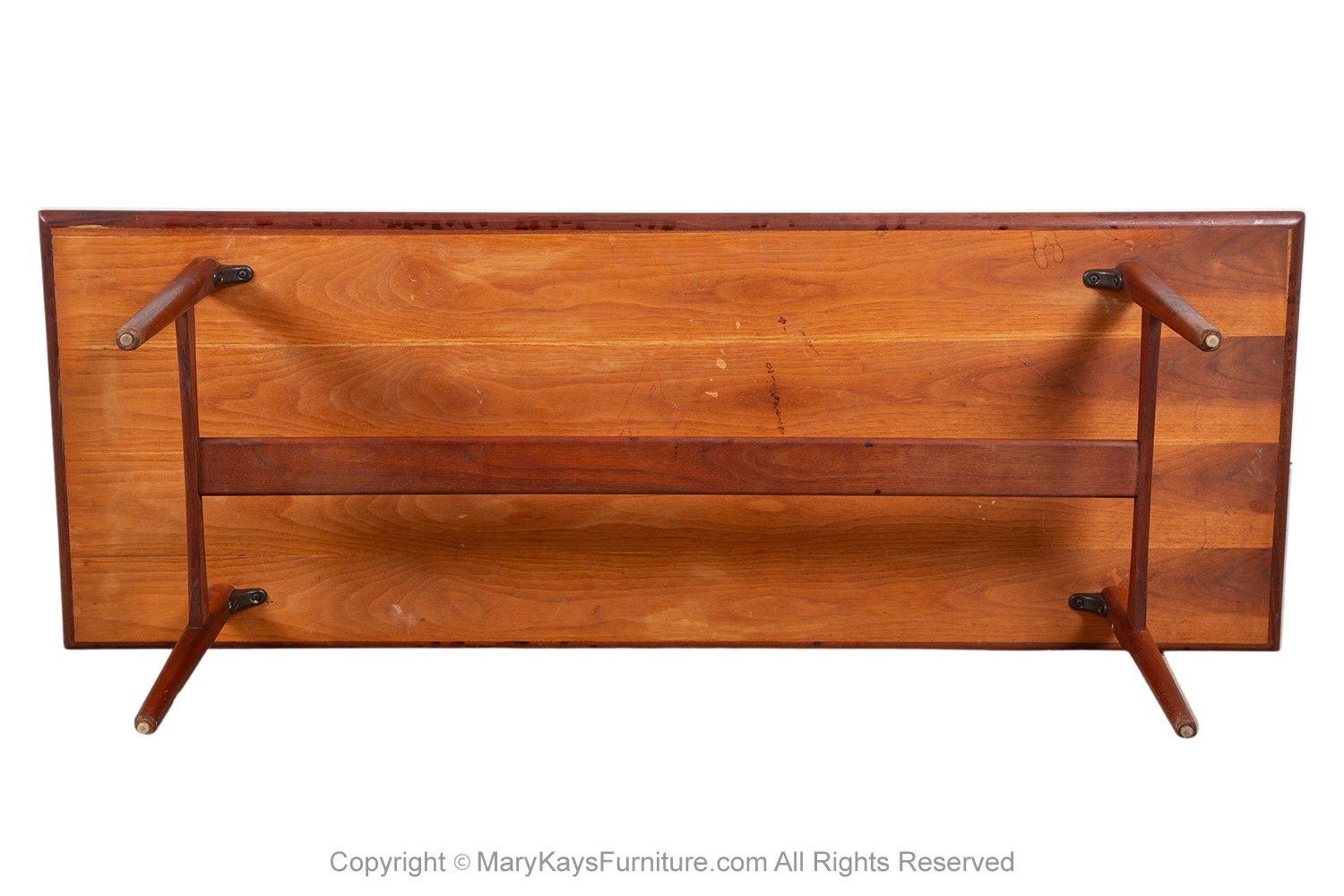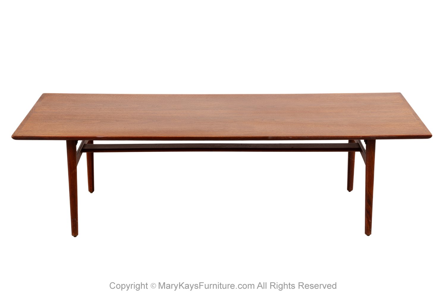 A beautiful, mid-century, modern, Danish style, coffee table. The perfect length to pair with an extra-long sofa, in great condition. Featuring rectangular top, with Scandinavian influence, simple lines, with elongated style top. The table rests on stylish sturdy legs. The beautiful coffee table has a beautiful finish. This is an outstanding selection for serious collectors of mid-century modern Danish. A gorgeous sight to behold in person! nCondition Report: finish is in great condition, exhibit little signs of wear, with typical scuffs, overall gorgeous surface condition. Construction is strong and sturdy. n nStyle: Danish style nManufacturer: Unknown nMaterials and Techniques: Wood, Veneer nCondition: Good nWear: Wear consistent with age and use nMeasurements: 15 3/8_ Tall x 53 7/8_ Long x 19 7/8_ Deep n n