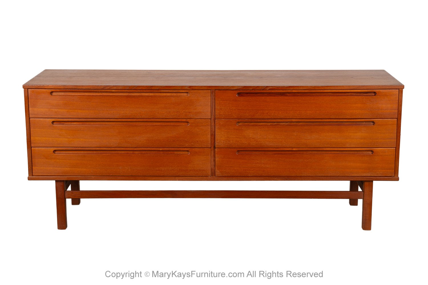 Beautiful Danish modern teak long dresser designed by Nils Jonsson and manufactured by HJN Mobler, made in Denmark circa 1960’s. Features a rectangular top over six (6) easy gliding dovetail drawers with Jonsson’s iconic recessed pulls, hardwood teak and teak veneer, overall pristine original vintage condition, exceptional craftsmanship, with beautiful teak tone, grain detail throughout and honey birch interior dovetail drawer. Mounted on sturdy solid teak straight, square, legs joined by a perimeter stretcher. Great patina, classic, sleek, clean lines characteristic of Danish modern style. This timeless beauty will make a great addition to a mid-century modern collection and also blend beautifully with other décor styles. Perfect piece for a bedroom, living room or entryway accent, or storing linens etc., in a dining room.