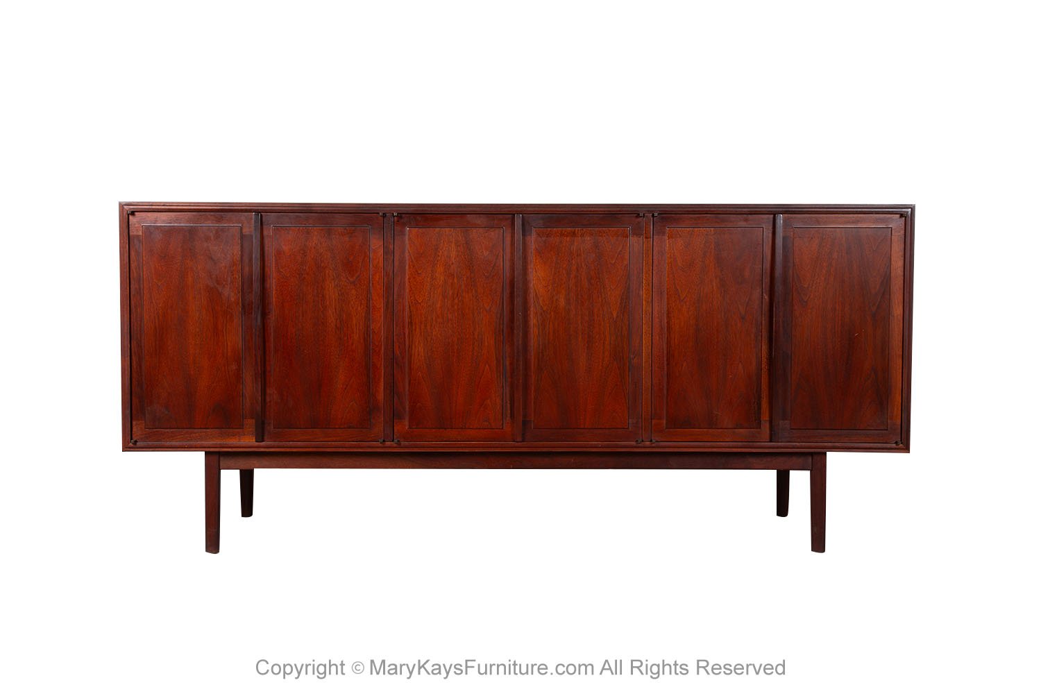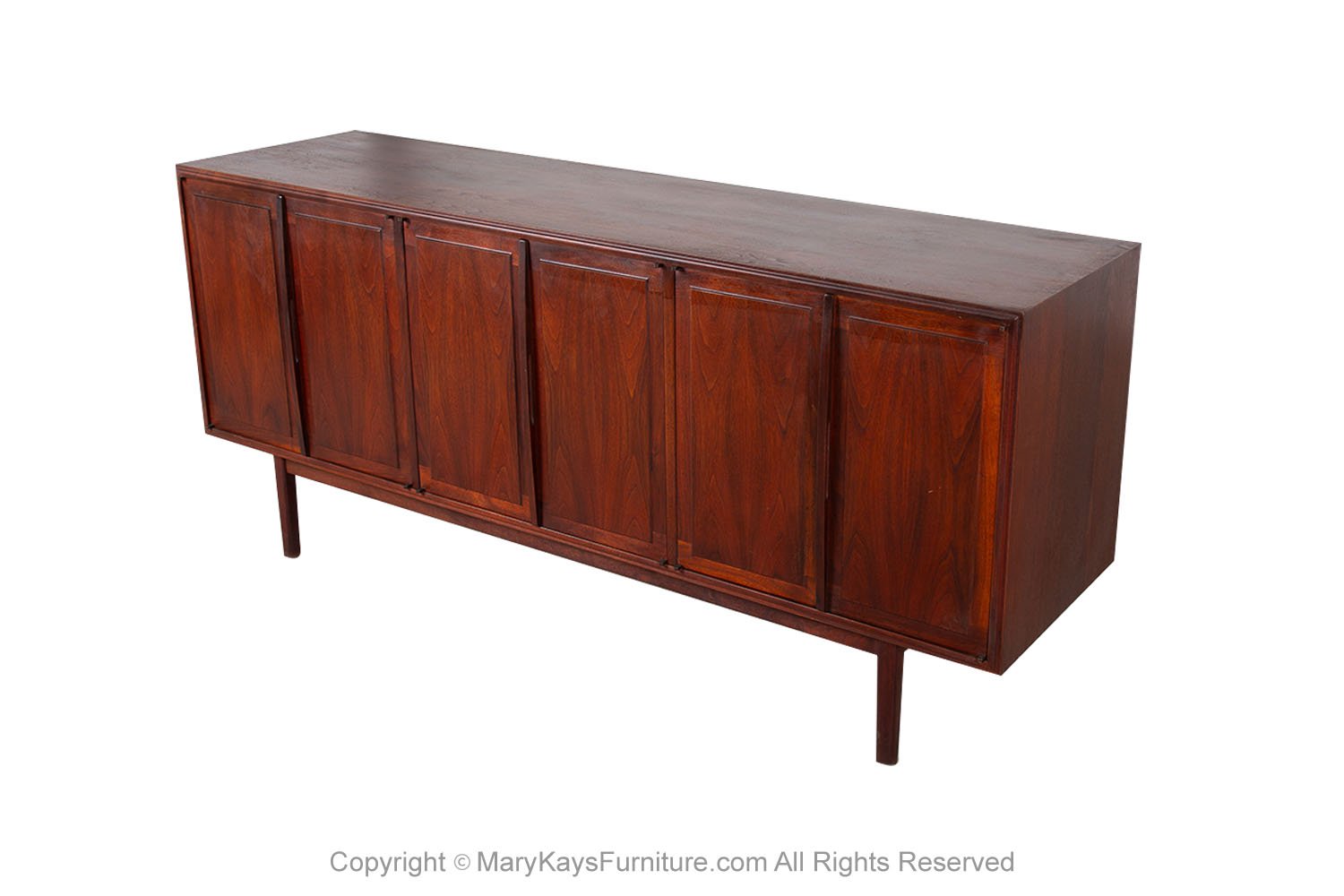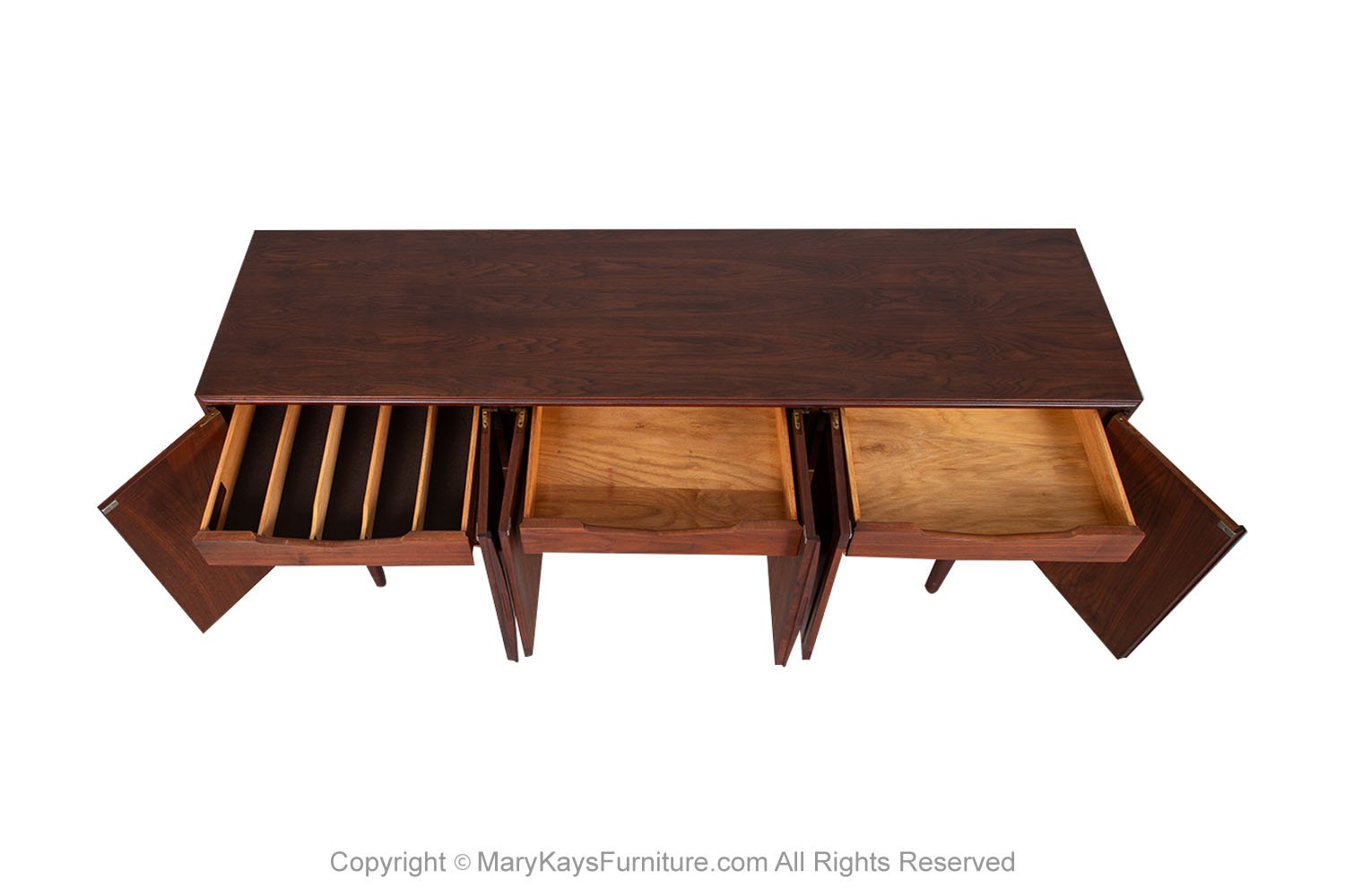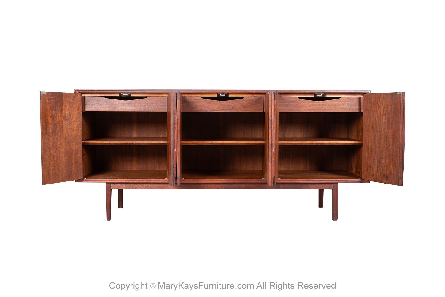 Mid-Century Modern Rosewood credenza/sideboard circa 1960s. This smartly crafted credenza is a perfect collaboration of design and function. Featuring triple cabinet doors that open to reveal three bays outfitted with a beautiful finished walnut interior. Each cabinet with roll out drawers the left drawer is felt lined with dividers. The cabinets offer ample storage, each with adjustable shelves. Exquisite craftsmanship and solid construction, this wonderful credenza rests on Danish style legs with stretcher. Great piece for many uses in a living room, foyer, bedroom or office, and given the door design flexibility, will blend well with many décor styles! nCondition Report: Sturdy and stable; minor wear, overall nice surface condition. Construction is strong and sturdy. n nOf the Period: Mid-Century Modern nPlace of Origin: United States nDate of Manufacture: 1960s nMaterials and Techniques: Rosewood, Walnut nCondition: Good nWear: Wear consistent with age and use nMeasurements: 67 1/8_ W _ 18_ D _ 30 1/4_ H n n n