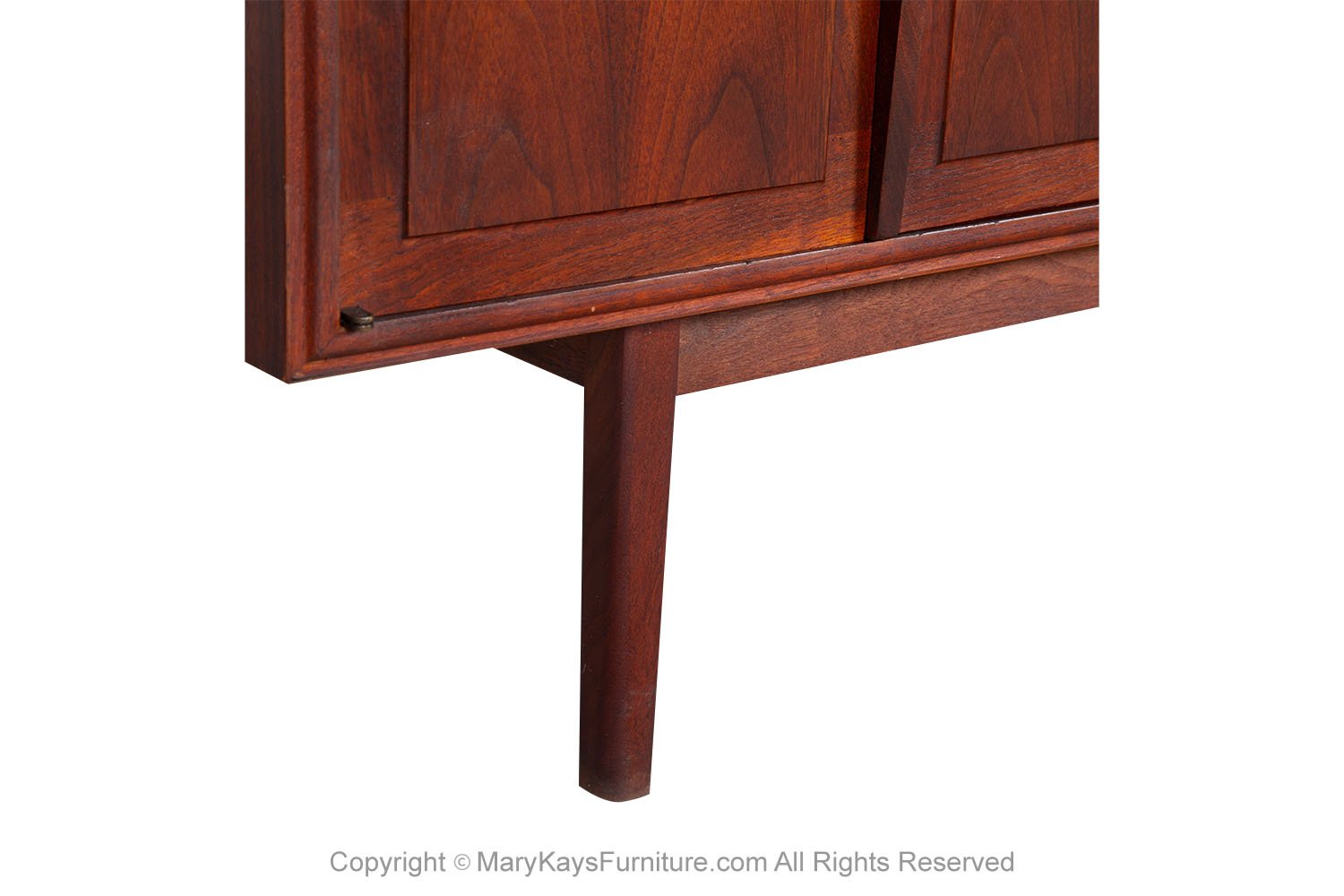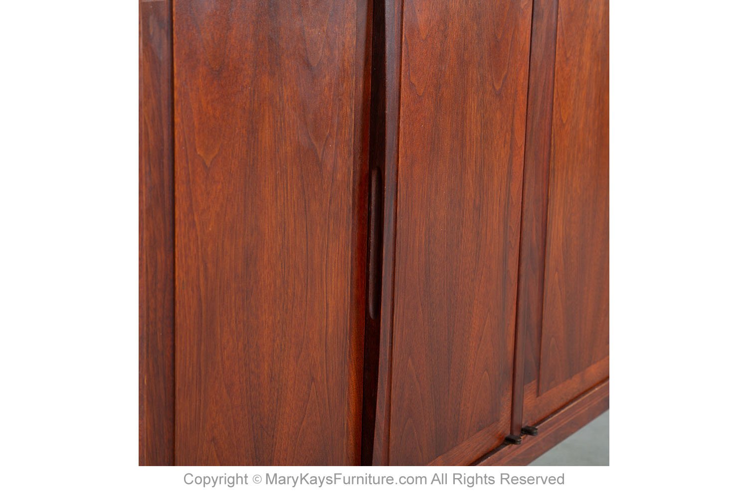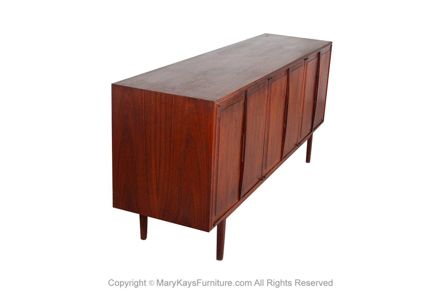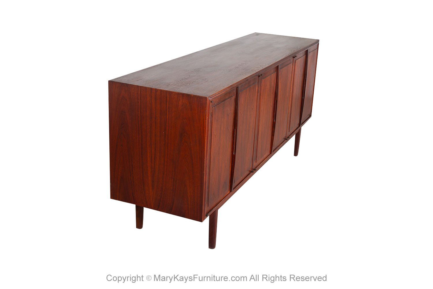 Mid-Century Modern Rosewood credenza/sideboard circa 1960s. This smartly crafted credenza is a perfect collaboration of design and function. Featuring triple cabinet doors that open to reveal three bays outfitted with a beautiful finished walnut interior. Each cabinet with roll out drawers the left drawer is felt lined with dividers. The cabinets offer ample storage, each with adjustable shelves. Exquisite craftsmanship and solid construction, this wonderful credenza rests on Danish style legs with stretcher. Great piece for many uses in a living room, foyer, bedroom or office, and given the door design flexibility, will blend well with many décor styles! nCondition Report: Sturdy and stable; minor wear, overall nice surface condition. Construction is strong and sturdy. n nOf the Period: Mid-Century Modern nPlace of Origin: United States nDate of Manufacture: 1960s nMaterials and Techniques: Rosewood, Walnut nCondition: Good nWear: Wear consistent with age and use nMeasurements: 67 1/8_ W _ 18_ D _ 30 1/4_ H n n n