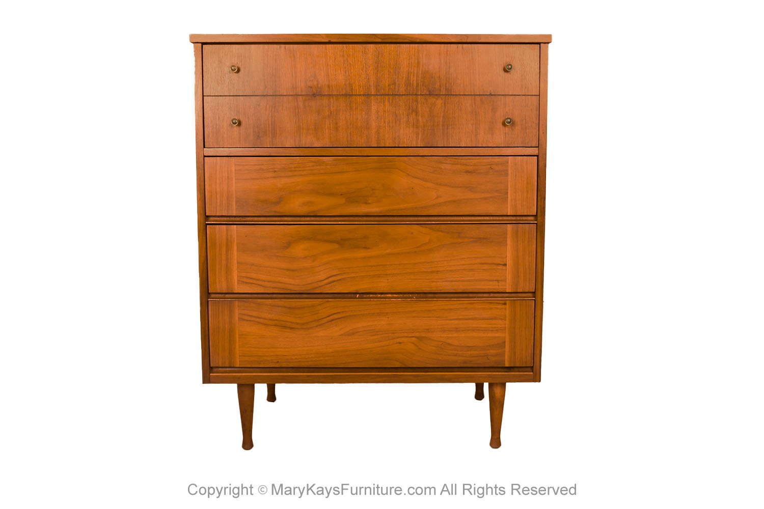 Attractive tall mid century modern sleek smooth face dresser. This is a very simple yet modern design. Each drawer has beautiful medium tone stunning walnut grains with minimal pulls. At the pull of the drawers you will expose plenty of storage. A clean simple framed cabinet with minimalist drawer, thin trim edge design, topped with beautiful walnut grains throughout having beautiful light and dark grains, creating a beautiful face, and top to this mid-century modern dresser. Raised on stylish tapered legs, this modern dresser would be just as stylish in the bedroom, as it would be in the office behind a desk, or in a living room. Clean mid-century design that looks just as modern back then as it is today. Matching long dressers also available for sale (sold separately). nCondition Report: Original finish, with minor wear, overall nice surface condition. Construction is strong and sturdy. Drawers operate smoothly, the base is tight level and supportive. n nOf the Period: Mid-Century Modern nDate of Manufacture: 1960s nPeriod: 1960-1969 nMaterials and Techniques: Walnut nCondition: Good nWear: Wear consistent with age and use. nMeasurements: 34_ Long x 18_ deep x 41 1/2_ tall n n