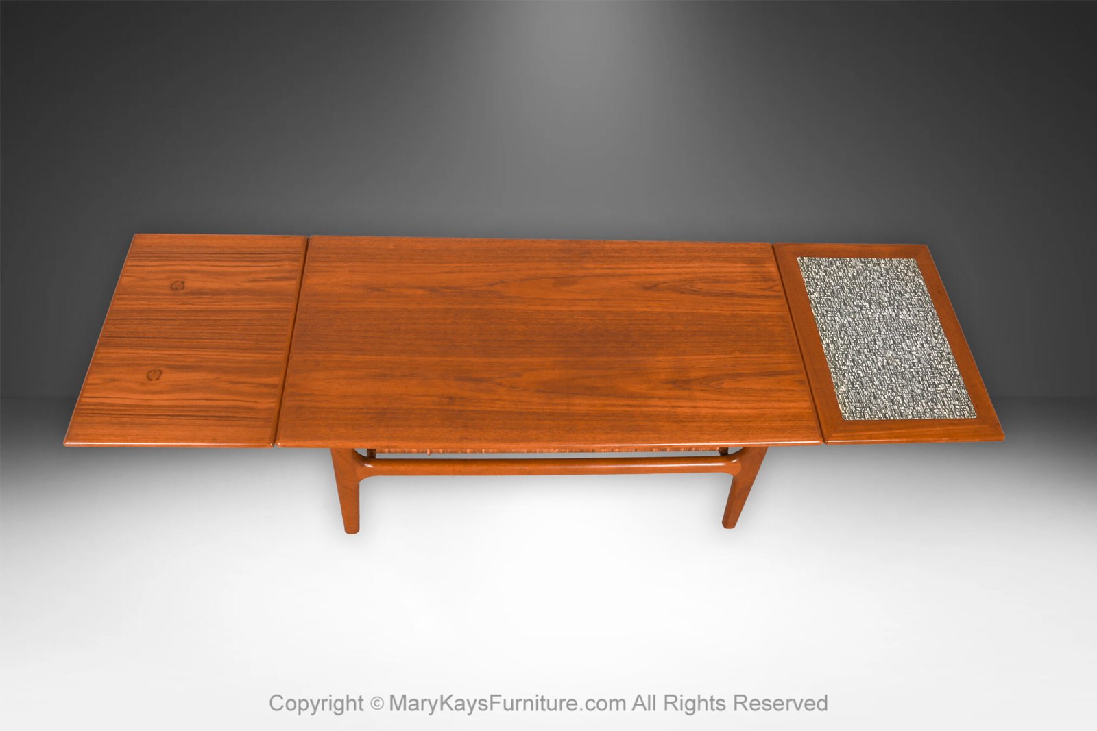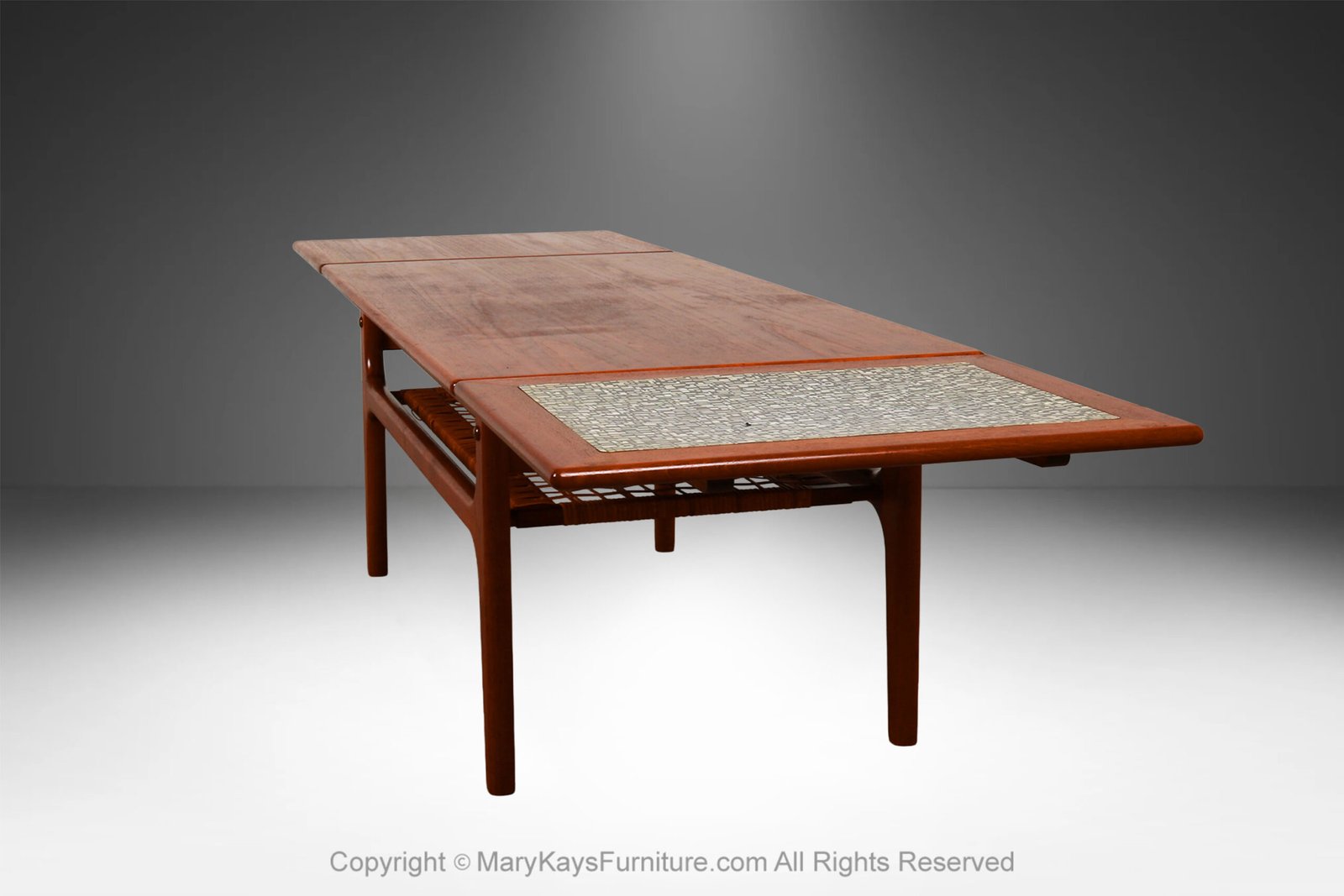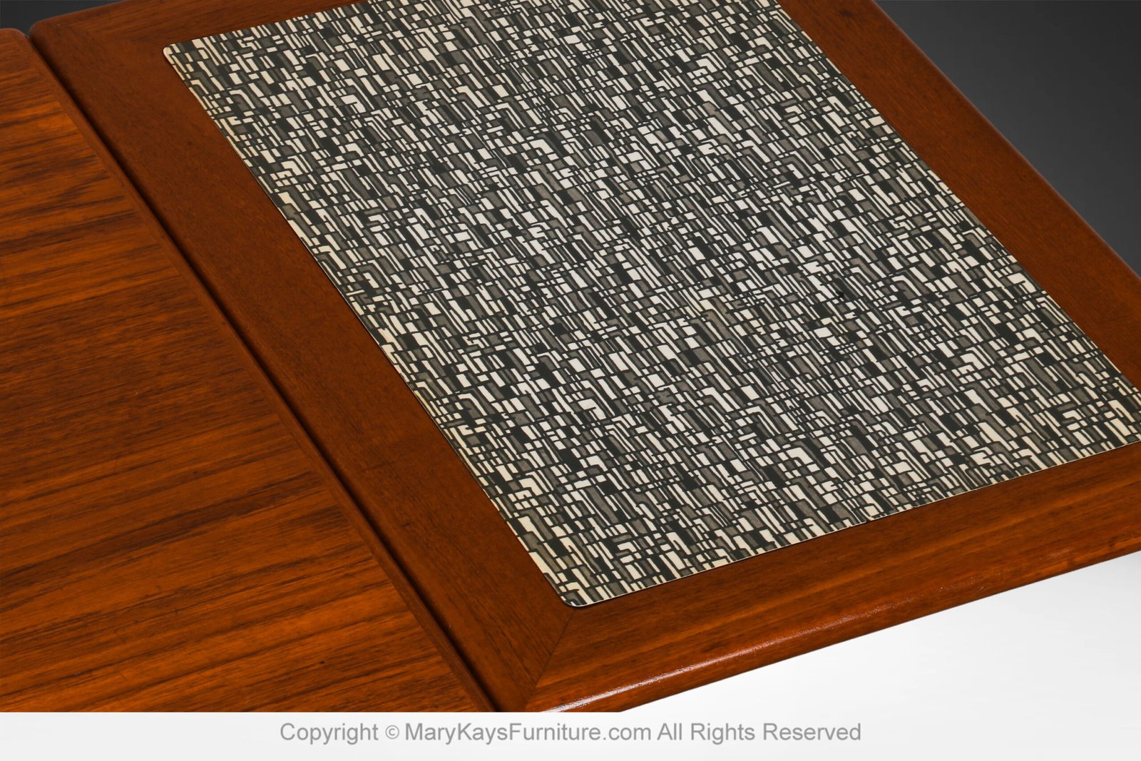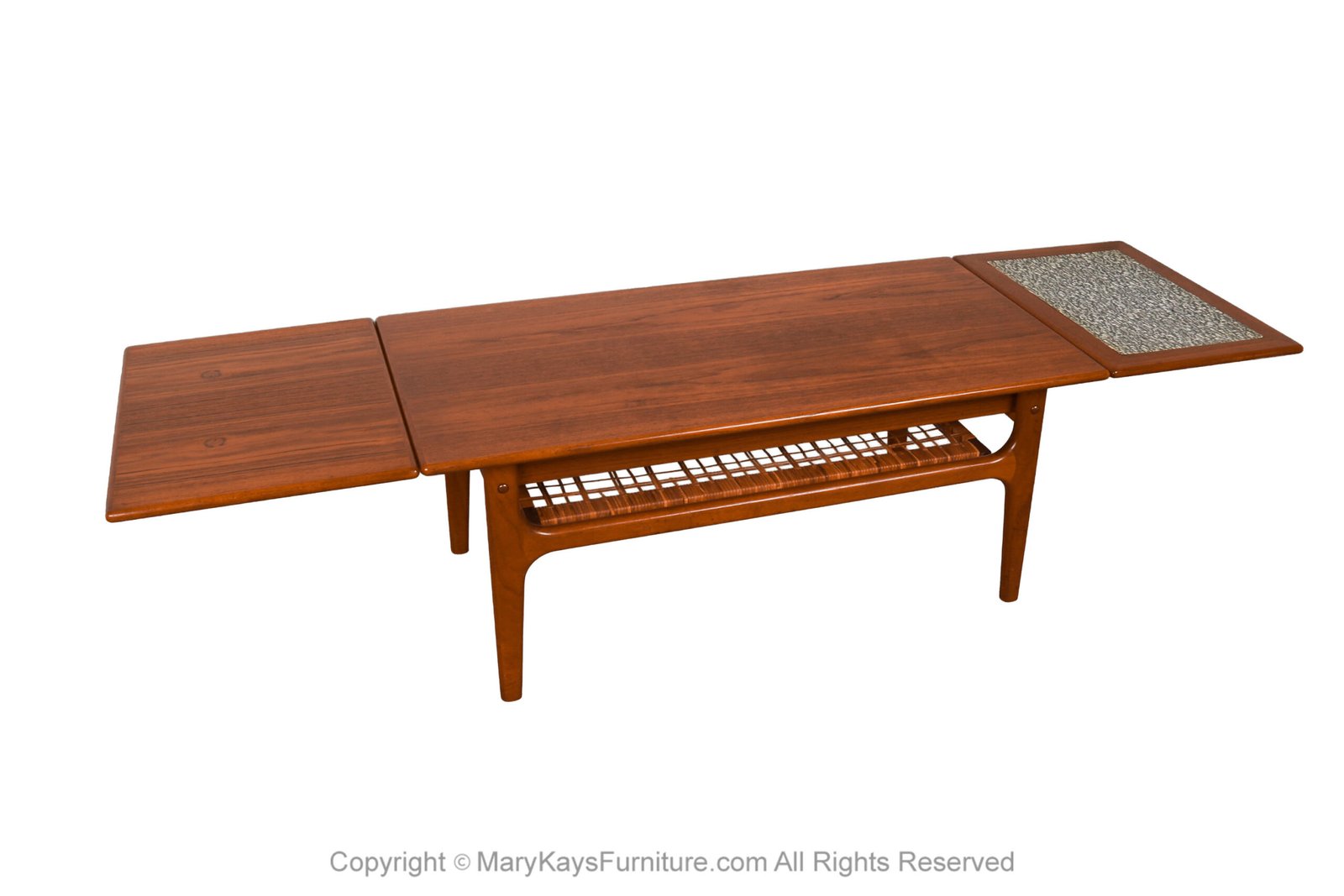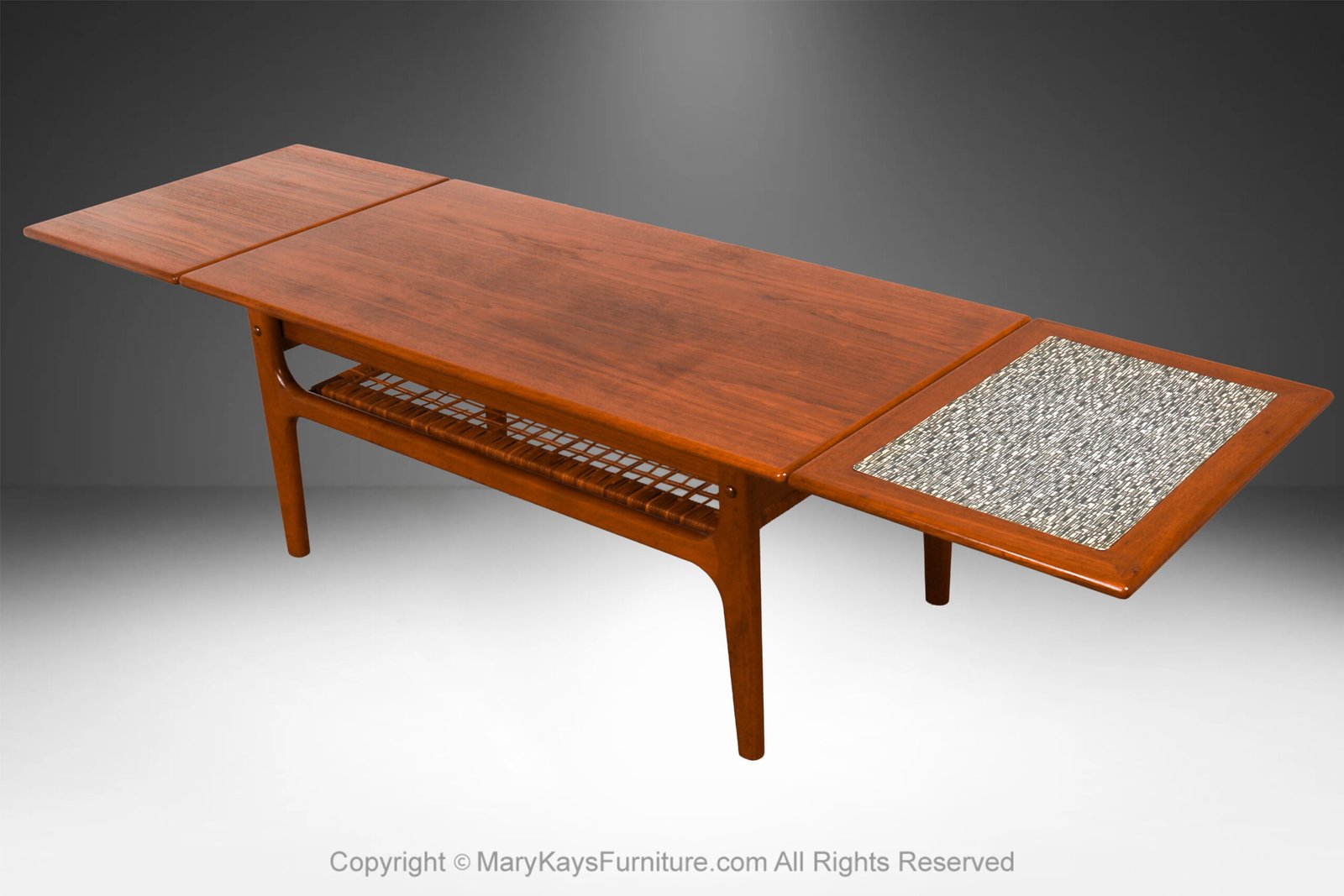 A beautiful, Danish, extendable two-tier design mid-century modern teak and cane coffee table manufactured in Denmark designed by Trioh Mobler, circa 1960’s. Features a rectangular top with a pull-out leaf at each end making this table perfect for small or large areas, a formica insert black and white panel crafted of a retro pattern at one end of the table creates a sense of asymmetry on an otherwise symmetrical and clean lined table. Easily extend one or both pull-out leaves depending on the need.