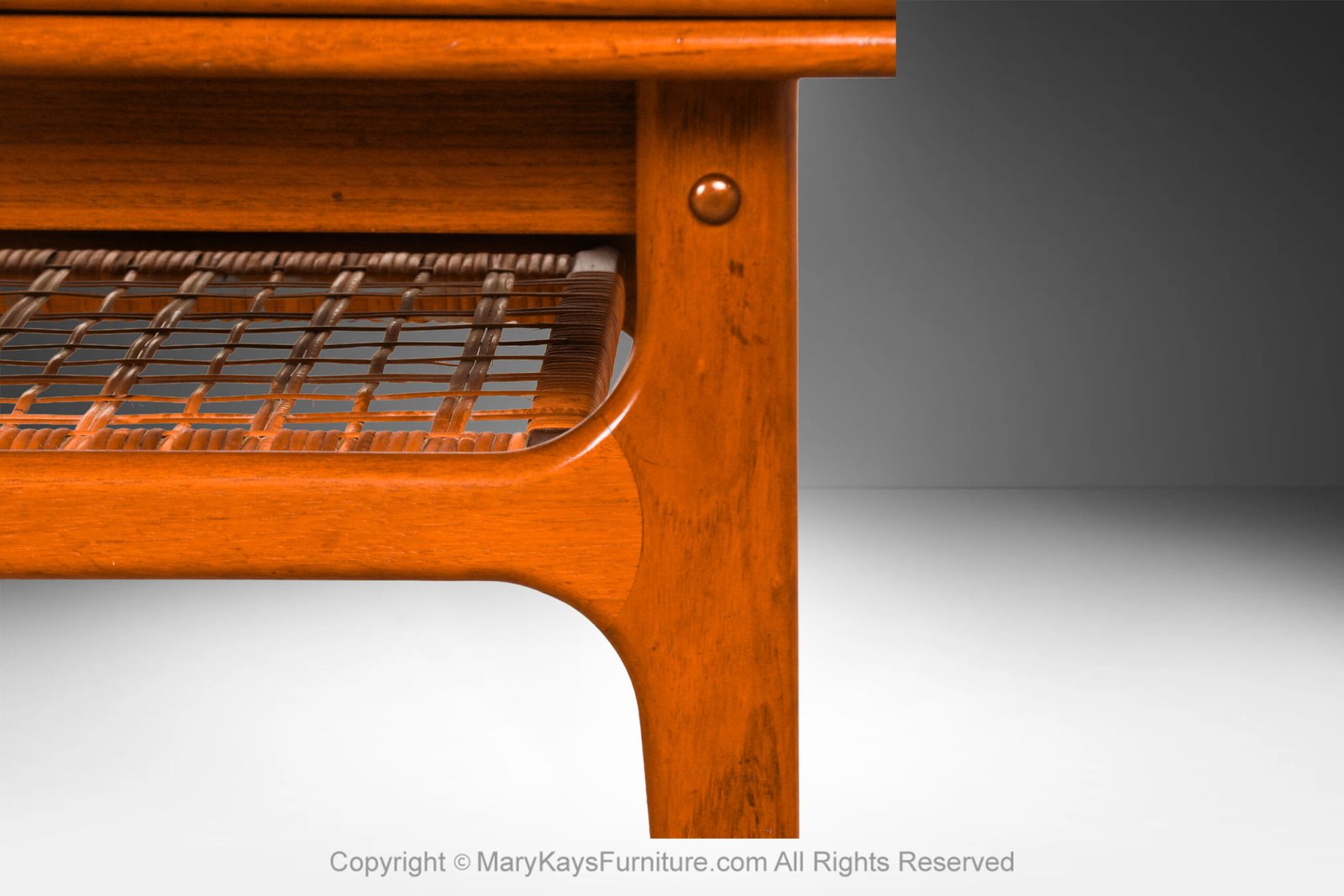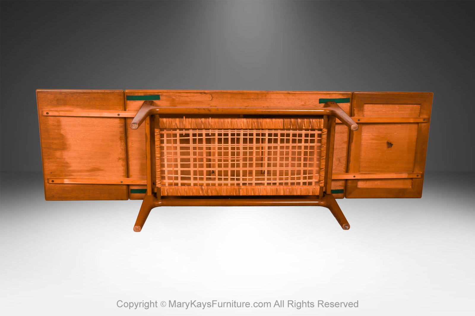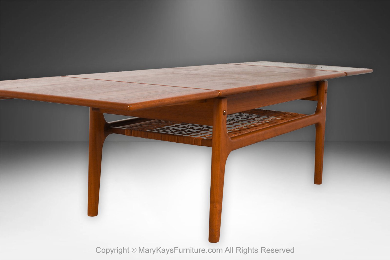 A unique sturdy original woven cane lower shelf adds additional space for storage and brings uniqueness and modernism to this Scandinavian crafted piece. The table rests on stylish tapered legs and maintains its well preserved, original finish, maker’s stamp, beneath the table. This is an outstanding selection for serious collectors of mid-century modern design. A gorgeous sight to behold in person!