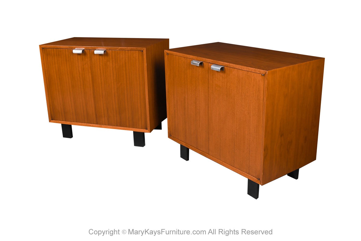 Remarkably Iconic rare pair of double door cabinets designed by George Nelson for the Herman Miller, Primavera line circa 1950s. Iconic piece resulting from the collaboration of these two MCM Masters! Often referred to as the Primavera Line, part of the Basic Cabinet Series. A beautiful example of Mid-Century craftsmanship. Expertly crafted, these absolute jewels remain in clean vintage condition. Each features a walnut wood frame with a rectangular top, above a double door cabinet, adorned with original striking brushed polished metal pulls, that open to reveal ample storage space, each with one adjustable shelf. Makers original Herman Miller Foil Label showing the logo designed by George Nelson, on the inside of each cabinet. Practical as they are beautiful with spacious interiors. These remarkable cabinets rest on ebonized inset legs creating a stunning contrast to the walnut hue of the body. A wonderful tribute to the clean, minimalistic design and style aesthetic characteristic of the Nelson and Miller collaboration. Truly a showpiece. They are a beautiful pair of matched cabinets for a bedroom but are also perfectly suited for the living room, dining room or office, making them a wonderful addition to any mid-century modern décor. nCondition Report: Original finish, with minor wear, overall nice surface condition. Construction is strong and sturdy. The cabinet hinges intact and operates smoothly. Brushed metal pulls in great condition show minimal signs of wear. n nDesigner: George Nelson nManufacturer: Herman Miller nPlace of Origin: USA nDate of Manufacture: 1950s nOf the Period: 1950-1959 nMaterials and Techniques: Walnut, polished metal nCondition: Good nWear: Wear consistent with age and use nMeasurements: 34 _W _ 18.5_D _ 29 1/2_H n n