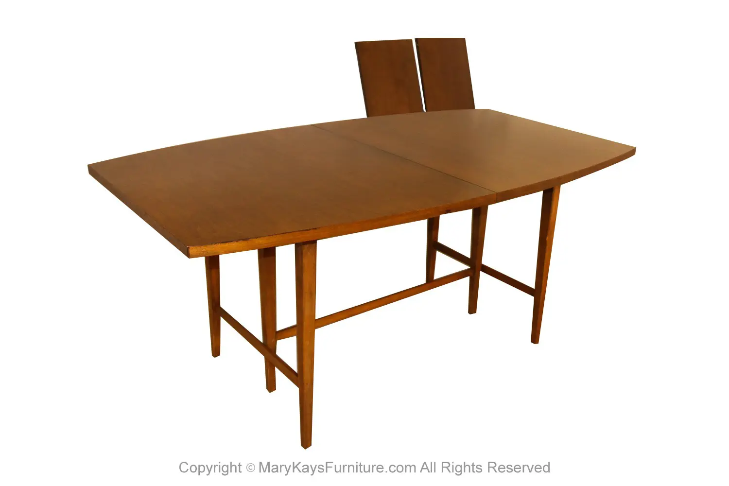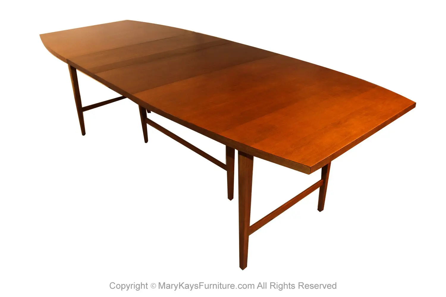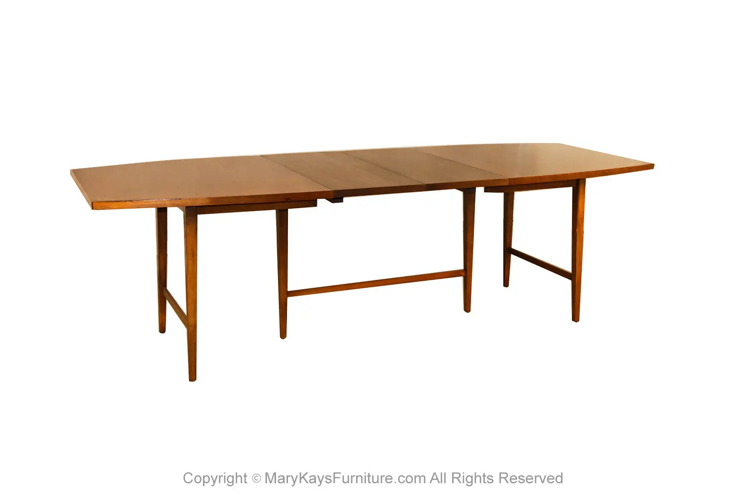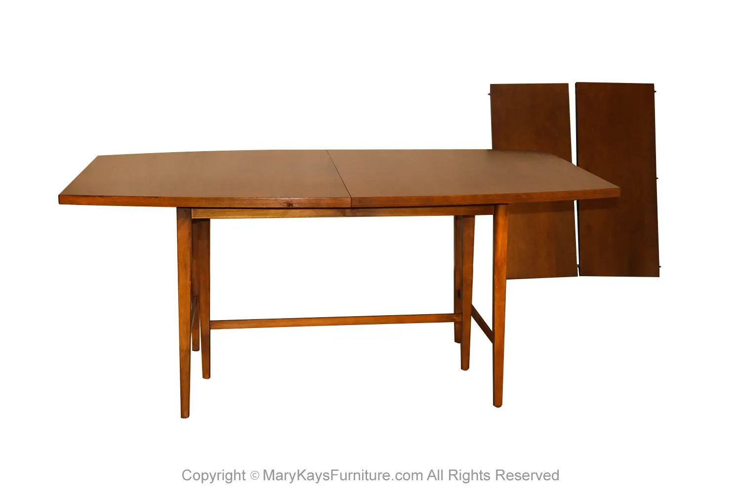 1950’s Paul McCobb Mid-Century Modern dining table. A stunning table designed by Paul McCobb for his Planner Group line manufactured by Winchendon Furniture of Winchester VA Original clean surface throughout, the rich maple makes the table visually attractive with a beautiful surface. Features a boat-shaped top, two conforming leaf insertions, raised over six sleek square tapered legs joined by stretcher rails. The frame easily expands open to receive two original leaves allowing the table to extend to a full 96” exquisitely constructed. This is a wonderful table that offers two large leaves changing it from a medium size table to a large table. Manufacturer’s label on the underside (Planner Group Designed by Paul McCobb Winchester Furniture Company). Each of the leaves is 15_ across, making this a versatile piece indeed, built to last the test of time. Stunning vintage Mid Century Modern dining table. A beautiful balance of modern and classic design. This elegant dining table is in good original condition. It is a solid table that is intended to be actively used and enjoyed without concern, while presenting a powerful statement in whatever setting it becomes a part of. nCondition Report: Good original condition, minor surface wear, very sturdy. n nCreator: Paul McCobb (Designer) Winchendon Furniture (manufacturer) nPlace of Origin: United States nProduction Period: 1950 – 1959 nDesign Period: Mid Century nMaterials: Maple nCondition: Good nWear: Wear consistent with age and use nMeasurements: 66_ long 96_ with leaves x 40_ deep x 29_ tall n n n n n