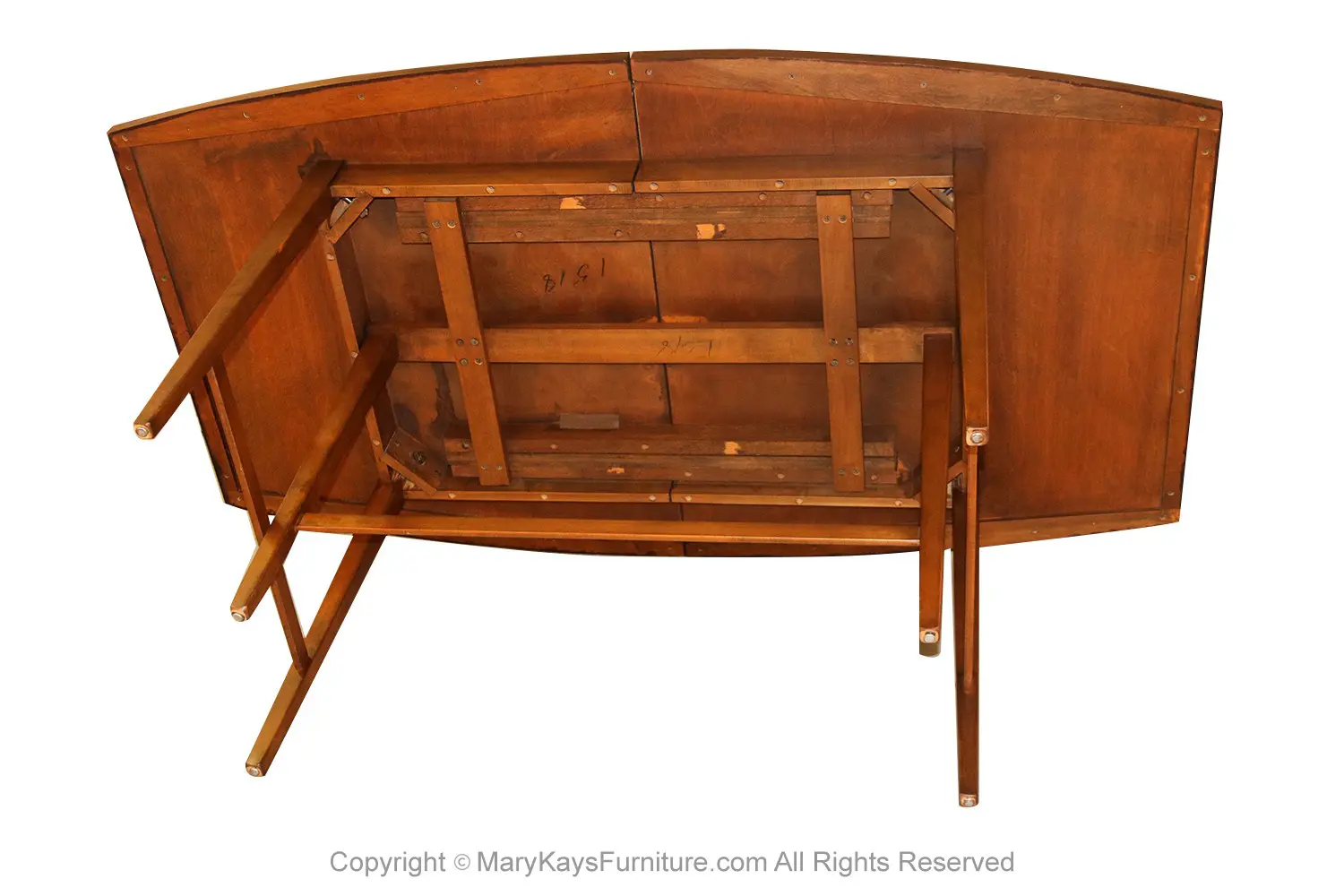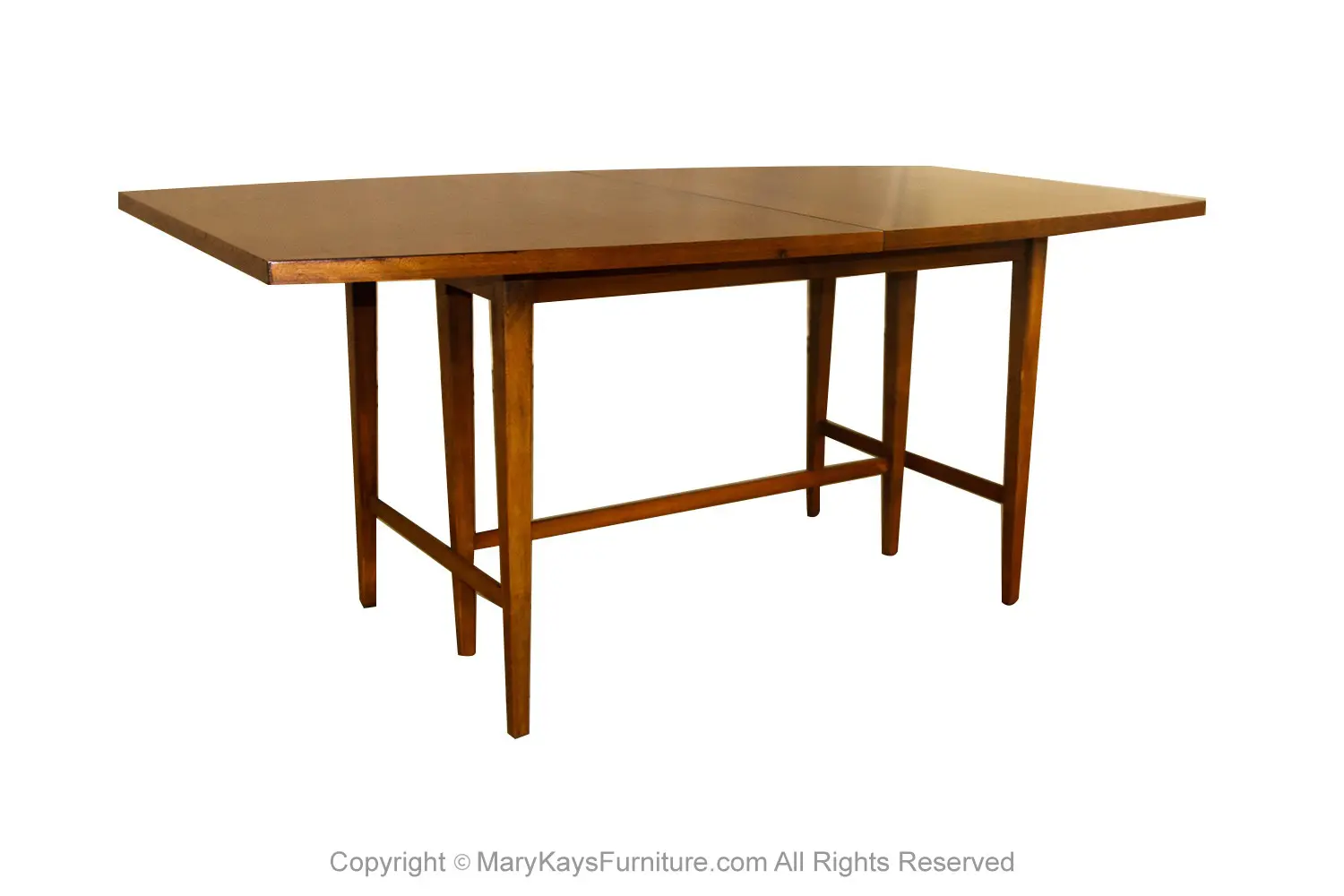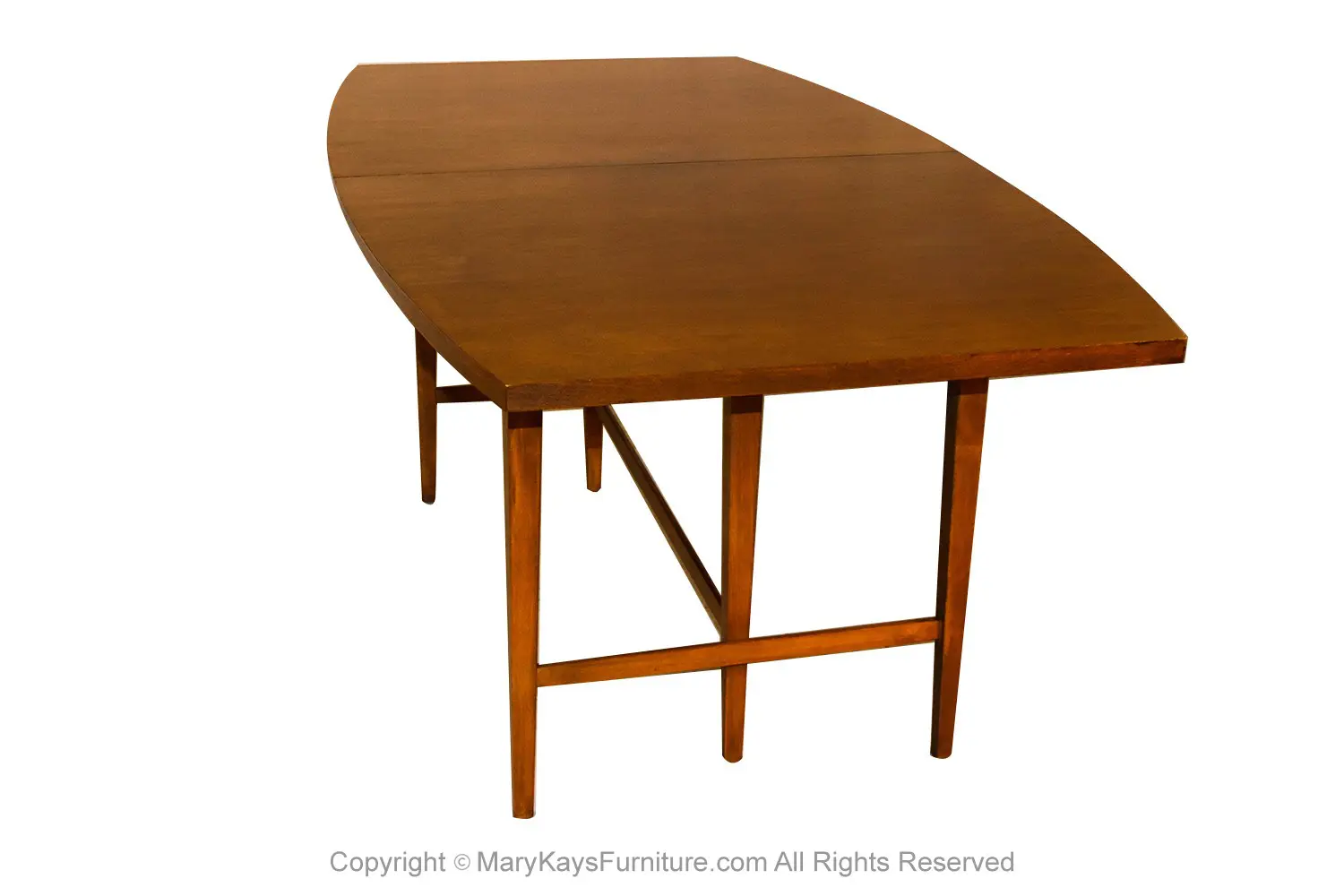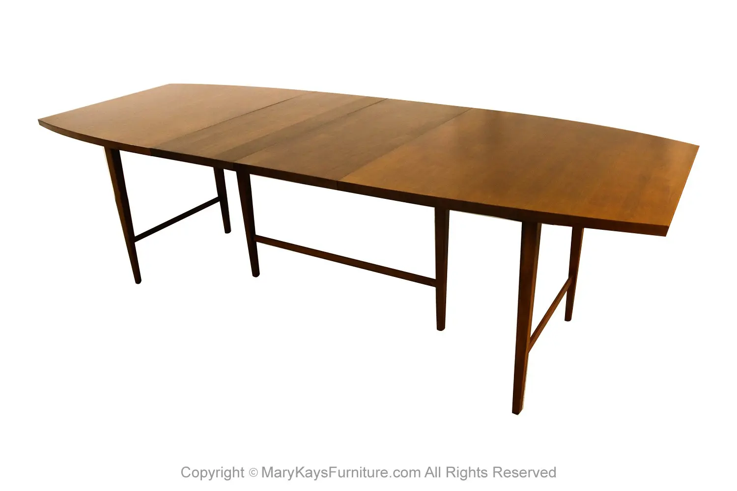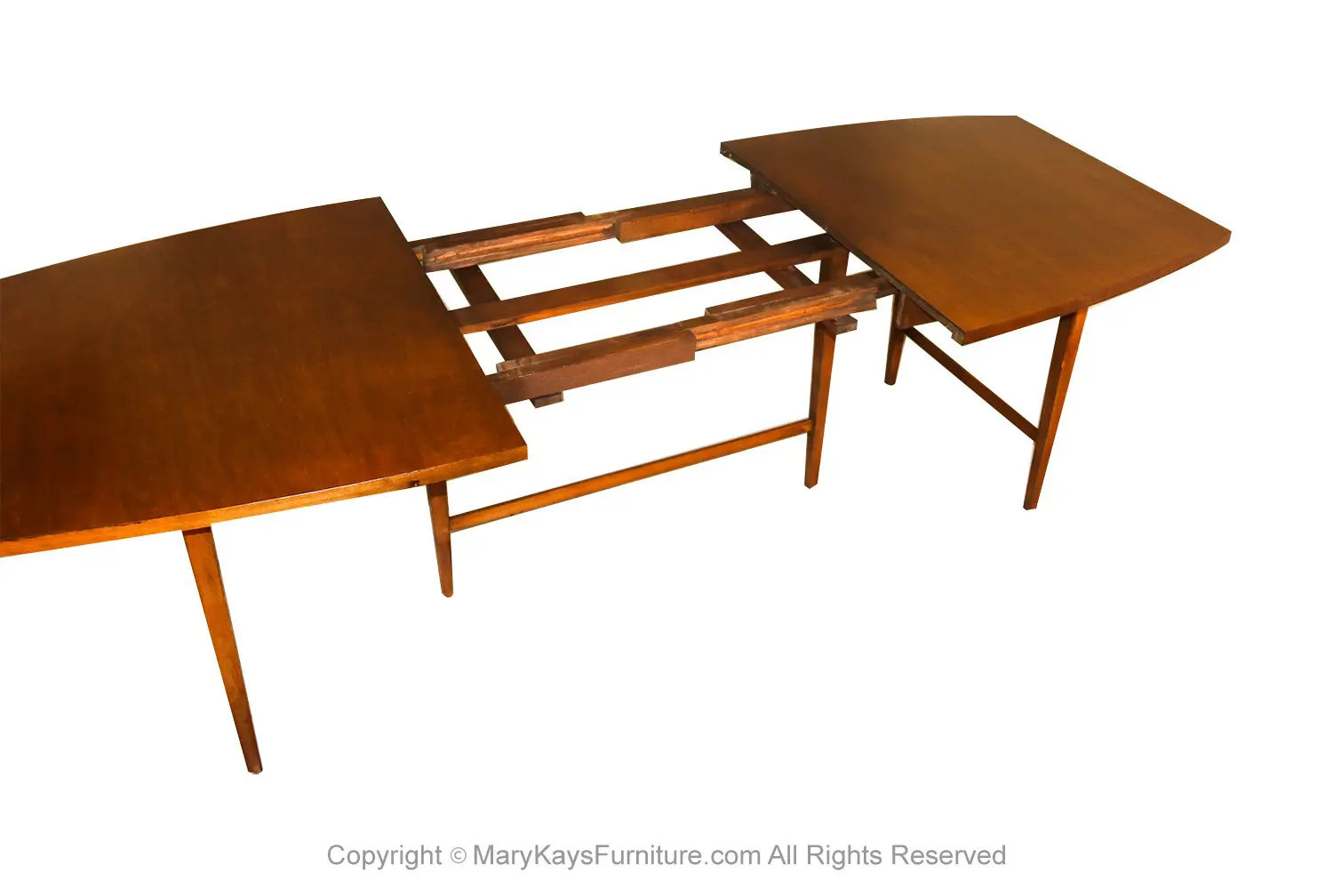 1950’s Paul McCobb Mid-Century Modern dining table. A stunning table designed by Paul McCobb for his Planner Group line manufactured by Winchendon Furniture of Winchester VA Original clean surface throughout, the rich maple makes the table visually attractive with a beautiful surface. Features a boat-shaped top, two conforming leaf insertions, raised over six sleek square tapered legs joined by stretcher rails. The frame easily expands open to receive two original leaves allowing the table to extend to a full 96” exquisitely constructed. This is a wonderful table that offers two large leaves changing it from a medium size table to a large table. Manufacturer’s label on the underside (Planner Group Designed by Paul McCobb Winchester Furniture Company). Each of the leaves is 15_ across, making this a versatile piece indeed, built to last the test of time. Stunning vintage Mid Century Modern dining table. A beautiful balance of modern and classic design. This elegant dining table is in good original condition. It is a solid table that is intended to be actively used and enjoyed without concern, while presenting a powerful statement in whatever setting it becomes a part of. nCondition Report: Good original condition, minor surface wear, very sturdy. n nCreator: Paul McCobb (Designer) Winchendon Furniture (manufacturer) nPlace of Origin: United States nProduction Period: 1950 – 1959 nDesign Period: Mid Century nMaterials: Maple nCondition: Good nWear: Wear consistent with age and use nMeasurements: 66_ long 96_ with leaves x 40_ deep x 29_ tall n n n n n