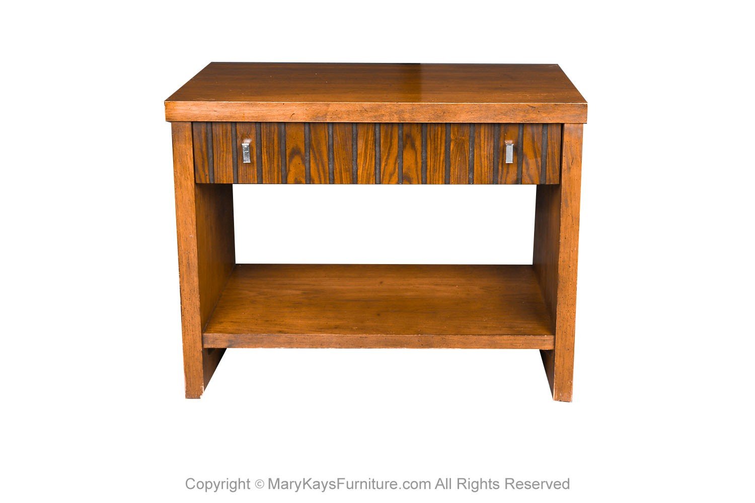 An elegant side/ end table from the Lane furniture “tower suite”. This is a beautiful example of Mid-Century craftsmanship by Lane Furniture. This retro piece was constructed with top of the line hardware, and excellently crafted woodwork. Features solid hardwood, with pecan and rosewood finish. One solid wood drawer with sculptured Drawer Pulls and dovetail construction. The table rests over a sturdy frame. Lane Furniture pieces are highly collectible, made in the United States. Lane was famous for its on-point design of the time and progressive use of luxury materials. Perfect addition to any room. Matching Long dresser and tall dresser also available for sale (sold separately). nCondition Report: Good original condition, solid and sturdy construction, minimal light wear. Construction is strong and sturdy. n nManufactured: Lane Furniture nPlace of Origin: United States nDate of Manufacture: 1970’s nPeriod: 1970-1979 nMaterials and Techniques: Rosewood, Pecan Veneer nCondition: Good solid wood construction nWear: Wear consistent with age and use nMeasurements: 26_ Wide x 20_ Tall x 16_ Deep n n