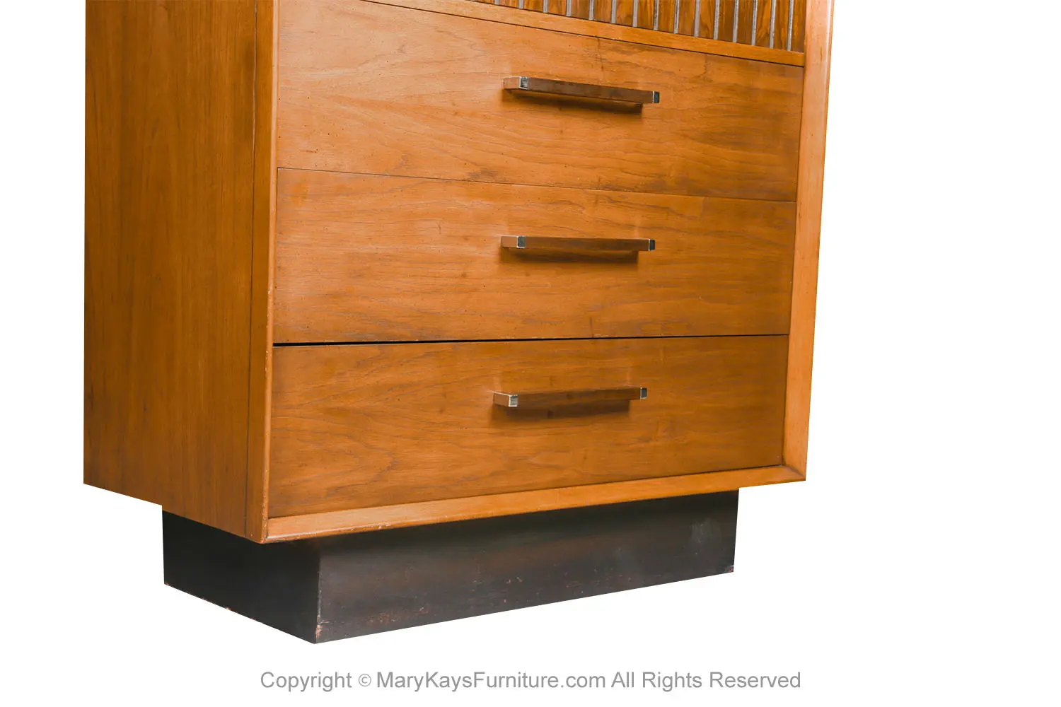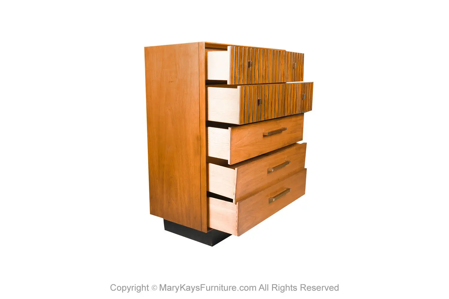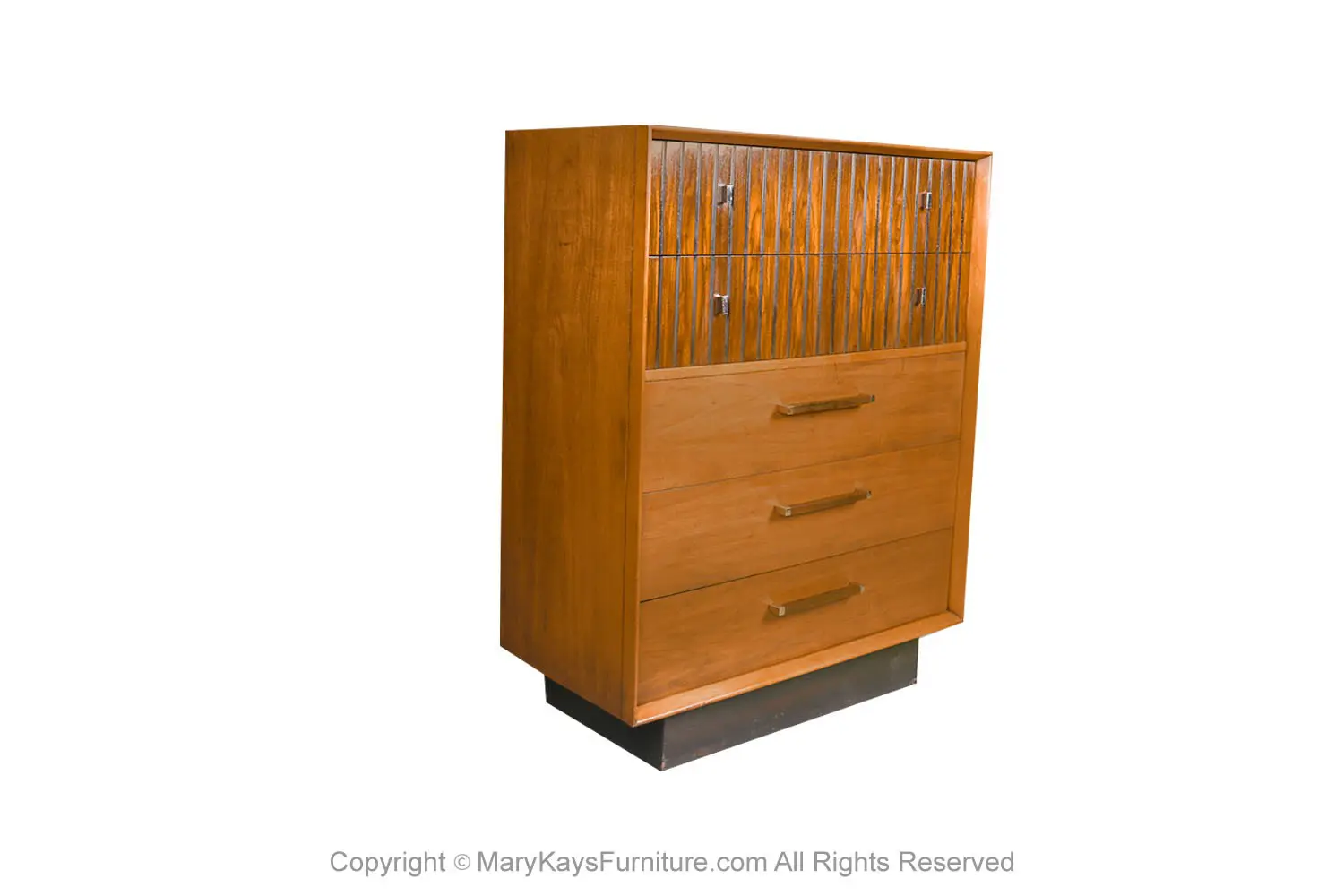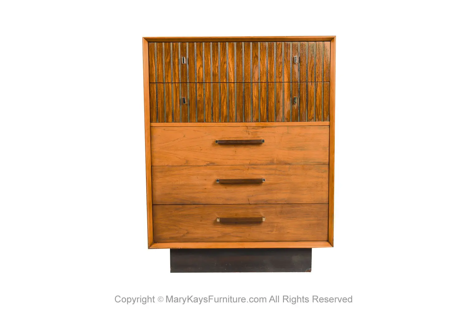 An elegant tallboy dresser from the Lane furniture “tower suite”. This is a beautiful example of Mid-Century craftsmanship by Lane Furniture. This retro piece was constructed with top of the line hardware, and excellently crafted woodwork. Features solid hardwood, with pecan and rosewood finish. Five Solid Wood Drawers with sculptured Drawer Pulls and dovetail construction. The dresser rests over a sturdy plinth base. Lane Furniture pieces are highly collectible, made in the United States. Lane was famous for its on-point design of the time and progressive use of luxury materials. Perfect addition to any room. Matching Long Dresser and nightstand also available for sale (sold separately). nCondition Report: In overall good original vintage condition, only very minor wear from age. Construction is strong and sturdy. n nManufactured: Lane Furniture nPlace of Origin: United States nDate of Manufacture: 1970’s nPeriod: 1970-1979 nMaterials and Techniques: Rosewood, Pecan Veneer nCondition: Good solid wood construction nWear: Wear consistent with age and use nMeasurements: 36_ Wide x 46.5_ Tall x 18_ Deep n