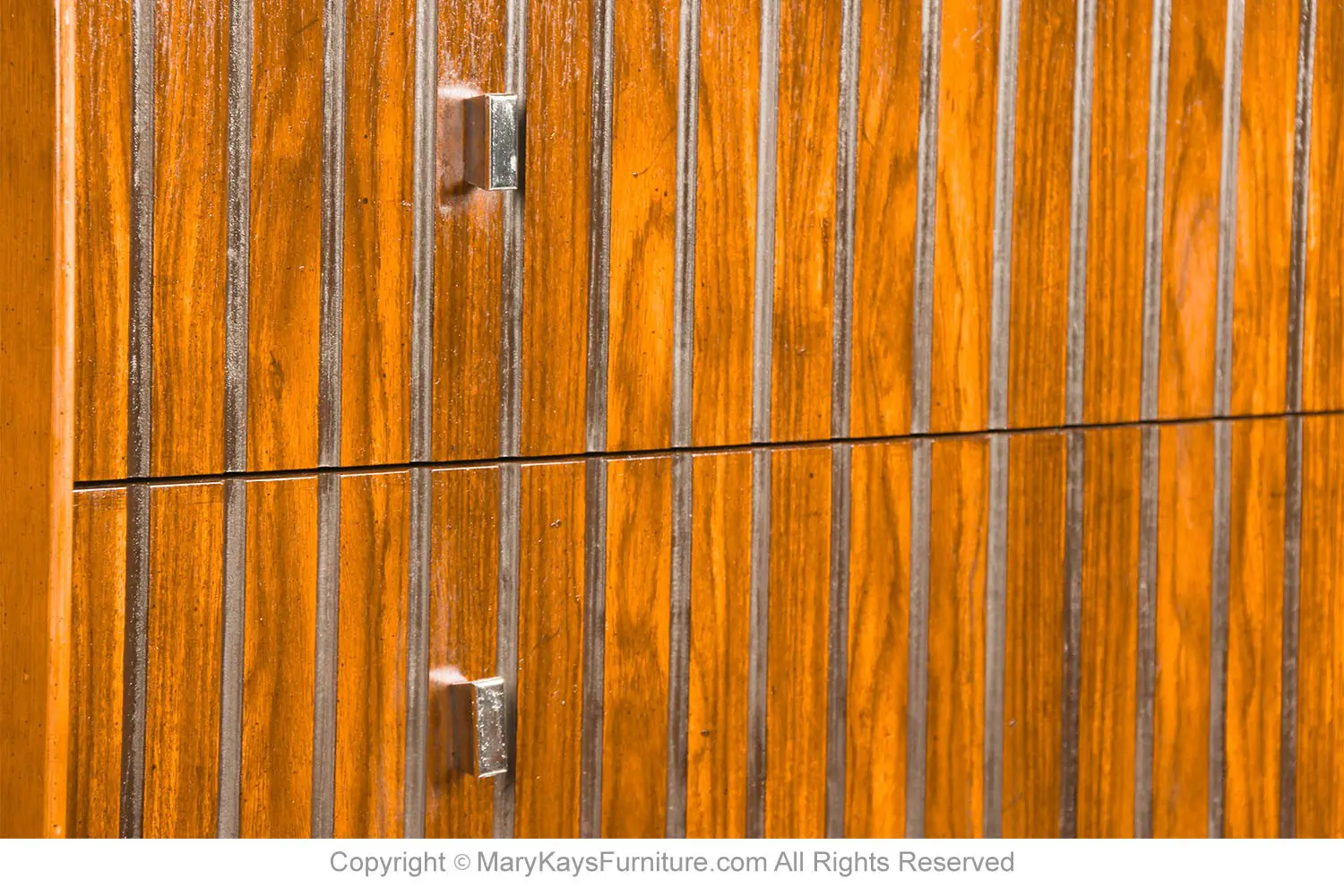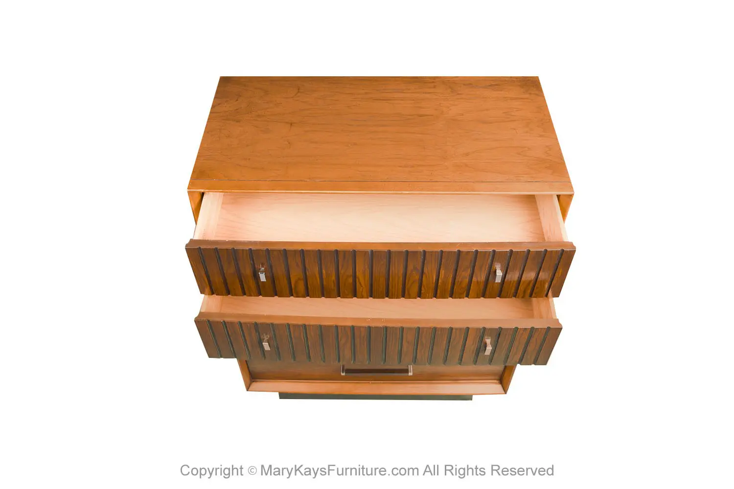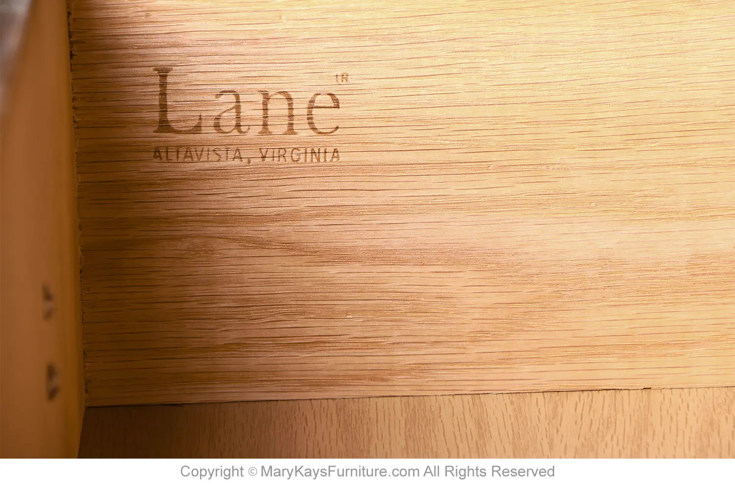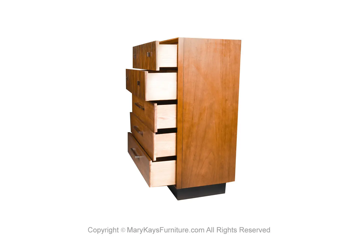 An elegant tallboy dresser from the Lane furniture “tower suite”. This is a beautiful example of Mid-Century craftsmanship by Lane Furniture. This retro piece was constructed with top of the line hardware, and excellently crafted woodwork. Features solid hardwood, with pecan and rosewood finish. Five Solid Wood Drawers with sculptured Drawer Pulls and dovetail construction. The dresser rests over a sturdy plinth base. Lane Furniture pieces are highly collectible, made in the United States. Lane was famous for its on-point design of the time and progressive use of luxury materials. Perfect addition to any room. Matching Long Dresser and nightstand also available for sale (sold separately). nCondition Report: In overall good original vintage condition, only very minor wear from age. Construction is strong and sturdy. n nManufactured: Lane Furniture nPlace of Origin: United States nDate of Manufacture: 1970’s nPeriod: 1970-1979 nMaterials and Techniques: Rosewood, Pecan Veneer nCondition: Good solid wood construction nWear: Wear consistent with age and use nMeasurements: 36_ Wide x 46.5_ Tall x 18_ Deep n