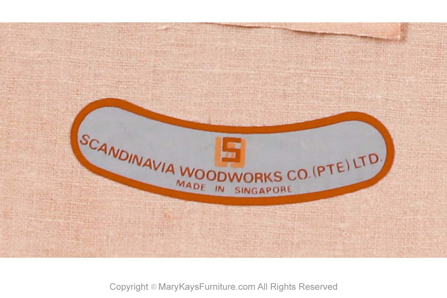 A set of three, extremely sought after, gorgeous 1960s, modern teak side/dining chairs by the Scandinavia Woodworks Co., made in Singapore. Featuring a matching set of three, each remains in original condition throughout. Features teak frames, with curved backrests, and padded seats, retain its original upholstery, with stunning wood grain throughout. They remain in good vintage condition and are comfortable. The rich solid teak frames are very sturdy and have exceptional stunning wood grain throughout. The sculpted and formed details is what makes them so desired, very modern and elegant. Underside of chairs marked with Scandinavia Woodworks Co label. The set would look amazing around a dining room table, or as side chairs. Also, available matching Danish Modern teak Dining table (sold separately). nCondition Report: Original finish wear consistent with age and use, overall gorgeous surface condition. Construction is strong and sturdy. Original woven “creme” upholstery. n n nManufacturer: Scandinavia Woodworks Co. nIn the Style: Scandinavian Modern, Mid Century Modern nPlace of Origin: Singapore nDate of Manufacture: circa 1960s nPeriod: 1960-1969 nMaterials and Techniques: Teak, upholstery nCondition: Very Good nWear: Wear consistent with age and use. nMeasurements: 19 1/8_ wide x 19_ deep x 33_ tall (seat height 18_) n n