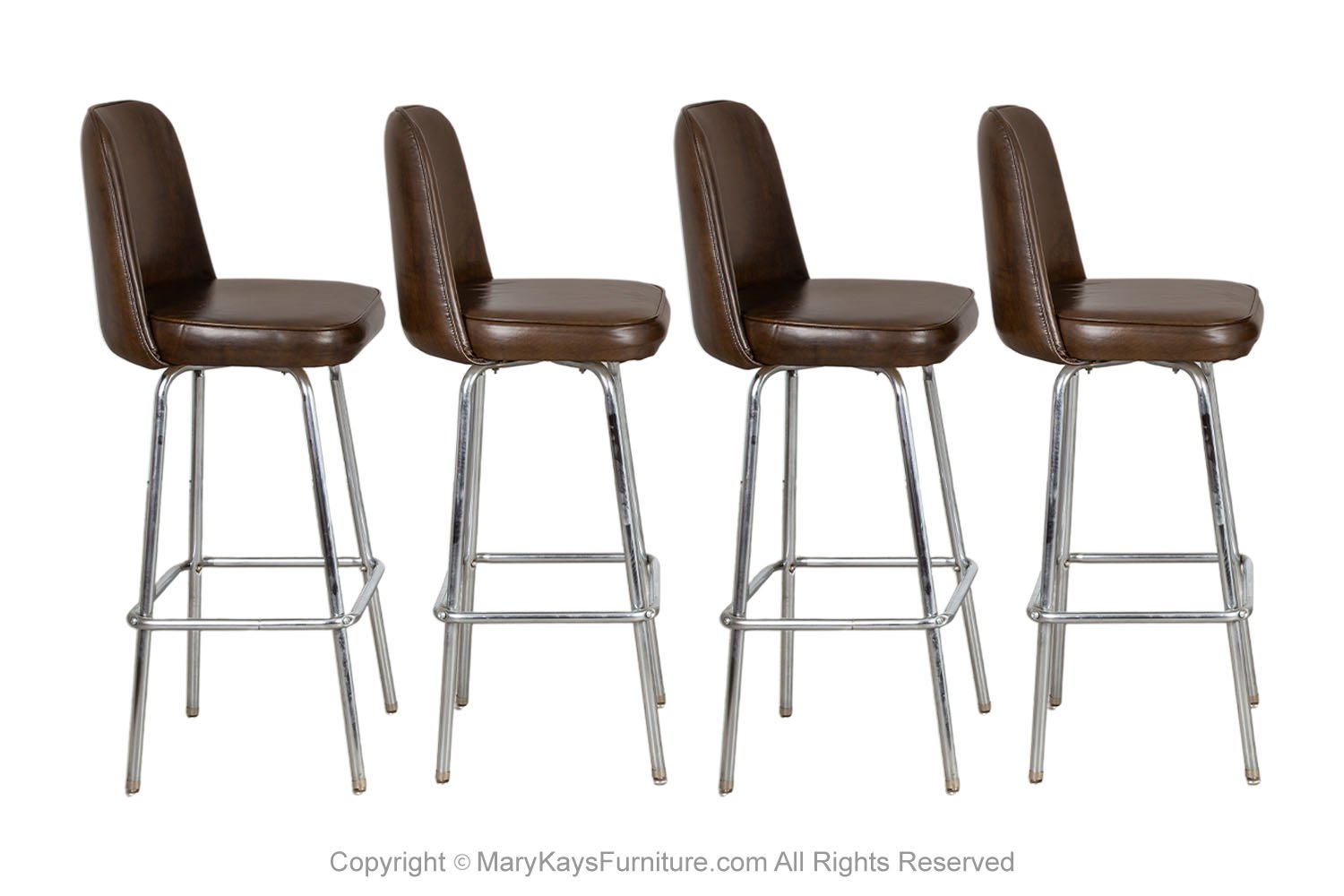 A beautiful set of four mid-century modern bar stools circa 1970s. Each with a high back, padded backrest and swivel padded seats made of vinyl upholstery in a dark brown color. The stools are raised on sturdy metal frames with footrests. Beautiful, shapely barstools, stunning examples of mid-century design elegance that will blend perfectly with countless décor genres. nCondition Report: Sturdy, tight joints; upholstery shows minimal wear, original finish, minimal oxidation. Overall gorgeous surface condition. n nStyle: Mid-Century Modern nPlace of Origin: USA nDate of Manufacture: circa 1970’s nPeriod: 1970-1979 nMaterials and Techniques: Vinyl, Upholstery nCondition: good vintage condition nWear: Wear consistent with age and use nMeasurements: 42_ tall x 17_ deep x 17_ wide x seat height 30_ n n