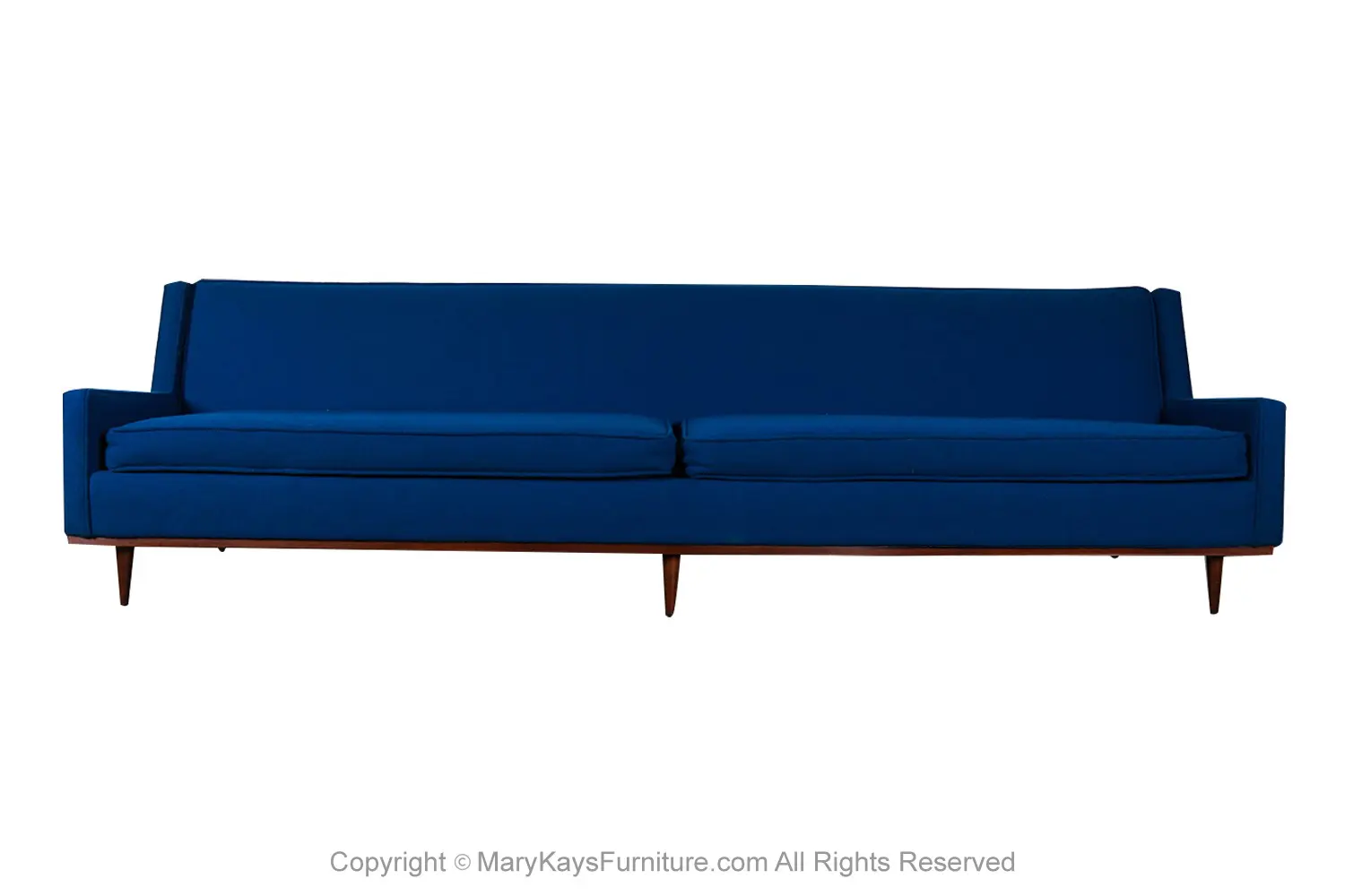 A very attractive two-seater sof Milo Baughman for Thayer Coggin style. This is a fine example of Baughman’s early 1950s work. Distinctive early mid century modern design shows Danish influence. Features original electric cobalt blue upholstery, two removable zippered seat cushions that are well intact. The tight back and clean modern lines give this sofa a sleek silhouette. The six tapered legs and wood frame are sturdy and supportive. This is a timeless piece that will add elegance and sophistication to a myriad of décor styles.